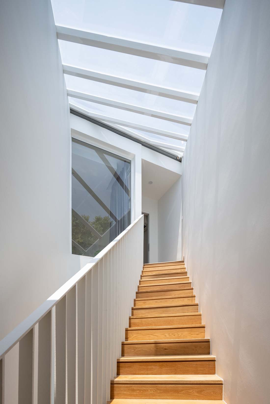 Translating to the interior, the internal spaces waste nothing, which is most apparent in the staircase design. The stairs do not follow a typical vertical flow, but rather manoeuvre to different locations on each floor to use space that would otherwise be awkward or unusable.