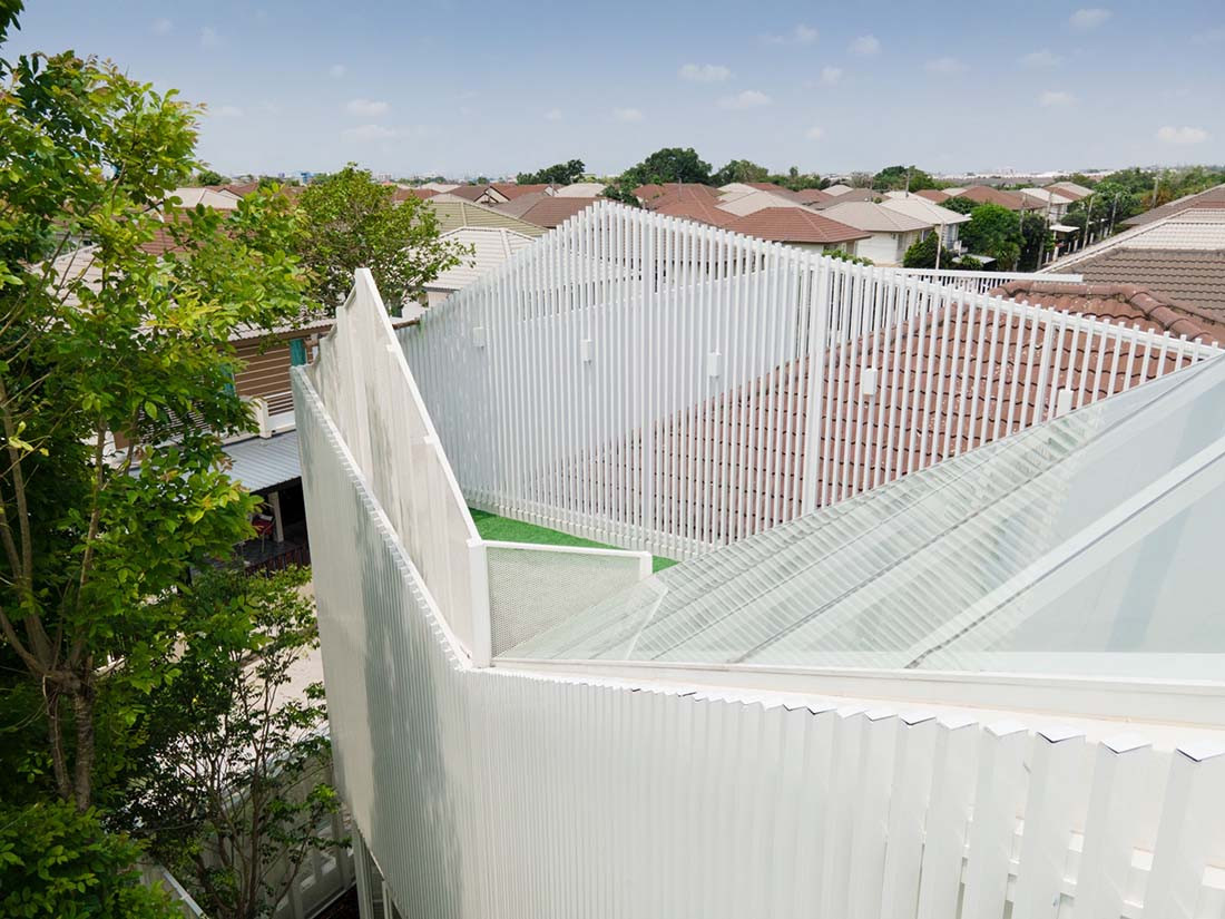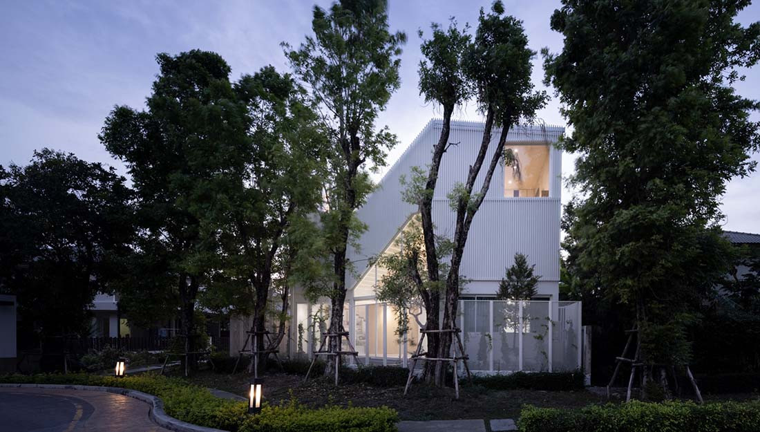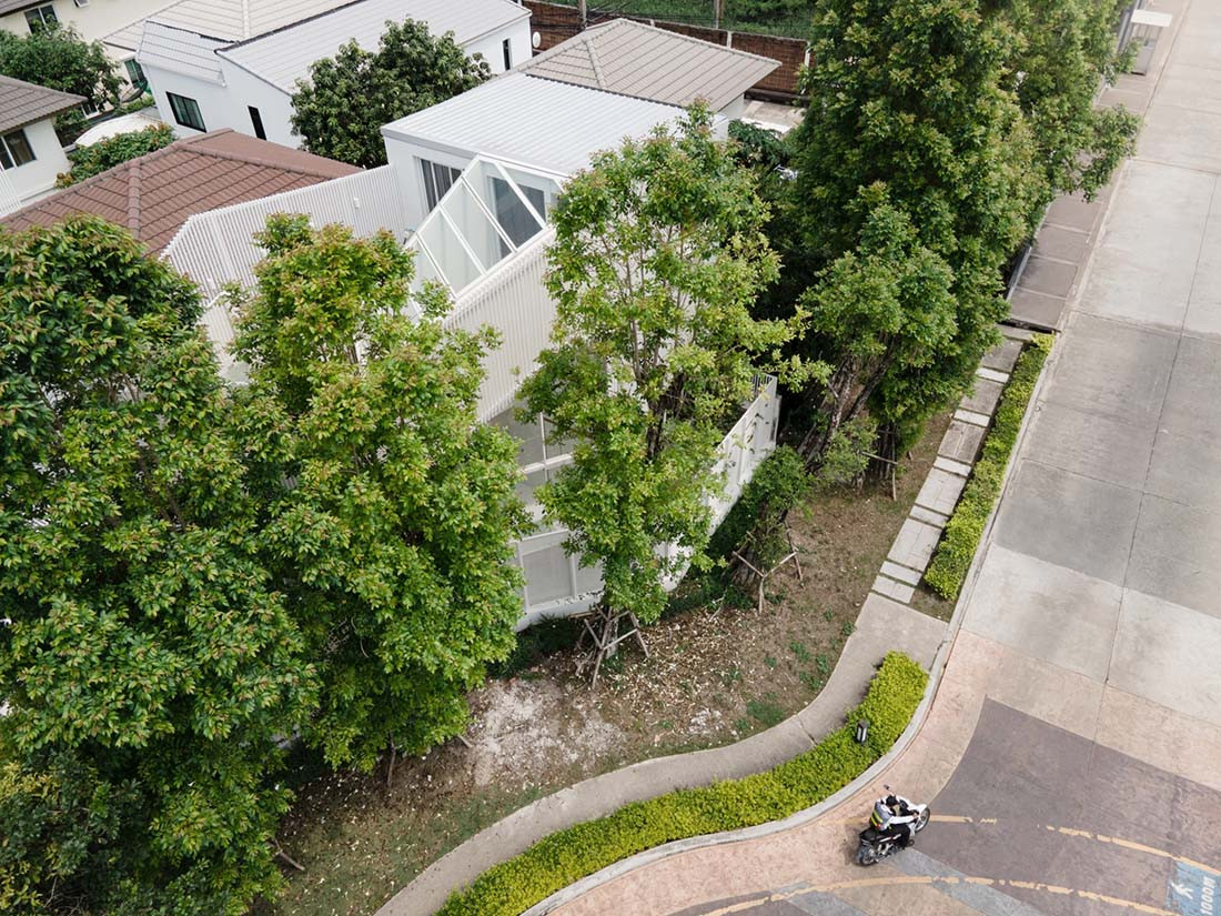 Positioned on a corner block within a housing development in Bangkok, Thailand, House Cove(r) takes advantage of the unused garden area to insert a three-storey addition to this family home.