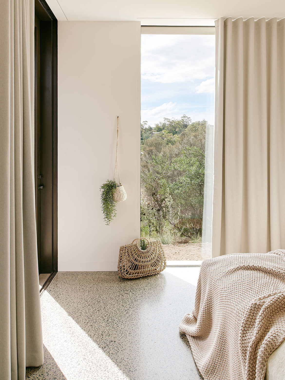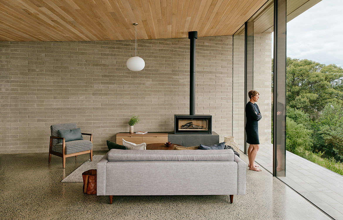Elements of the external material palette, such as the masonry and timber, continue inside. Concrete floors act as thermal mass boosted by underfloor and woodfire heating. The latter also helps with fuel loads in the site. The colours are kept neutral and pared back, not wishing to distract from the natural beauty of the area.