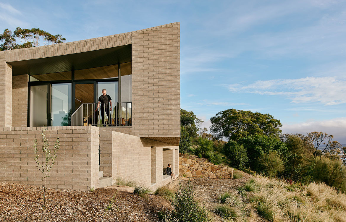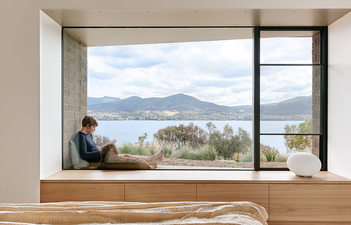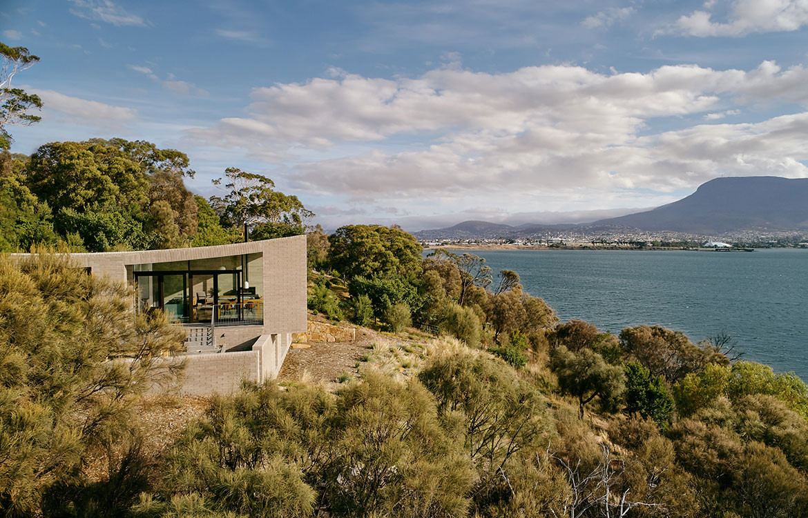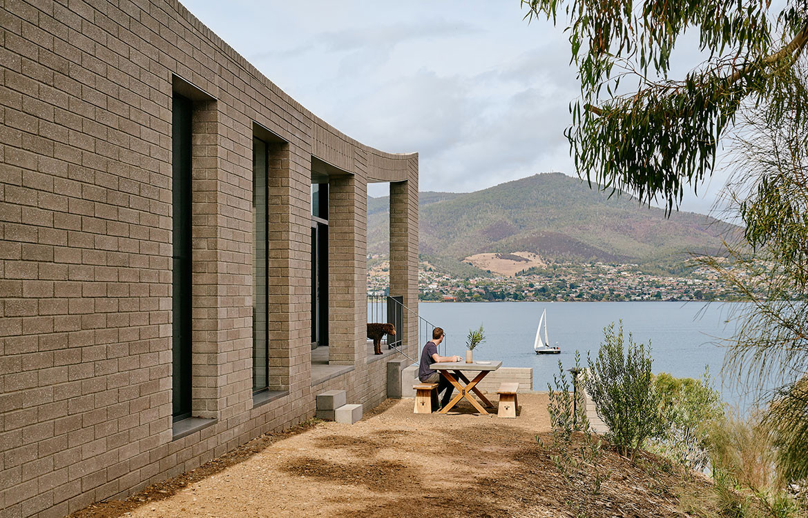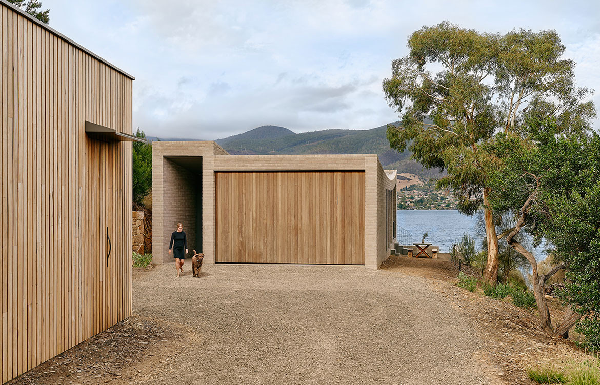 The House at Otago Bay by Topology Studio is located on a bend in the Derwent River in Tasmania. It is set back from the road and purposely humble on approach: the brick and timber façade is simple in shape and materiality and, while it appears to be a single story, a second, lower level was achieved by following the descent of the hill. Furthermore, the house intentionally obstructs the view on approach, saving the true grandeur of the location for a later reveal. This creates drama as you move through the residence.