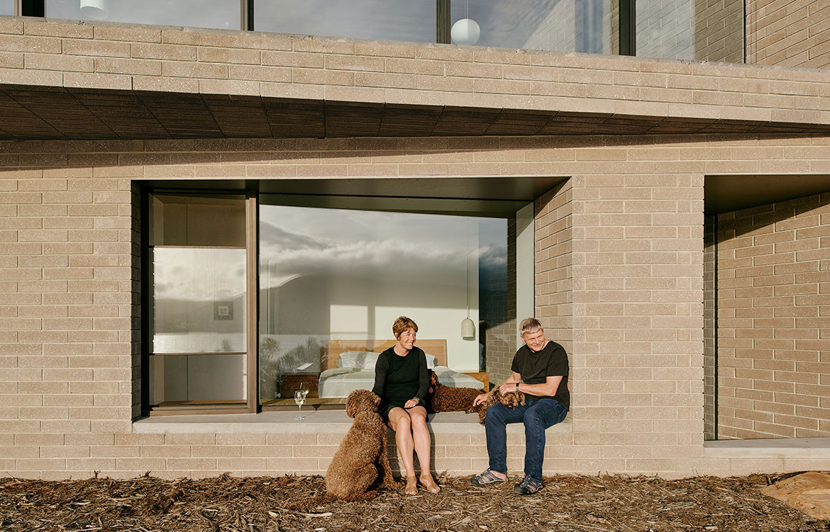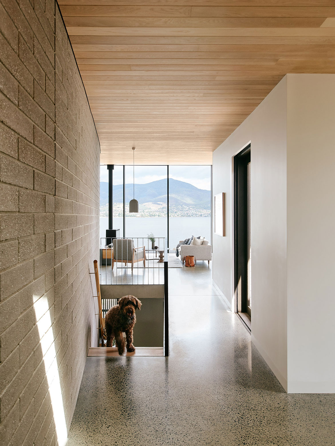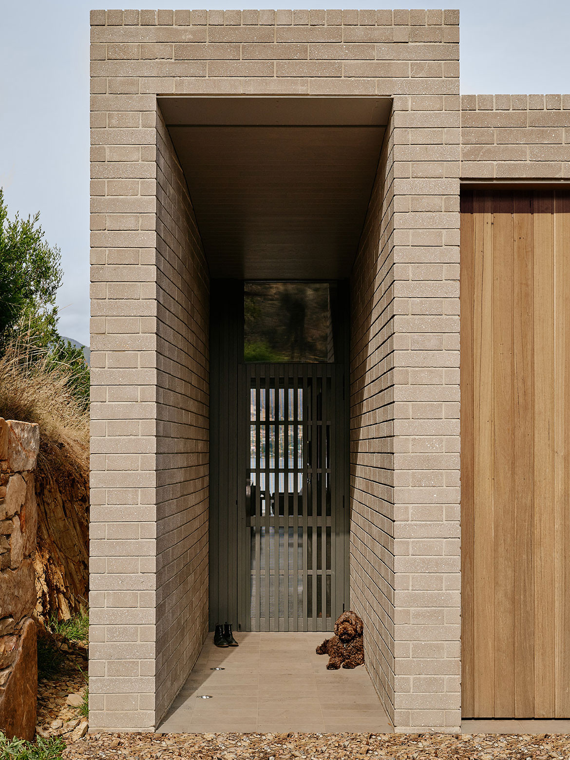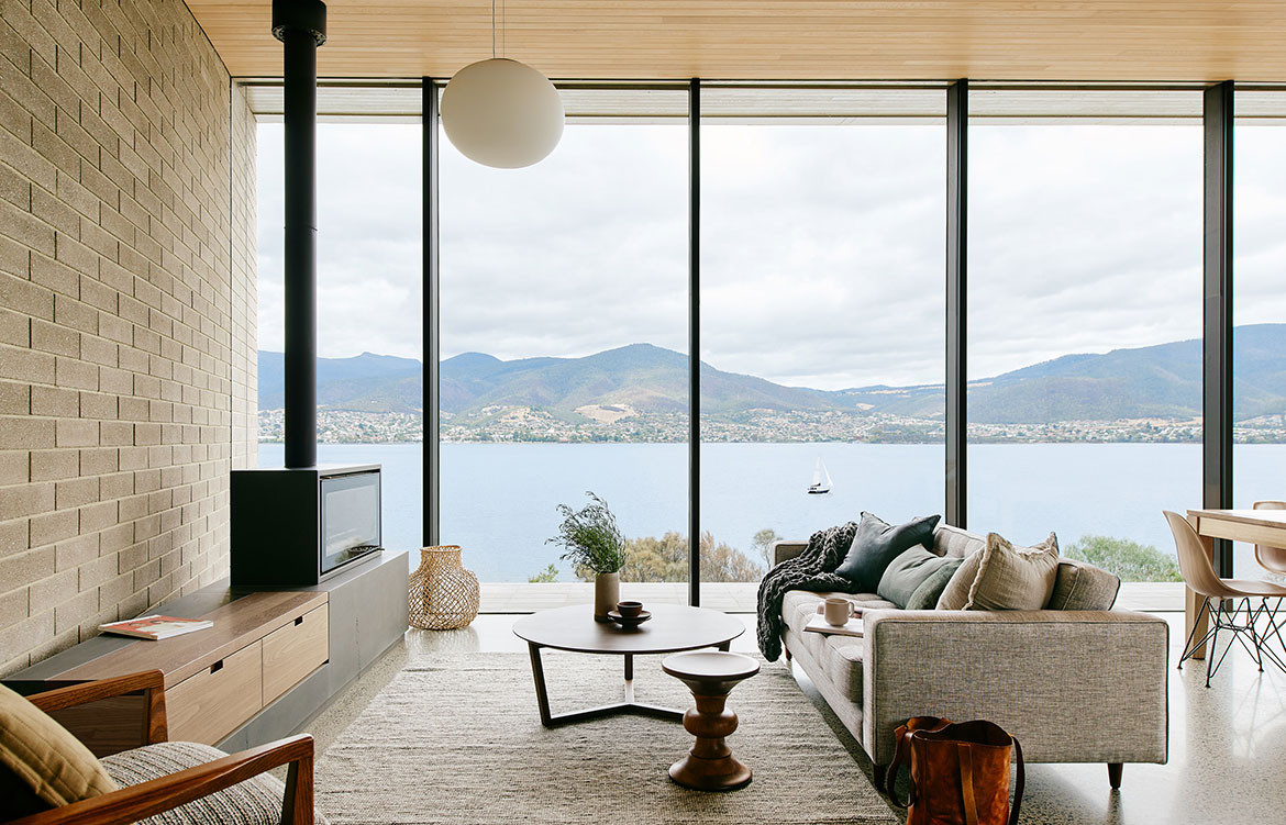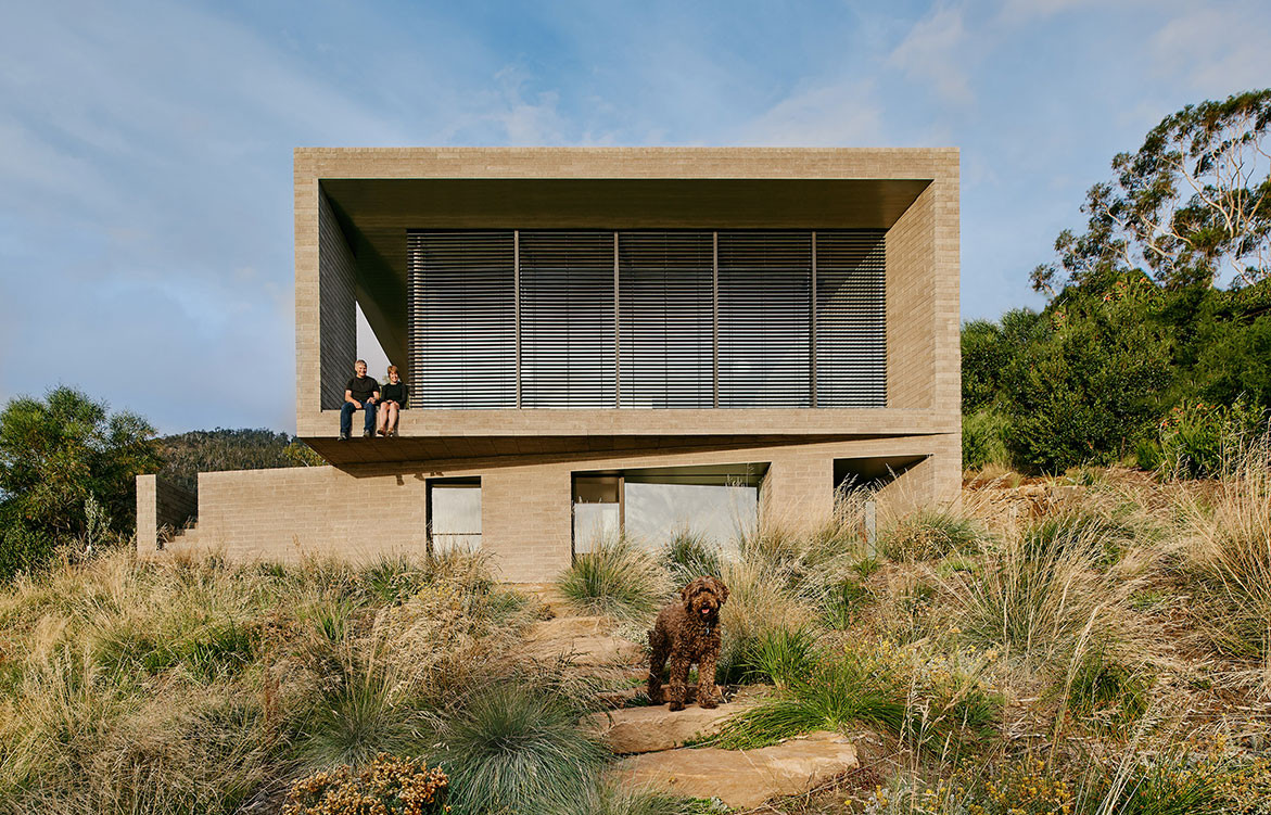 The House at Otago Bay by Topology Studio is located on a bend in the Derwent River in Tasmania. It is set back from the road and purposely humble on approach: the brick and timber façade is simple in shape and materiality and, while it appears to be a single story, a second, lower level was achieved by following the descent of the hill. Furthermore, the house intentionally obstructs the view on approach, saving the true grandeur of the location for a later reveal. This creates drama as you move through the residence.