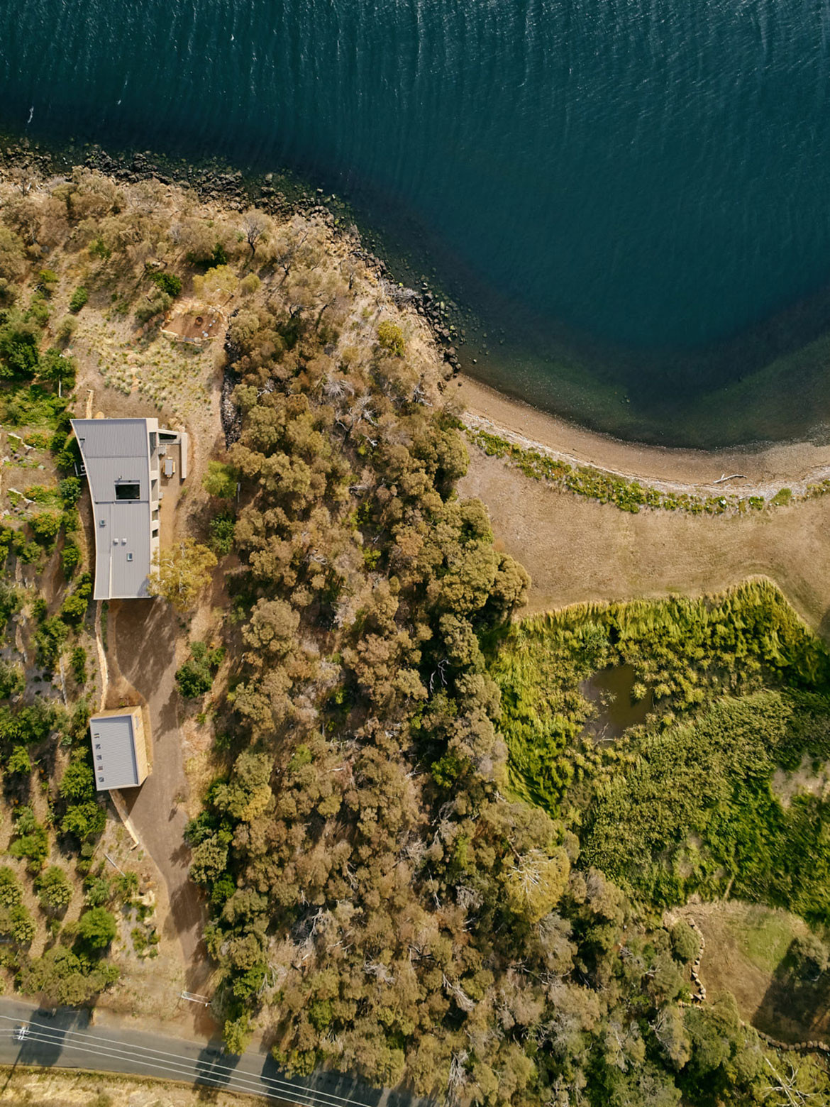 Beginning outside, an understated entry forecourt is formed between the house and the boatshed. As you move through the internal spaces, the house physically and visually opens up. Built along an east-west curved spine wall, the roof curves up at either end and the western wall at the far end of the property is floor-to-ceiling glass, featuring expansive, uninterrupted views across the water and as far as Kunyani, Mount Wellington.