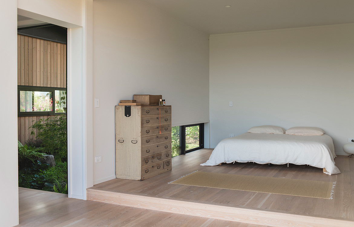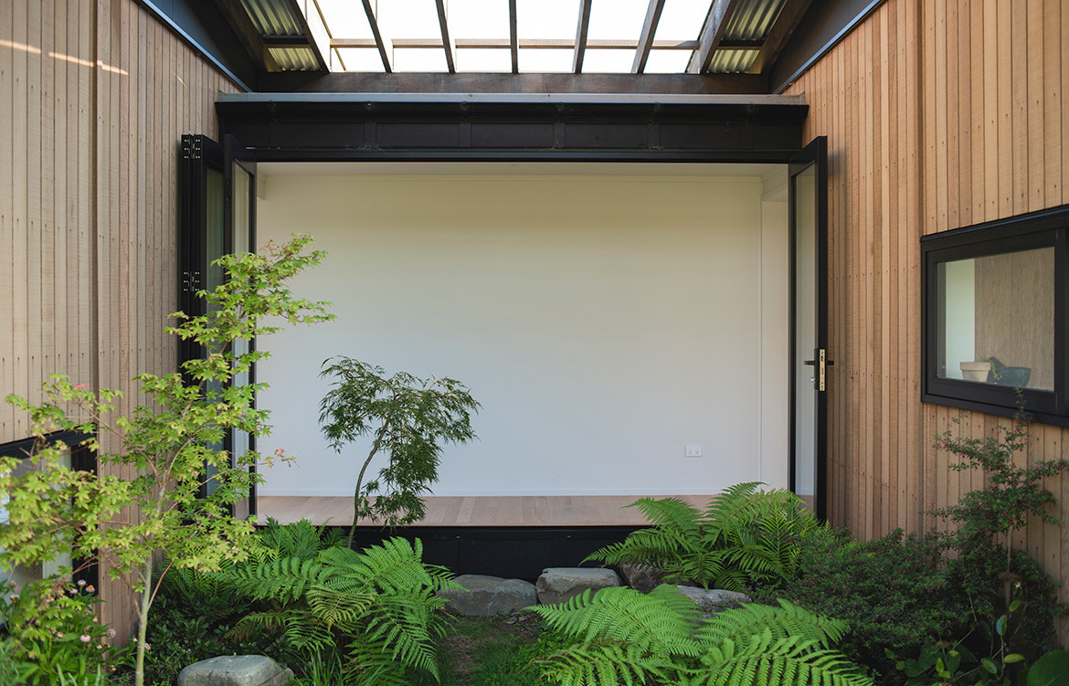 Ironically, the rural subdivision covenants required a minimum floor area of 140 metres squared, which worked against a small footprint. However, Andrew designed a low-profile, two-bedroom house to this minimum by combining two strong traditions into one – the Japanese courtyard house and the Modernist box. Open and closed, crafted and machined, cool abstraction and the every day, it is an approach that has given the house equal measures of efficiency and poetry.