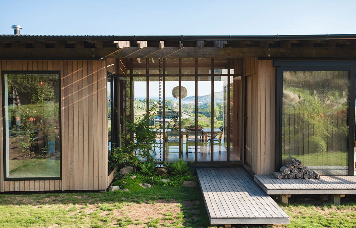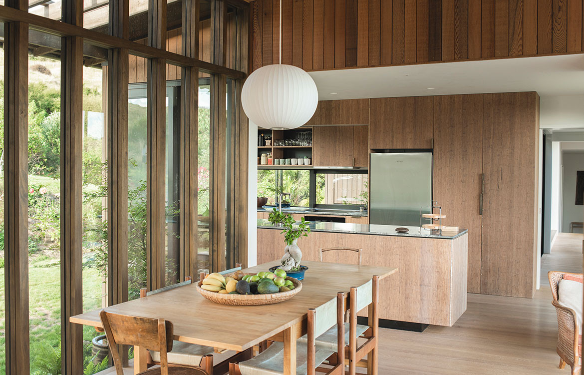 With a wide, open site catching views to the south and sun from the north, Andrew unravelled the Japanese courtyard house plan to translate it into a linear form. The region’s hot summers and stormy winters made the wide Japanese eaves appropriate for the local climate. The eave is also favoured for its ability to blend the inside with the outside.