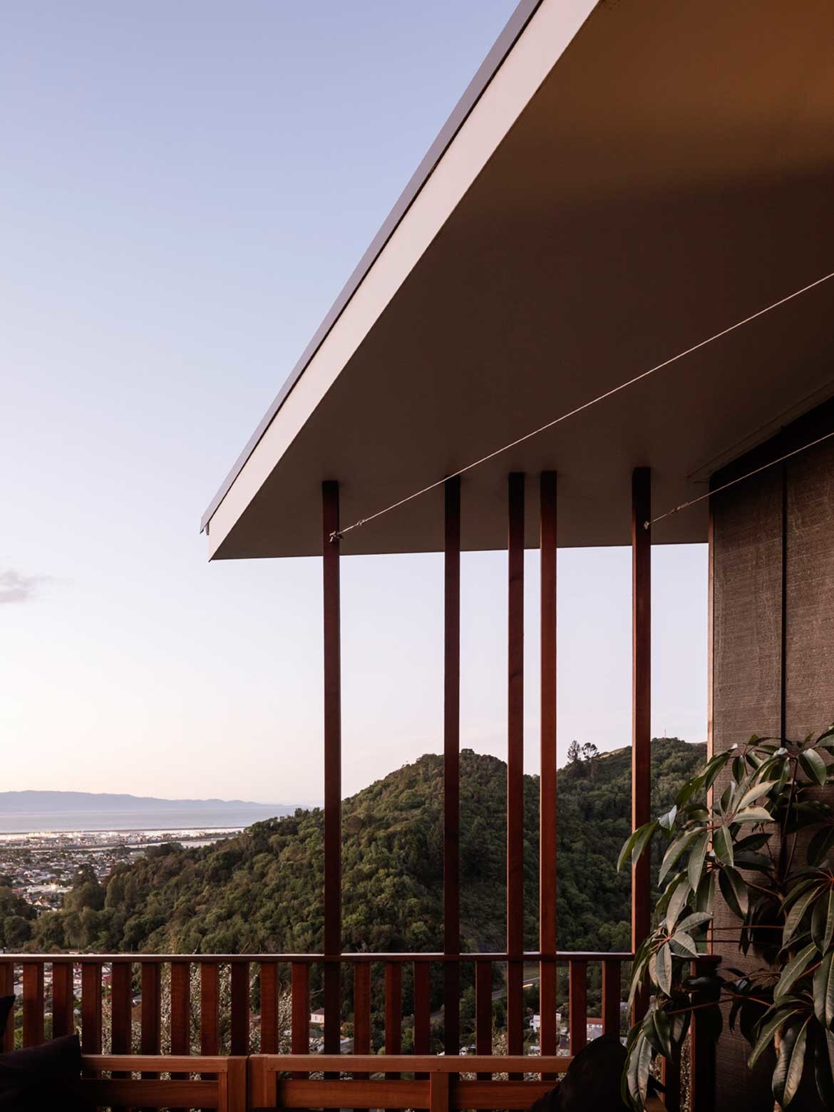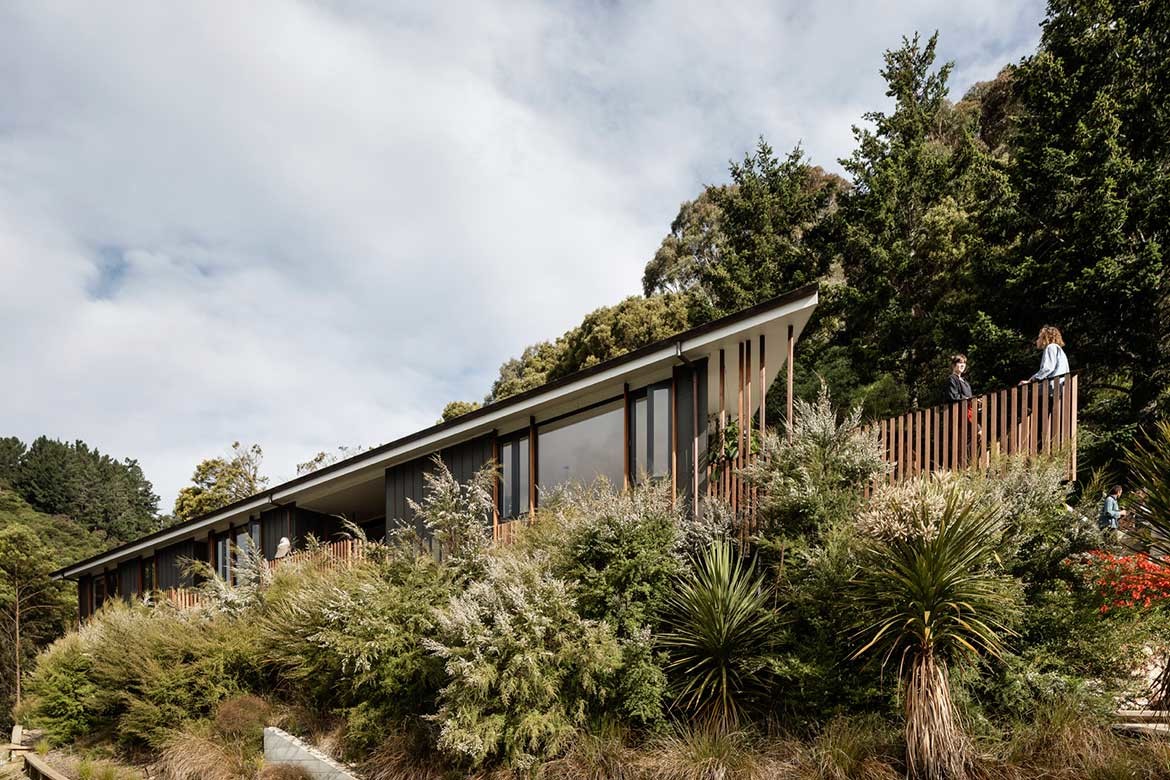 Located near Nelson on the northwest of New Zealand’s South Island, Feather House rests on the top of a hill surrounded by landscape with views of the town and ocean. The form is elongated with tapering ends – a feather shape – and there is a layering of materials and lapped-cladding with copper tips, hence its name Feather House.