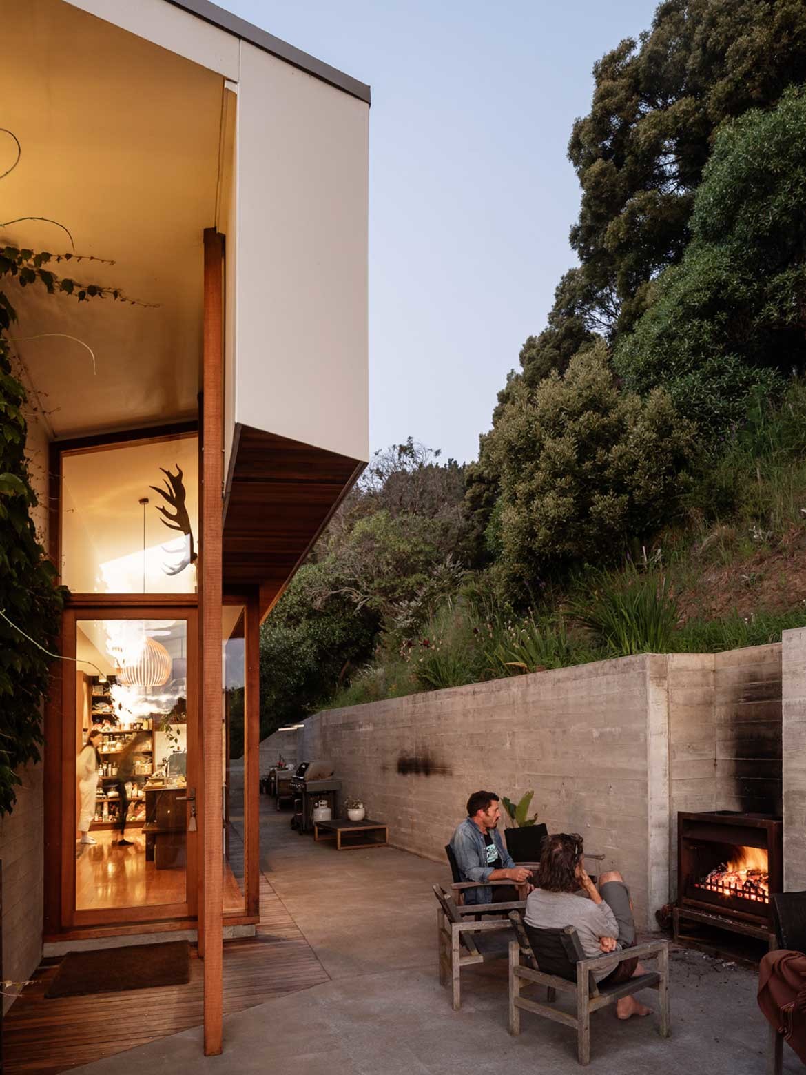 The colour palette is informed by the materials and the landscape, with a recessive white base, warm timber hues, concrete grey and accents of black that help define spaces and encourage a relaxed and welcoming environment. The exterior of the home blends with the natural surroundings, however the design ensures that it is also a distinctive form in itself.