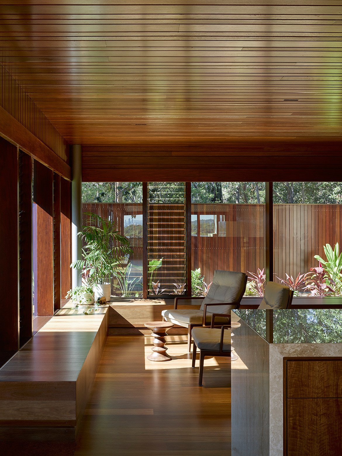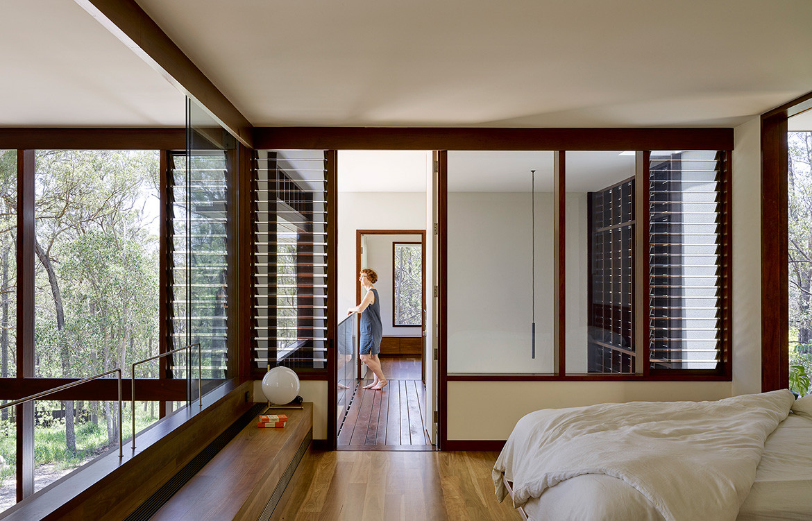 The J&J Residence is located in Chandler, an outer suburb of Brisbane and one of the city’s most expensive areas. The 50×200 metre site, which sits on the edge of a remnant Eucalypt forest, looks west to the city and enjoys a mountainous backdrop. Where its neighbouring blocks are significantly larger (some, four times the size), J&J Residence remains humble in footprint. Yet the architecture by Hogg & Lamb, which has offices in Brisbane and Northern New South Wales, is no less impressive for it.