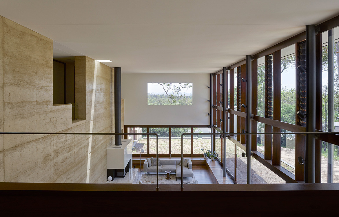The house consists of two L-shaped plans divided by a monumental rammed earth wall that runs down the centre. The arrival side faces south west, with views toward the city. The main progression once inside is though the feature wall to the double-height, open plan living side. Comprising the kitchen, dining and lounge area, this side of the residence faces north east.