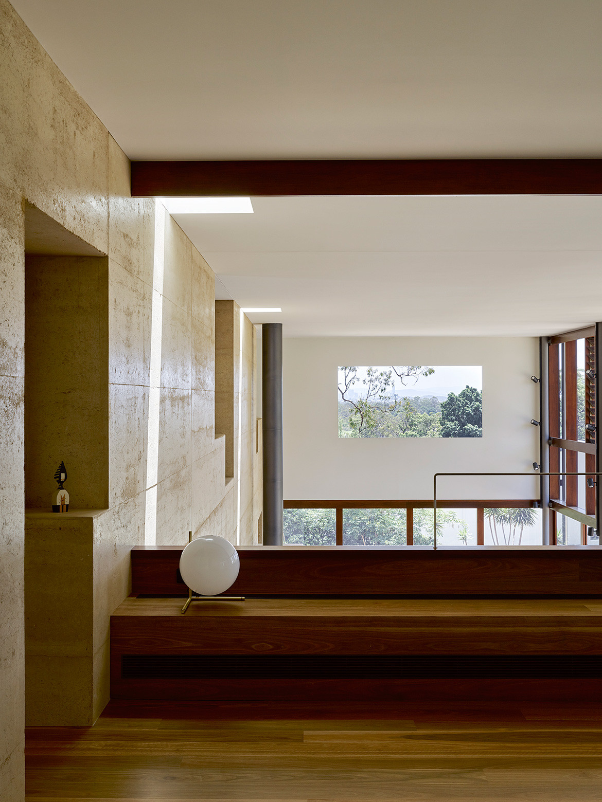 The guest bedrooms and stairwell occupy the south side of the upper floor, while the main bedroom, ensuite and a reading room are on the north side. Hogg & Lamb have designed it in this way so that the residents are constantly moving through the rammed earth wall. And at 400 millimetres thick, you can pause in the openings, to stand within the wall.