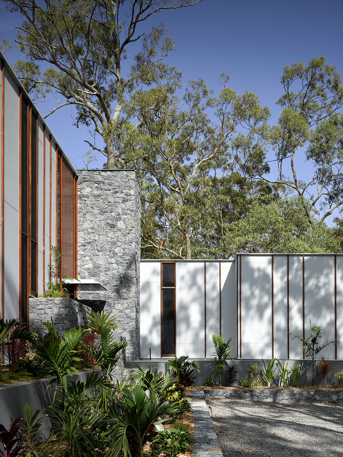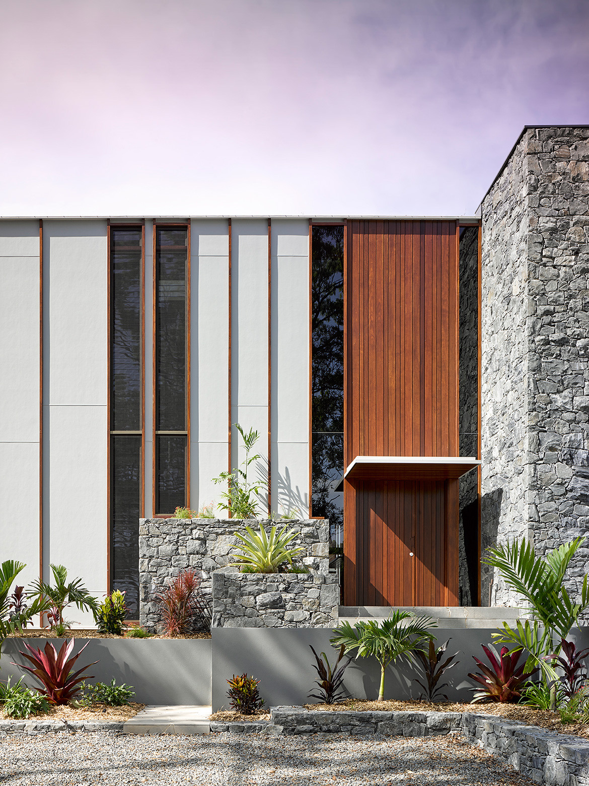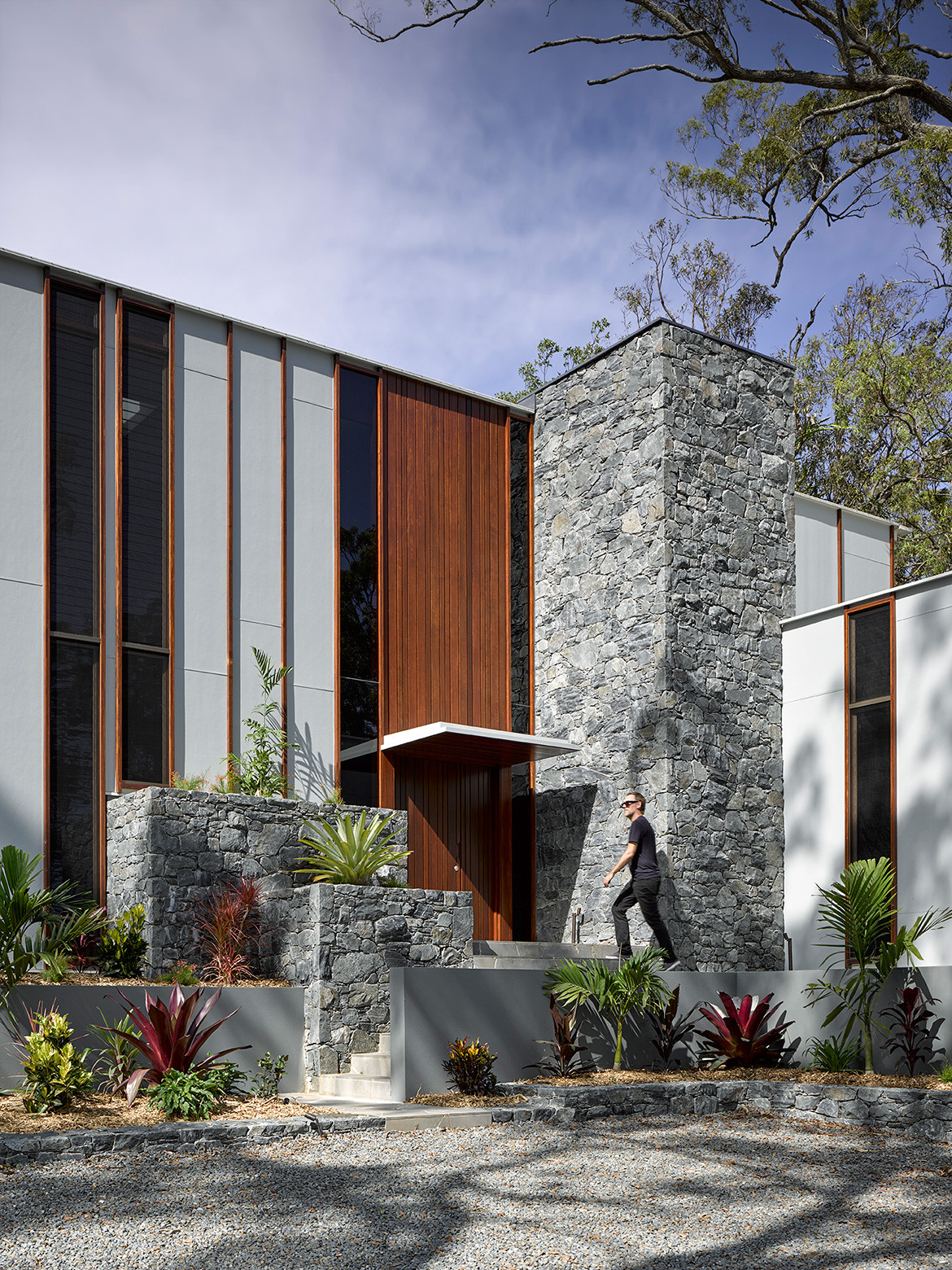 Hogg & Lamb located a supplier on the Sunshine Coast who was able to provide the material in a colour that matched the site. The wall continues beyond the building to recede gently into the landscape. As a result the wall, which is scaled to mirror that of the site, feels like it is an extension of the land and its bushy flora.