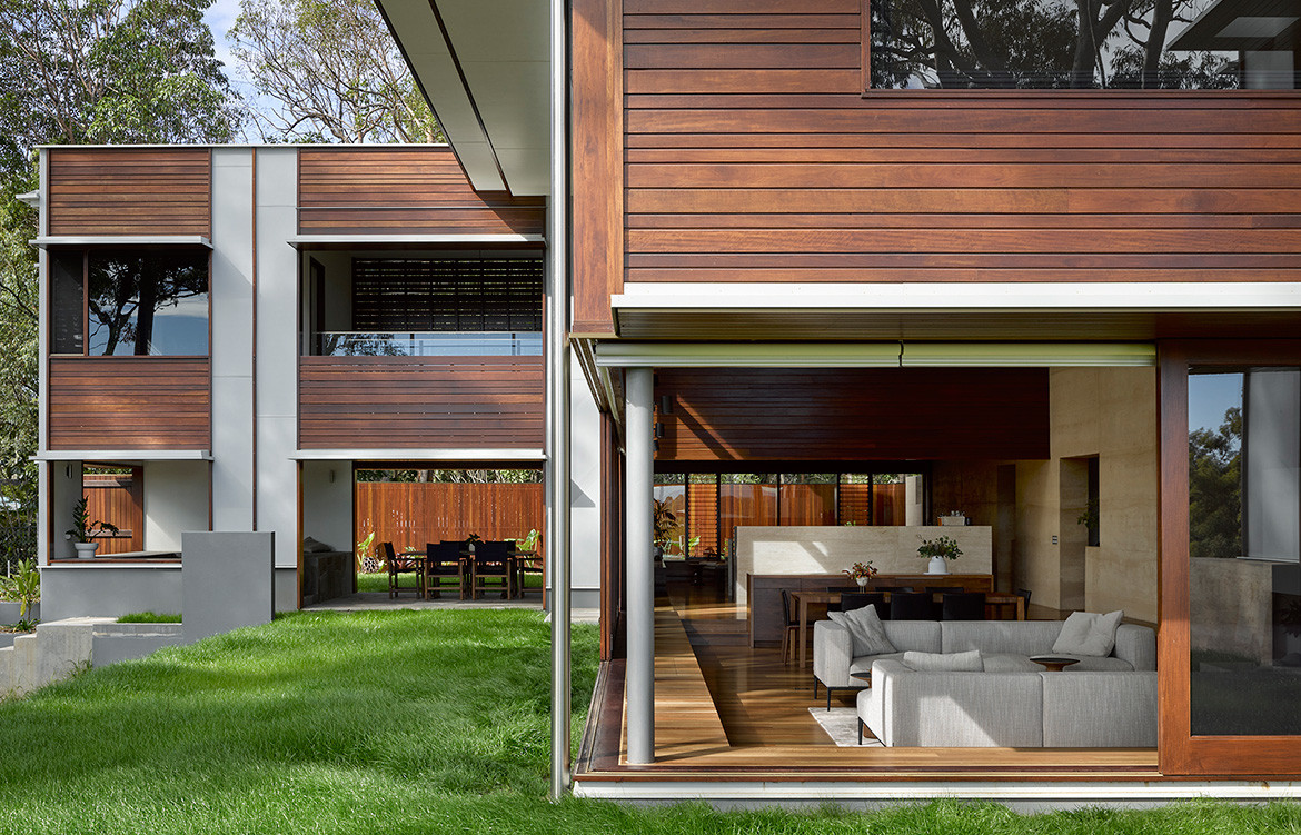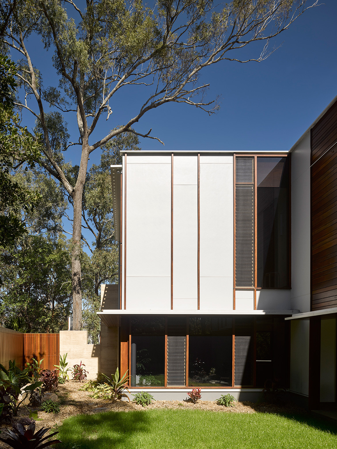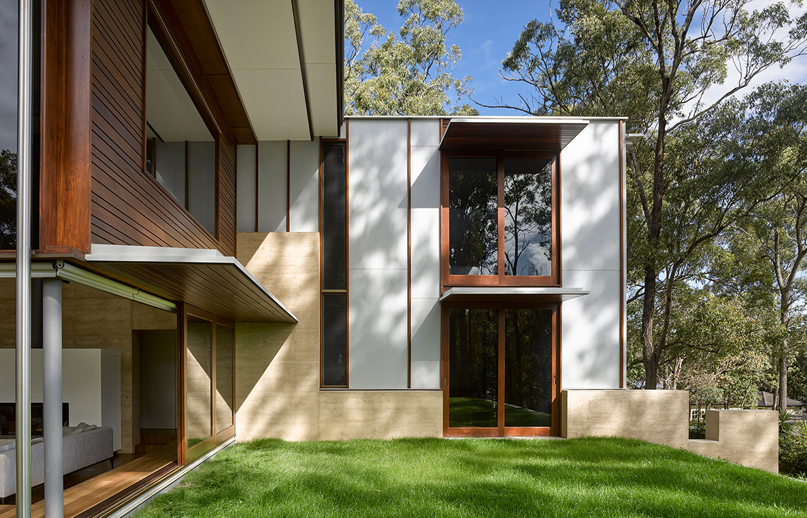 Hogg & Lamb located a supplier on the Sunshine Coast who was able to provide the material in a colour that matched the site. The wall continues beyond the building to recede gently into the landscape. As a result the wall, which is scaled to mirror that of the site, feels like it is an extension of the land and its bushy flora.