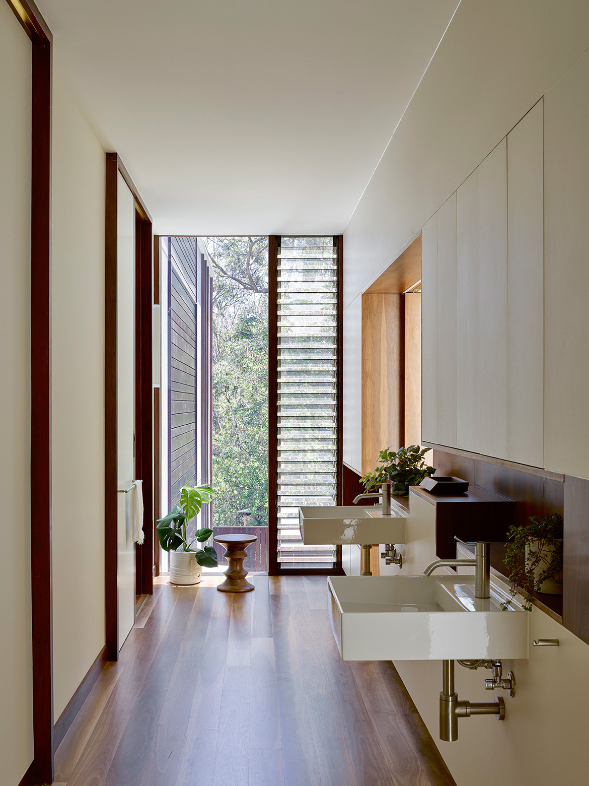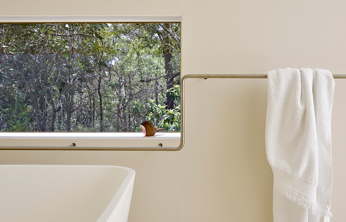 Upon arrival, the first thing you notice are the thin, vertical, recessed, double-height windows’ that appear as two-storey volumes. The rear of the house is in stark contrast, with large glass sliding doors allowing unobstructed views to bushy Eucalypt trees. This in direct response to the client’s wish to feel connected to the outdoors from anywhere within the house. A 2.4-metre overhang protects this side of the house from the sun when it is strong.