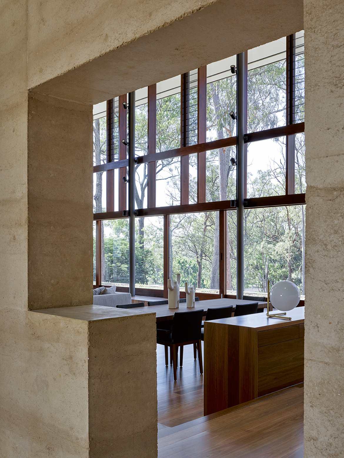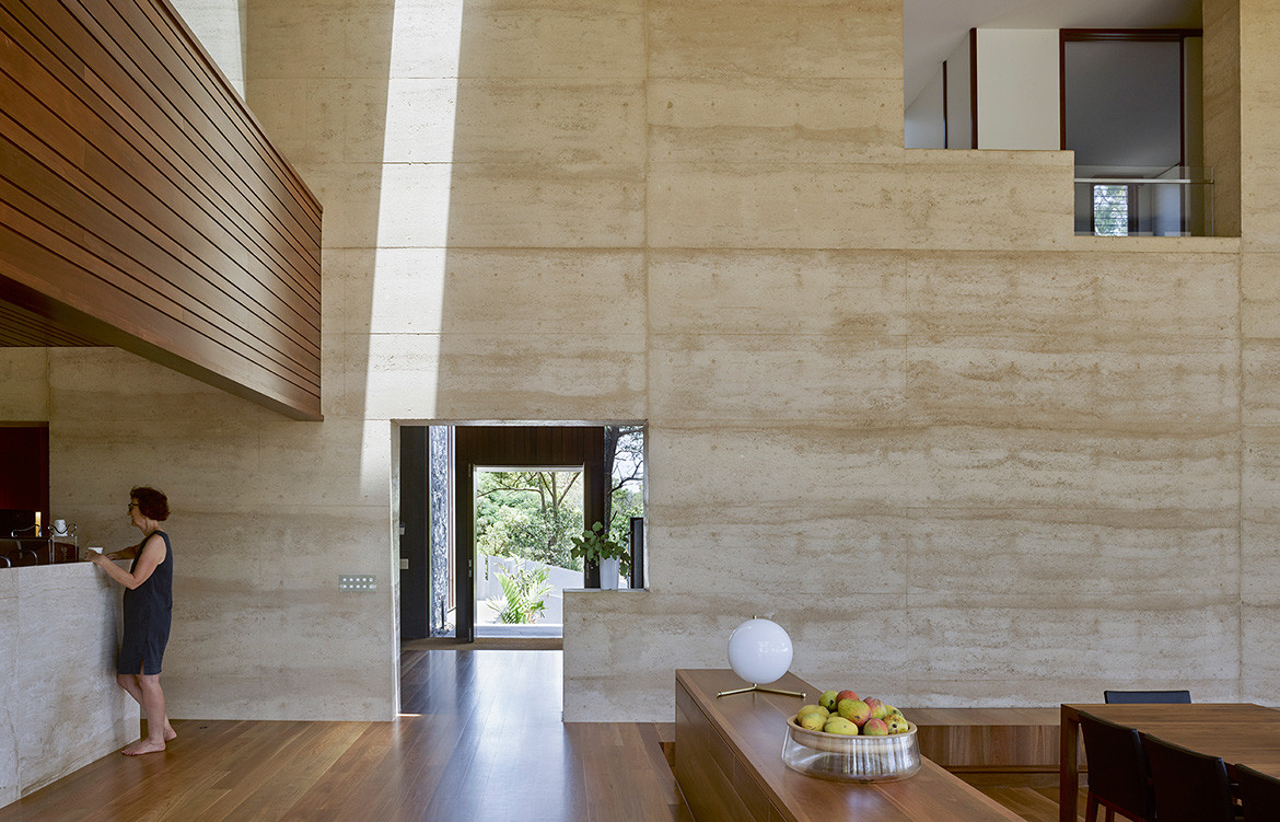 Previous to this project, Michael and Greg had not worked with rammed earth, and suitably did an extensive amount of research on behalf of the clients. To take full advantage of the passive design benefits associated with the material they designed in vertical internal ducts that run down through the thick rammed earth wall, connecting the roof to a sub floor ventilation system. This creates activated thermal mass that works passively yet consistently through the seasons to maintain an optimum internal temperature.