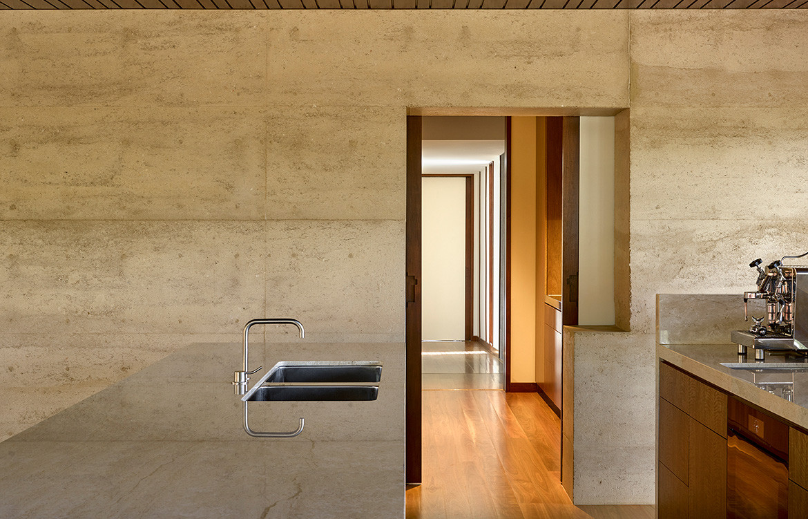 While the environmental performance of the J&J Residence is strong, the aesthetics of the house and experience living there isn’t at all compromised. In fact many of the client’s guests have mistaken the rammed earth for travertine (mirroring the solid block of marble used for the kitchen bench). An affinity between materials – predominantly natural: marble, stone, rammed earth and timber – was sought out by the architects and goes to show that there is no longer “one look” to sustainable design.