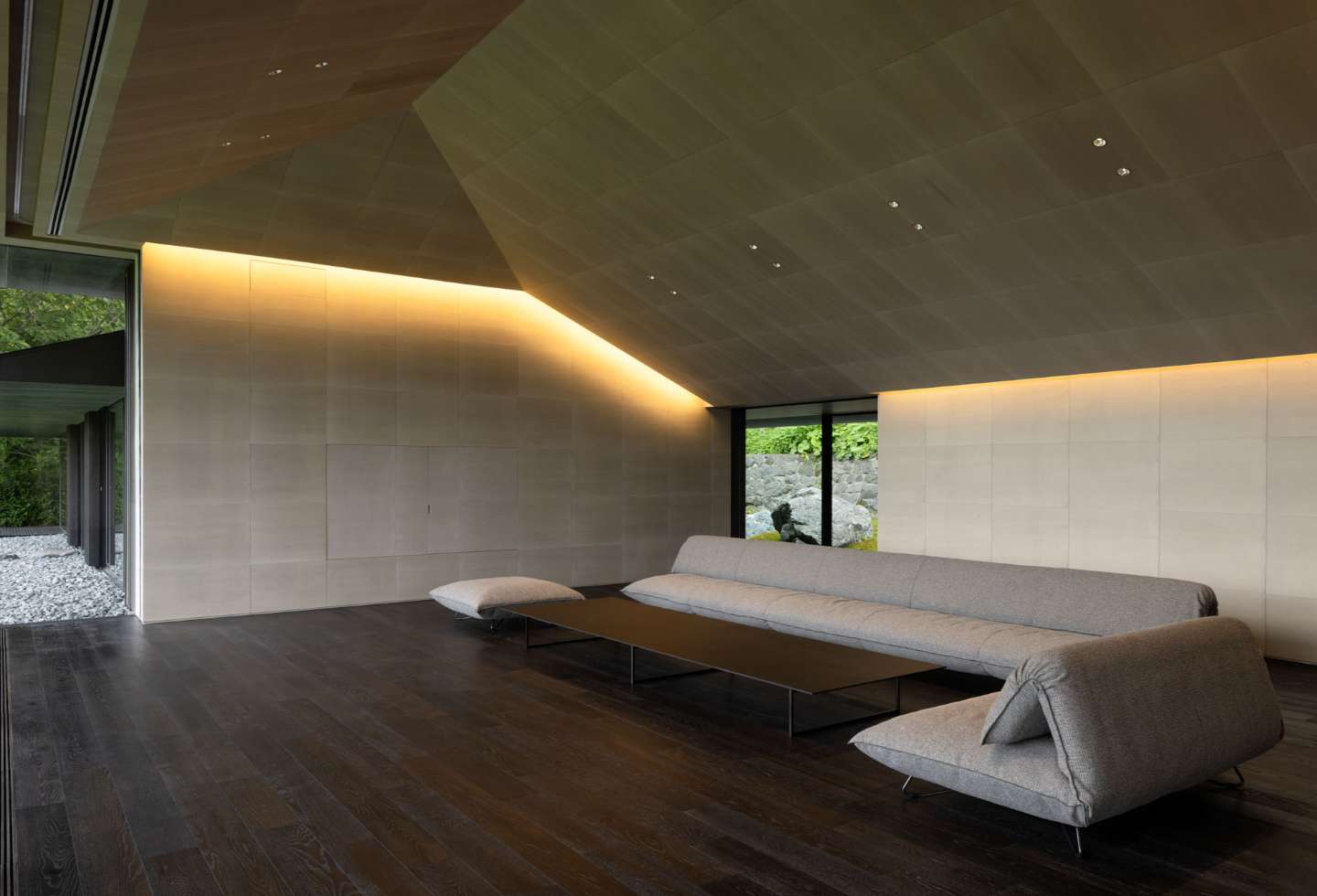 The rectangular format of the house sees all spaces positioned to face Mount Fuji through floor-to-ceiling glass windows that evoke shakkei, a Japanese traditional architectural term meaning ‘borrowed scenery’ (to visually incorporate an adjacent or distant exterior view into the interior).