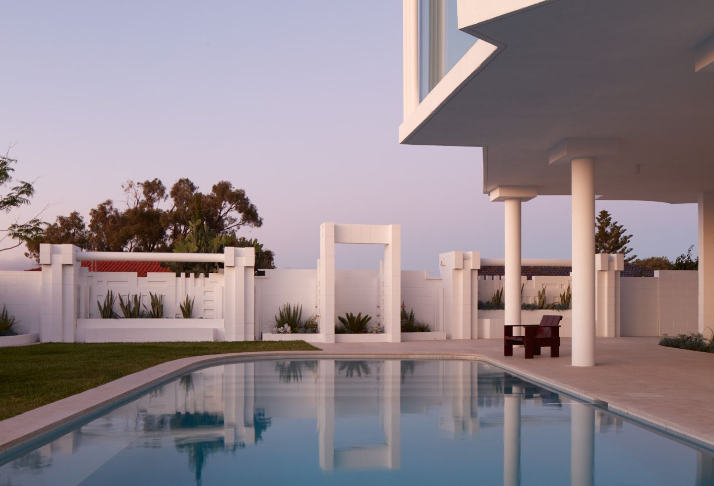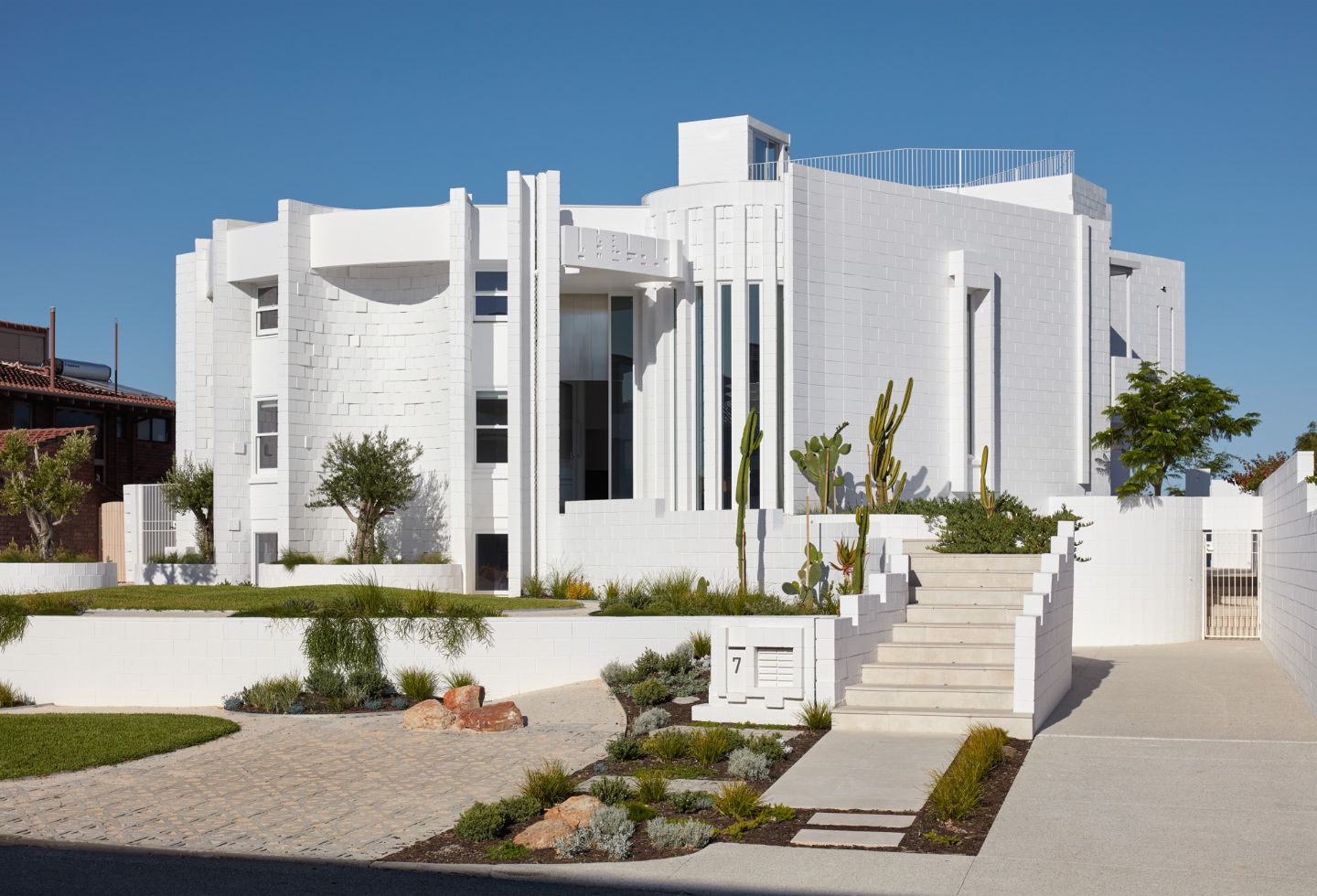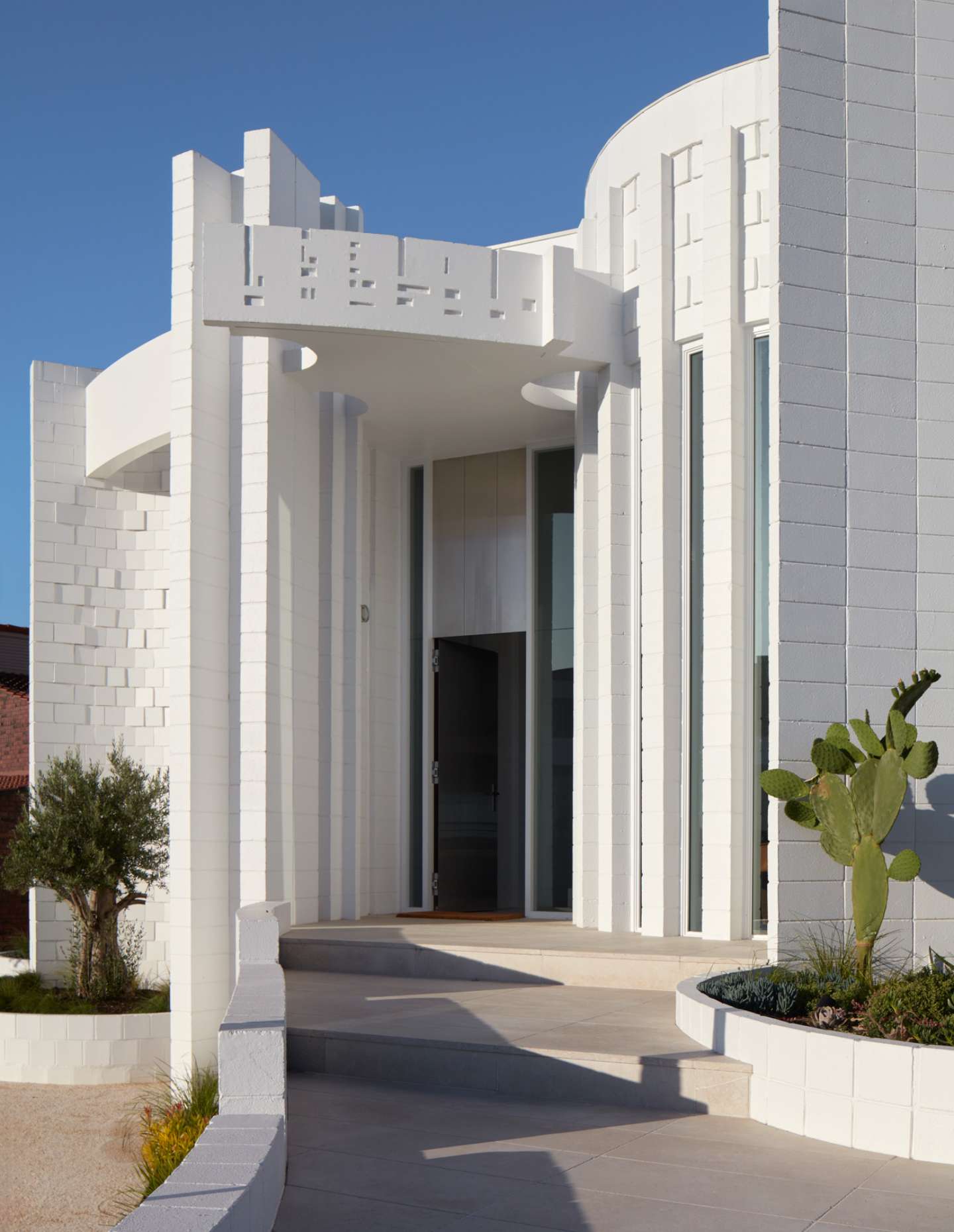 The restoration pays homage to Iwanoff’s style by selecting finishes, fittings, joinery, and details that are sympathetic to his original design. The new internal spaces resist competing with the flamboyant exterior built form; instead, they play a complementary and respectful counter role of mediation. The garden design allows for more freedom, featuring cylindrical forms and predominantly endemic Western Australian and Mediterranean plants, creating a landscape that is rooted in its location.