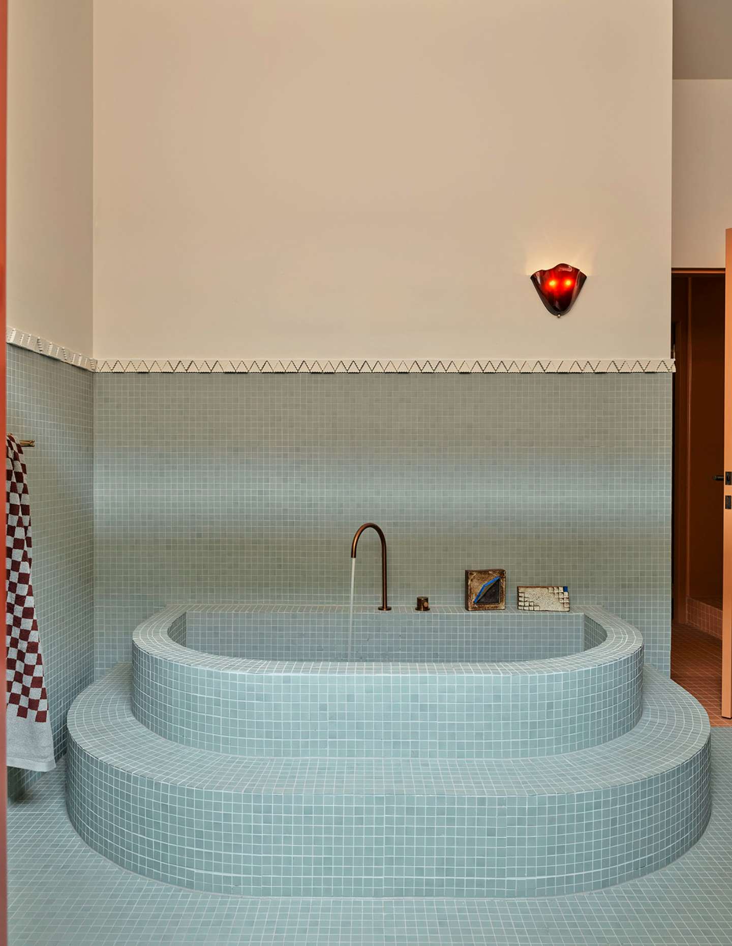 The curvaceous dining alcove, new semi-enclosed courtyard plus earthy external wall tone was inspired by Egyptian architect Hassan Fathy’s mud brick constructions.