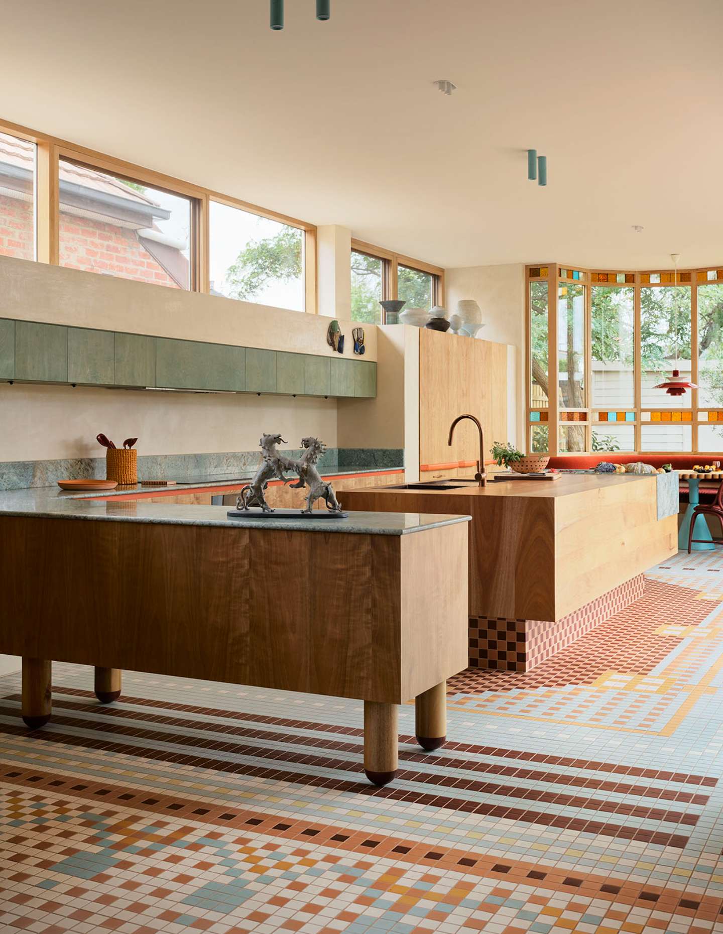Our clients possessed radically different design preferences. ‘He’ is Danish with an appreciation for pale timber, clean finishes and minimal ornamentation. ‘She’ is Egyptian- Australian, with a love of pattern, tactility and colour, which informed the Middle Eastern-inspired floors. Merging aesthetic inclinations, we intuitively explored rather than replicated design genres, selecting light Queensland Maple to align all new timber joinery in the new extension given its soft shade yet expressive woodgrain.