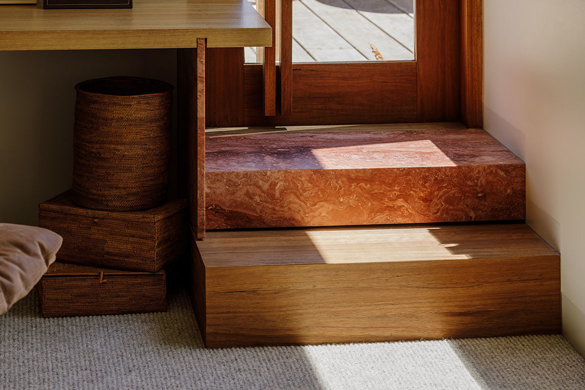 “Our clients were in agreement on most things. But when it came to the volume of spaces, one wanted higher ceilings, the other more intimate. This treatment suits both requirements,” says O’Sullivan. Other materials, such as the rosa and silver travertine used for the bathrooms and the fireplace in the lounge, also reappear in details throughout such as a singular tread leading to an outdoor terrace.