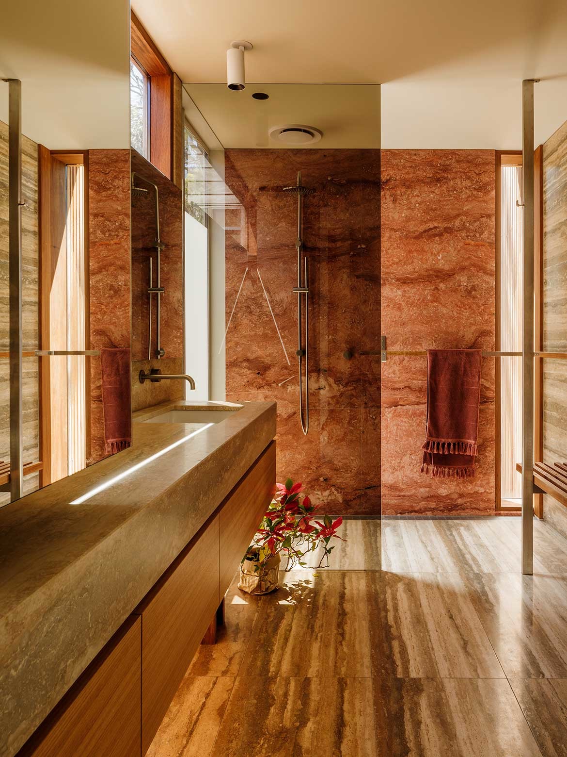 The bathrooms have been conceived not only around colours and textures, but also for practicality. A bench seat in bathrooms, for example, allows space for people to sit and change, as well as simply pause and reflect.
