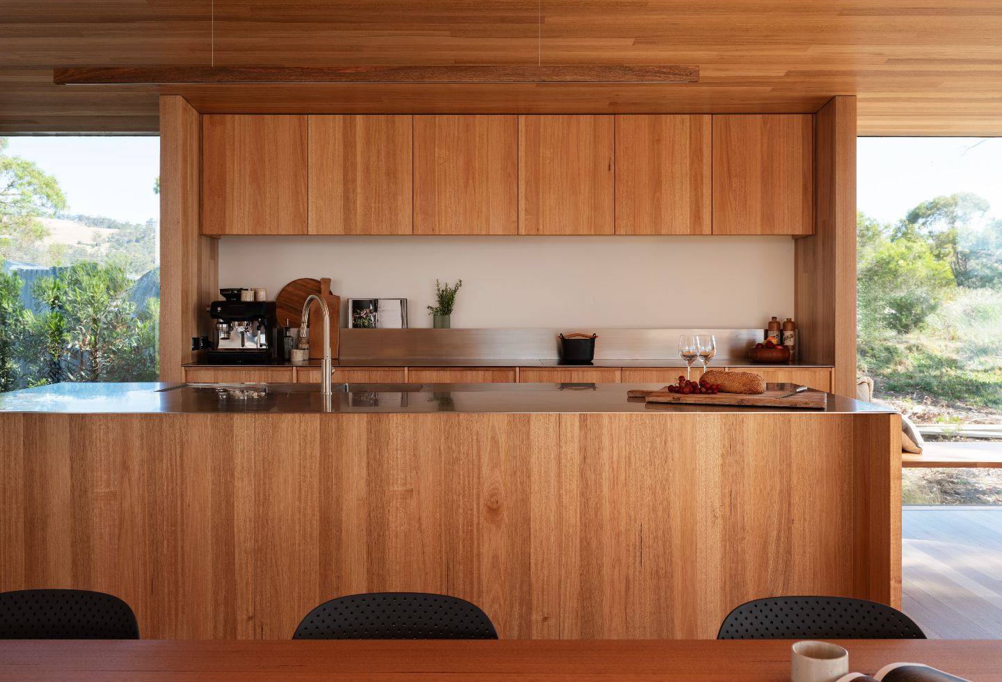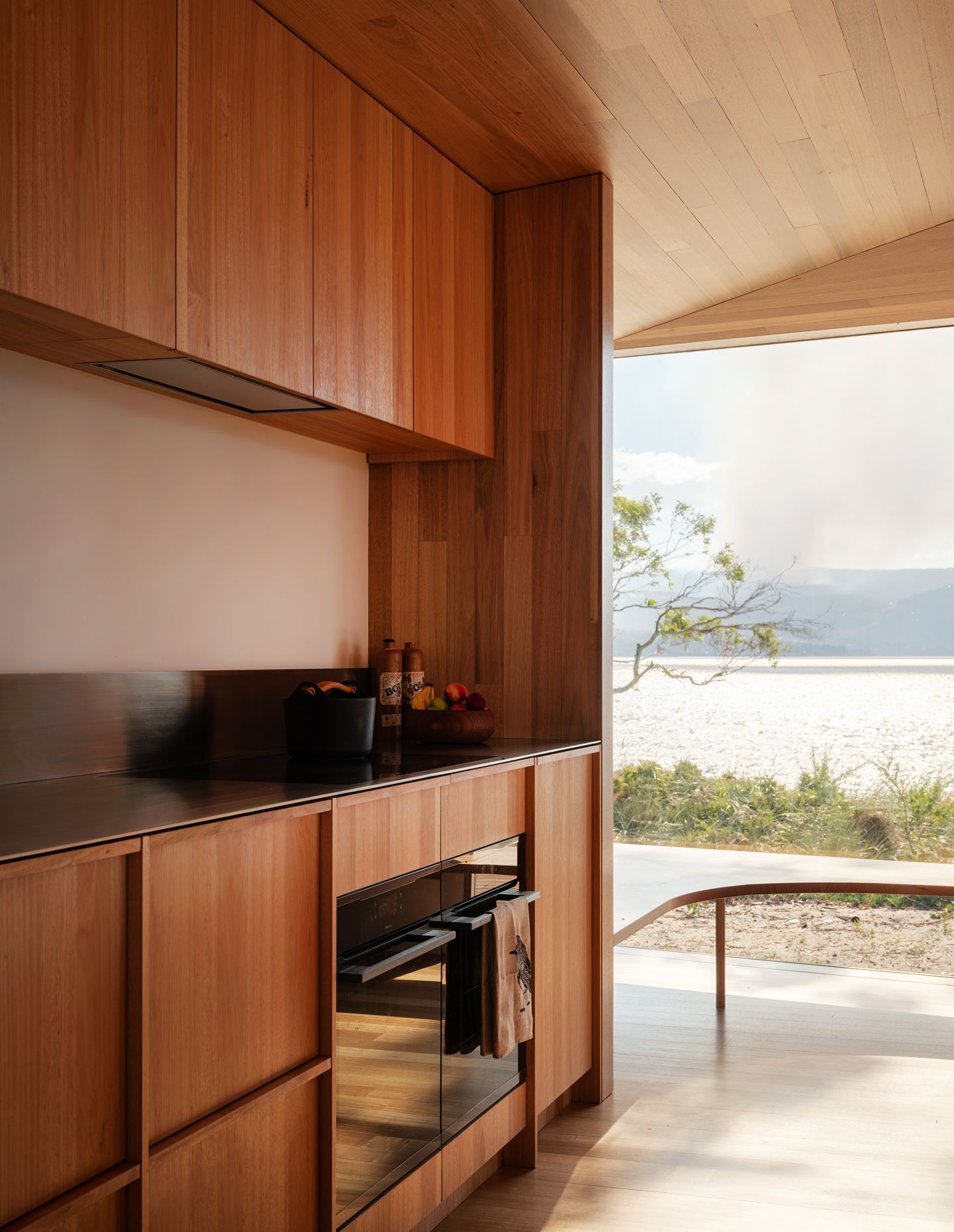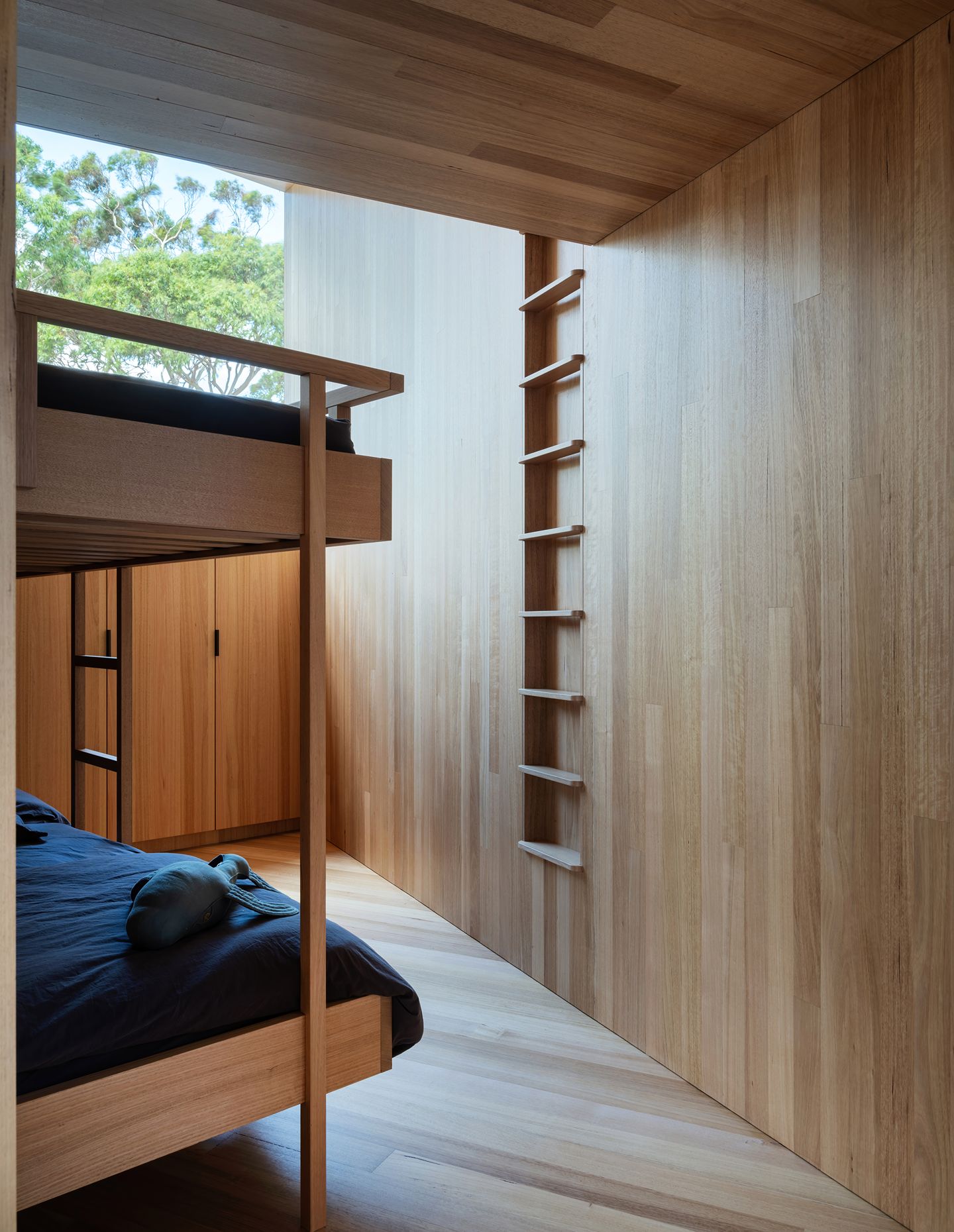 On the exterior, spotted gum cladding, decking, and windows provide a sense of continuity (and meet bushfire standards), extending into the interiors where Tasmanian oak walls, ceiling and floors meet. On the northern living room wall, off-form concrete panels anchor the home in the views and around the cast-iron fireplace. In celebration of its surrounding environment, custom Tasmanian oak joinery is featured throughout the kitchen, bathrooms, and bedrooms – including the bunk beds, which reach up into the angled ceiling cavity – evocative of a luxury camping cabin, such as the ones seen on the nearby iconic hiking tracks.