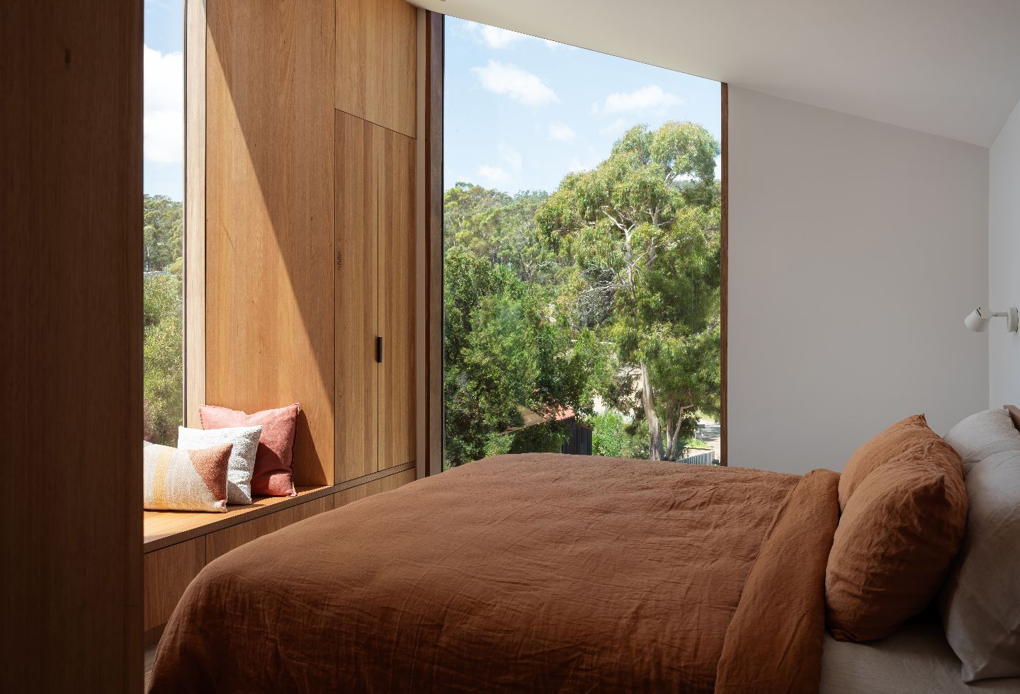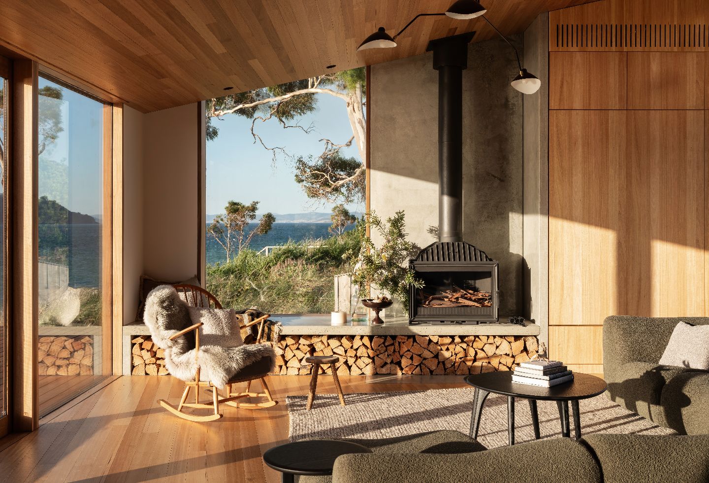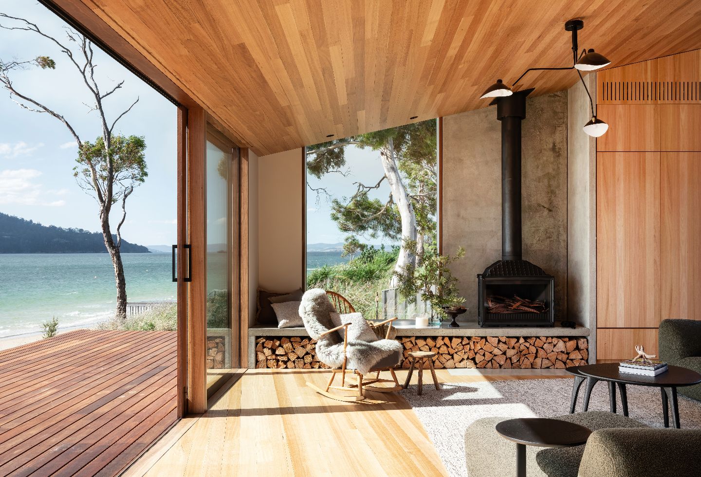 On the exterior, spotted gum cladding, decking, and windows provide a sense of continuity (and meet bushfire standards), extending into the interiors where Tasmanian oak walls, ceiling and floors meet. On the northern living room wall, off-form concrete panels anchor the home in the views and around the cast-iron fireplace. In celebration of its surrounding environment, custom Tasmanian oak joinery is featured throughout the kitchen, bathrooms, and bedrooms – including the bunk beds, which reach up into the angled ceiling cavity – evocative of a luxury camping cabin, such as the ones seen on the nearby iconic hiking tracks.