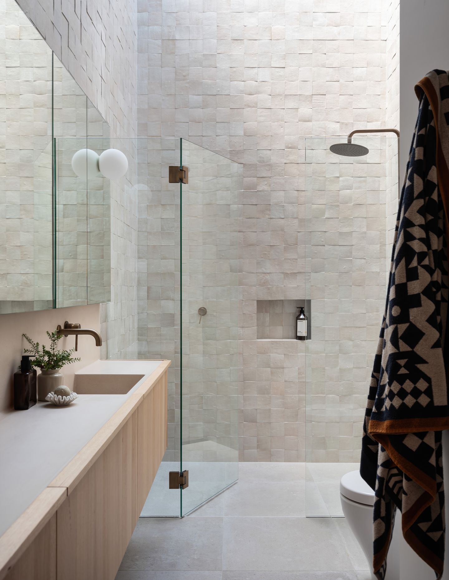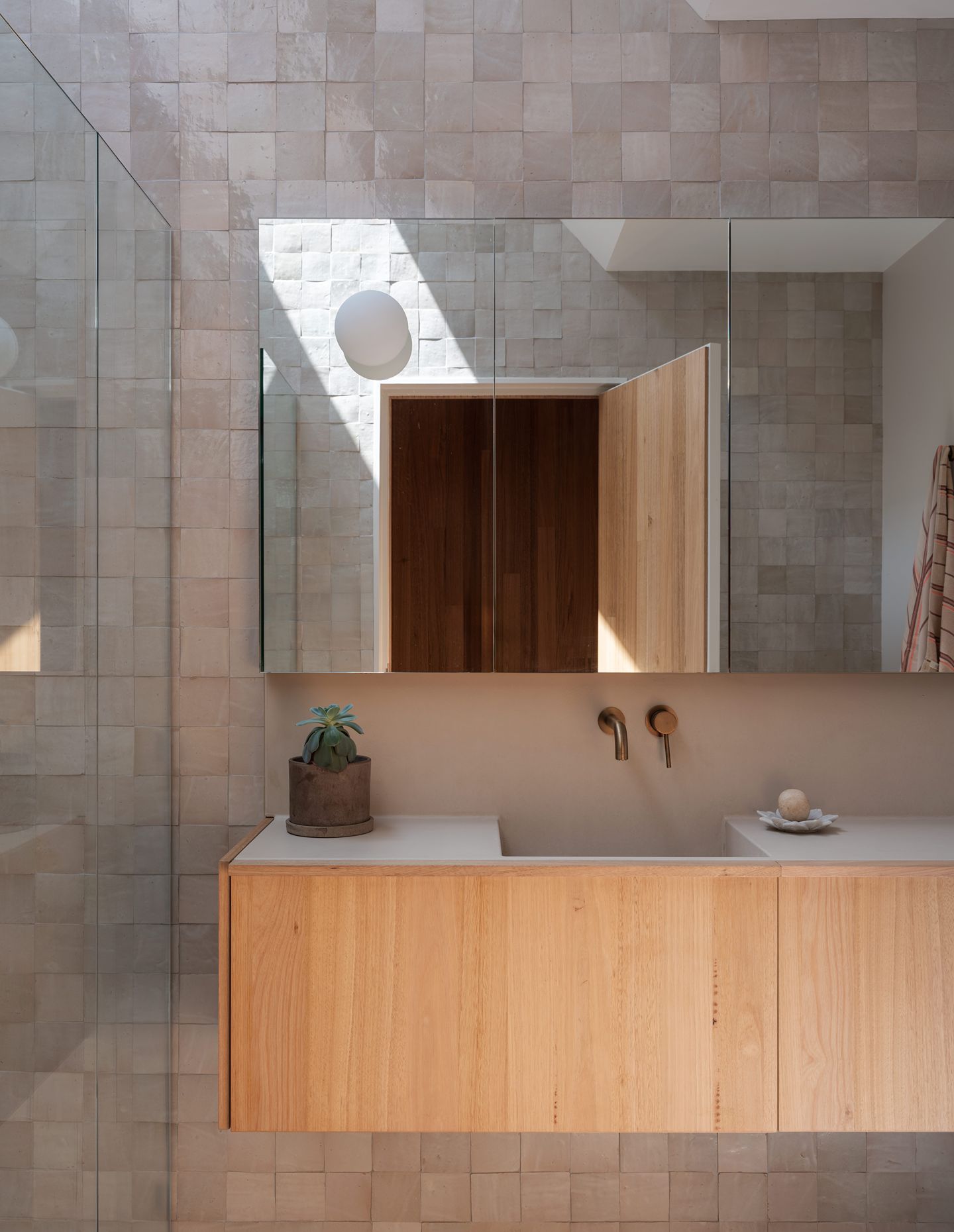 Handmade Moroccan tiles in the bathroom invite a sense of the beach environment with cool and warm grey hues; overhead skylights emphasise their texture. Similarly, the clean and restrained stainless steel countertop in the kitchen offers a reflective surface to mirror the exterior ambience. Oversized windows, built-in storage, and joinery seating allow for quiet spots to watch the world go by. It became about finding balance and working with the views. Even for the children’s bedrooms which face the street, the tree canopy is framed beyond. Repeatedly, timeless curves soften, while a hand of restraint and ample cupboards create a minimalist aesthetic.