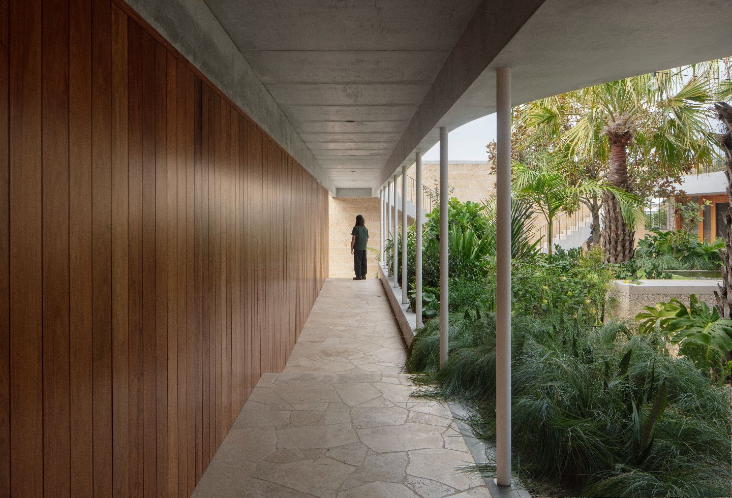 The ground floor includes an enveloping loggia and three-storey courtyard, while the middle level features an open-air promenade and pool. Finally, a top level houses just the master bedroom with an emphasis on sky and horizon. Oscillating between dry and wet, shaded and open, the atmosphere of the house as a whole is designed to contain a high level of variety within overall organising principle of the courtyard, or walled garden.