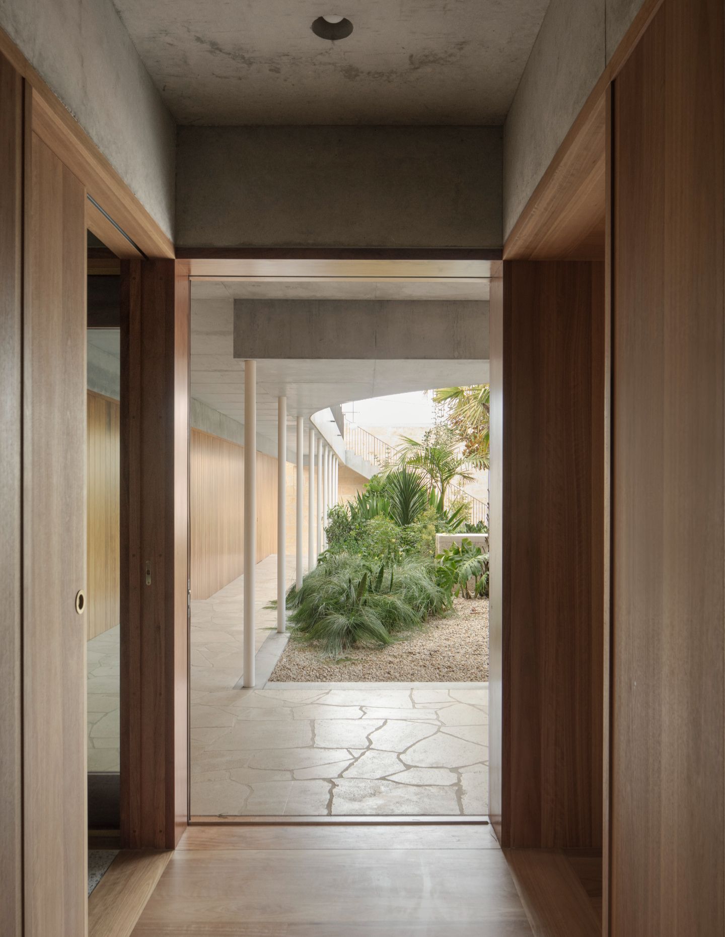 Inside the house, the garden is the focal point tying everything together. It’s effectively a rectilinear courtyard plan, with rooms designed to fit around the central green area and provide different engagements with it and smaller pockets of outdoor space. “This procession of rooms, each nearly a single room wide, allows for multiple perspectives and interactions with the gardens, while inviting natural light and ventilation into every corner of the home,” explains Parsons.