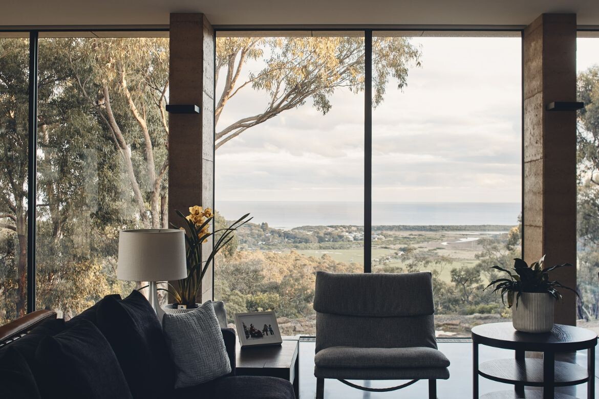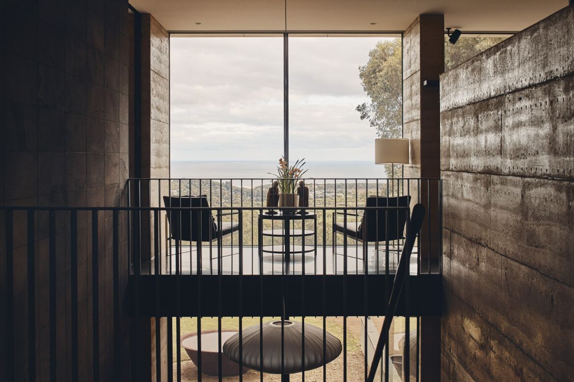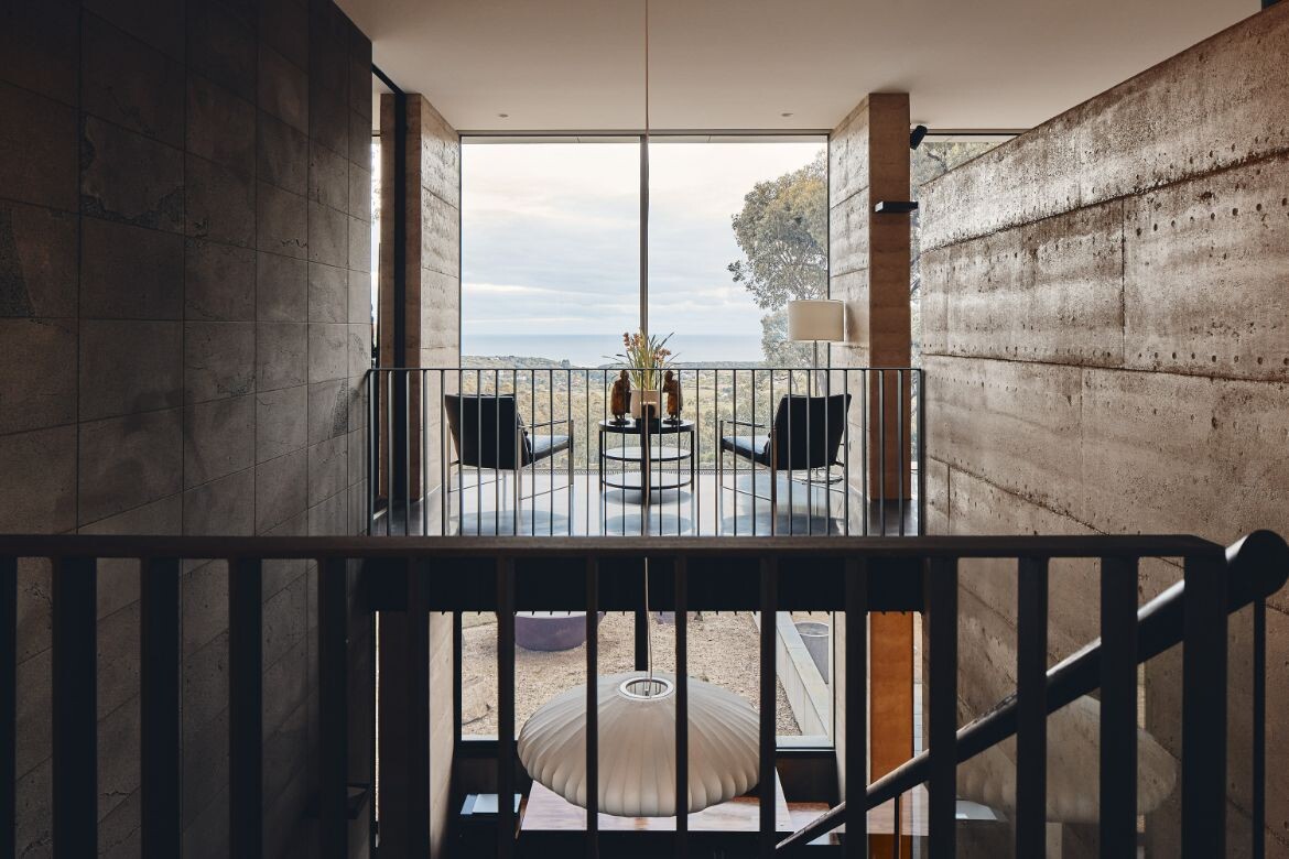 The house overlooks the Aireys Inlet and is aptly named after it, leveraging its location to stage the uninterrupted beauty of the adjacent scenery. The building’s form is defined by the implementation of recessed fixed glass and rammed earth fin walls, which craft an alternating sequence of framed views and transparent vistas of the horizon. This play of open views fosters a dynamic interaction with the exterior environment.