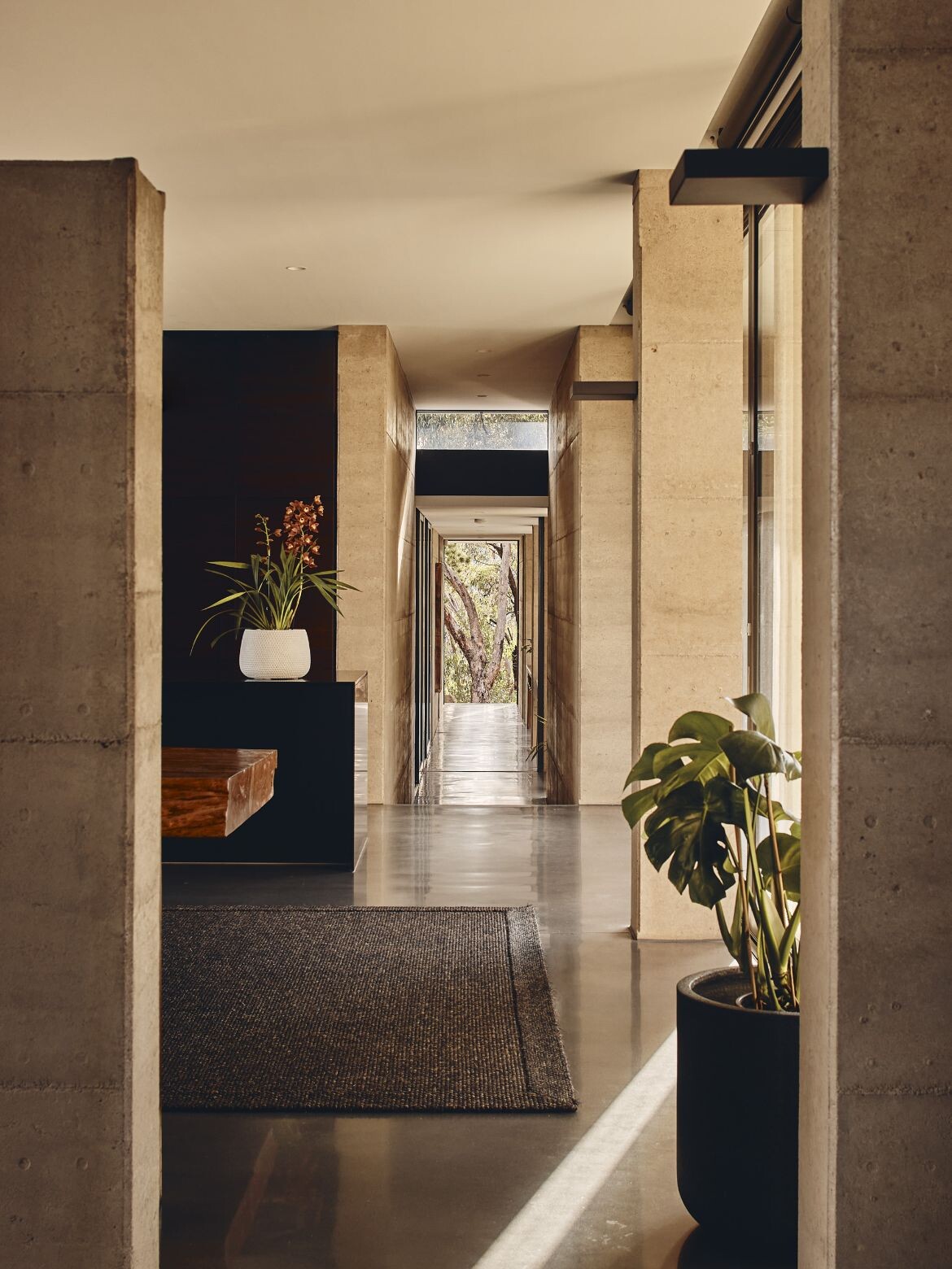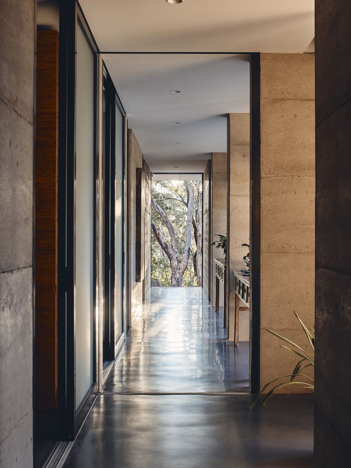 The interior layout of Aireys House is intentionally devised to frame the lush vegetation in its vicinity. Corridors culminate in views of noteworthy trees inviting the owners to linger in the views. A by-product is a series of interstitial spaces that provide the observer with continually changing views of the outdoors. This thoughtful orchestration of space ensures that natural light and shadow leave an ever-changing tableau on the walls, floors, and windows, marking the celestial rhythm within the built structure.