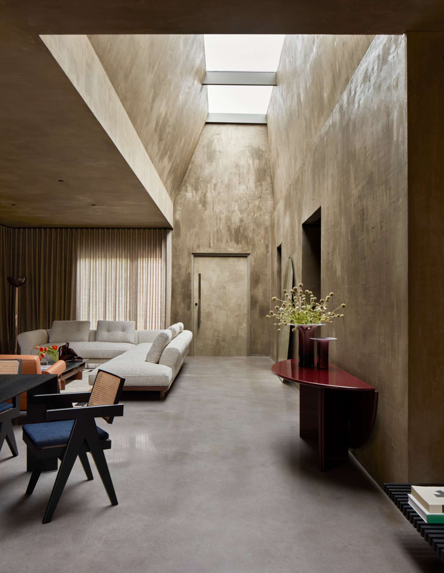 Beyond the seemingly single-storey façade, the interior unfurls as a spacious and light-filled sanctuary for living, aided by a lowered floor and series of voluminous light wells created by the distinctive form of the pitched roof.