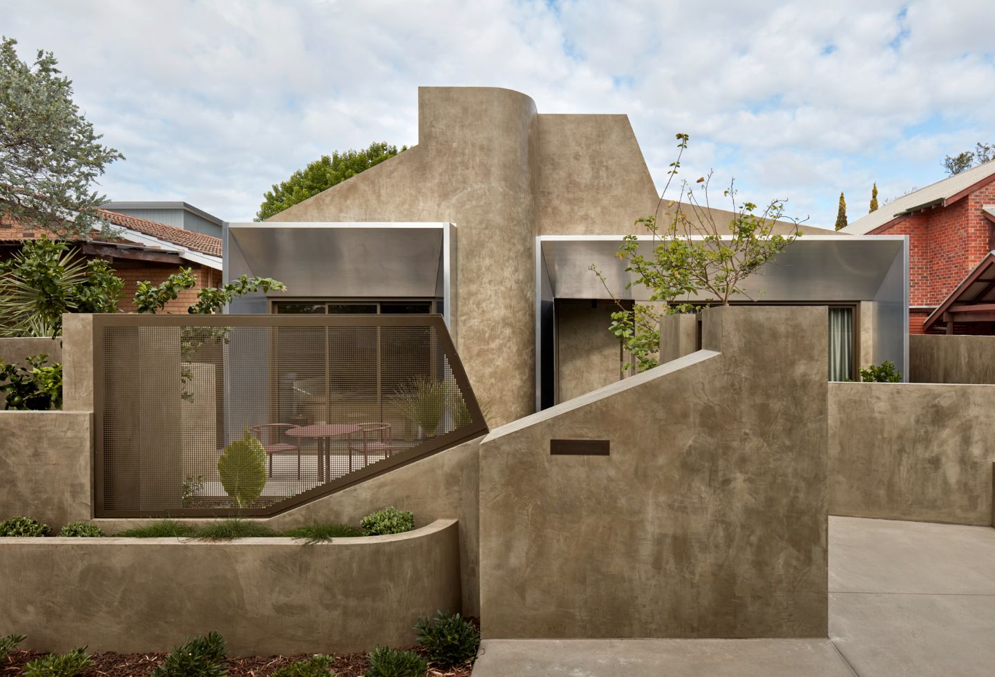 The built-form’s earthy render melds with its surroundings and is contrasted by crisp aluminium awnings — a contemporary representation of the suburb’s bullnose verandahs.