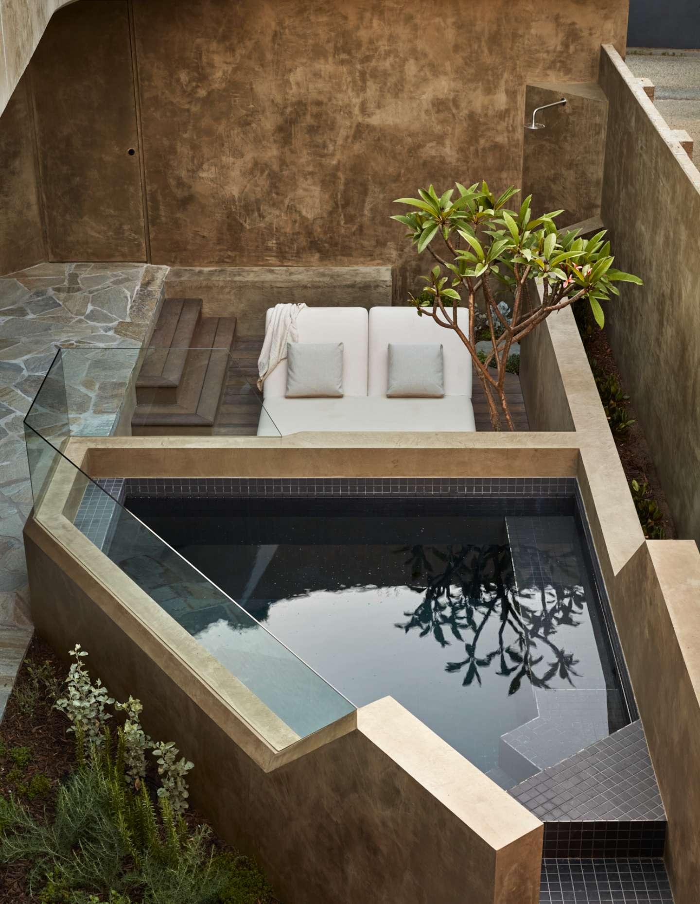 Responding to the local vernacular with an abstract hand, the home’s sculptural silhouette marks its presence amid a varied streetscape, referencing the proportions, pitched volumes and generous setbacks of the suburb’s archetypal character homes. A palette of earthy render and aluminium detailing lends rawness to the architecture while obscuring boundaries between the landscape, interior and exterior, resulting in an immersive environment that elevates the client’s everyday living rituals.