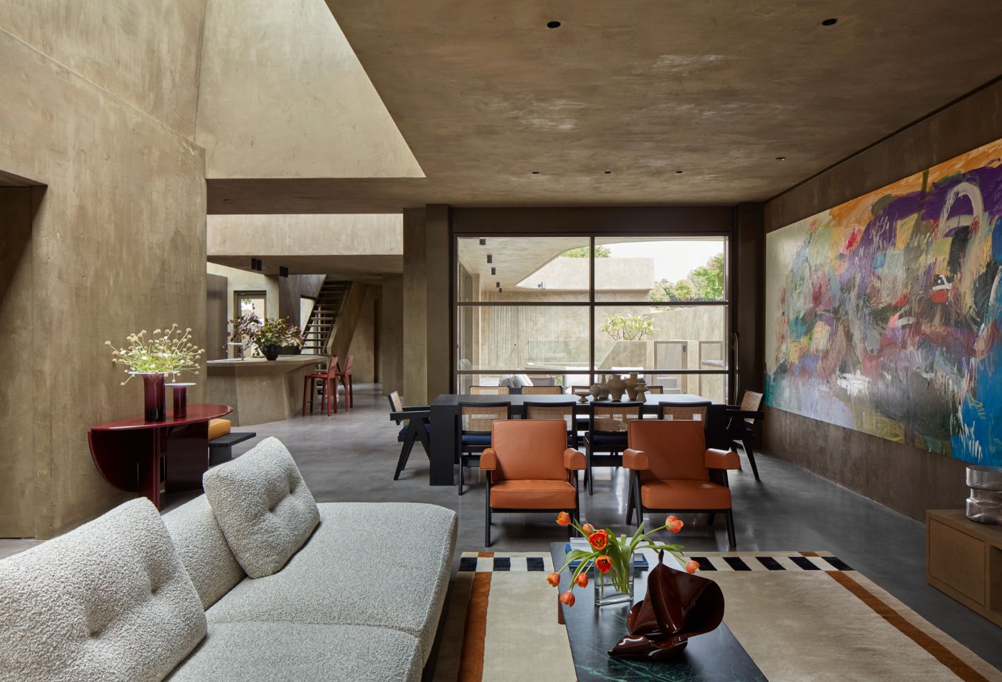 Operable, glazed doors open laterally to the front and central courtyards, offering access to light, greenery and ventilation across the main living spaces.