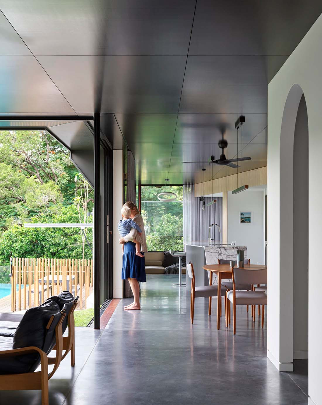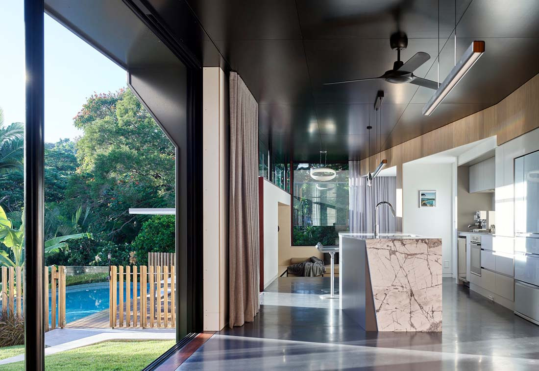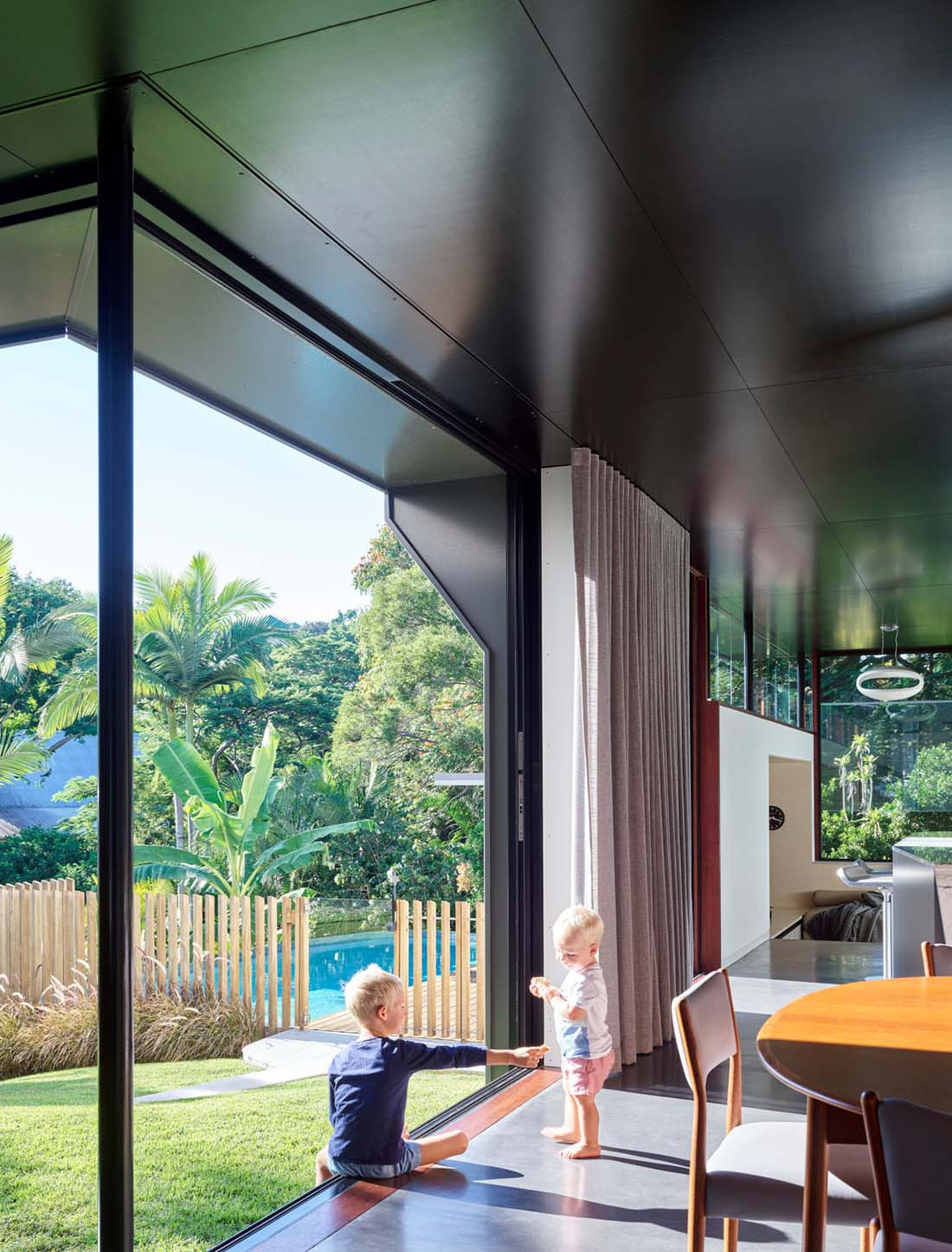 With a soft black finish, the material absorbs the harsh light that dominates the Queensland sky, diffusing it back throughout the interior to produce a gentle ambience. “The black ceiling adds a sense of calm to our home. It’s a bit like being under canopy shade, which in our bright climate makes much more sense than the intense reflectiveness of all-white spaces,” muses Derrick.