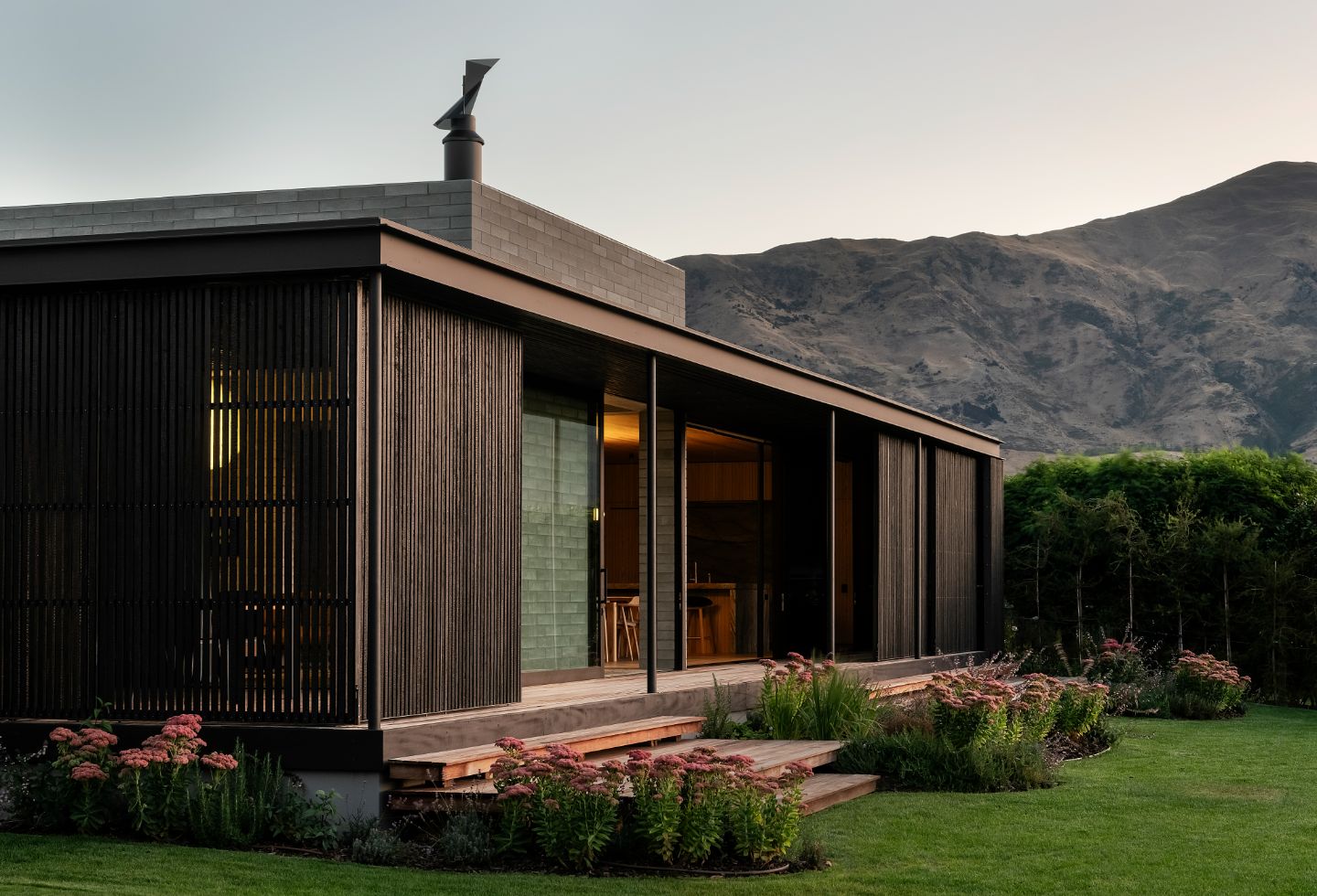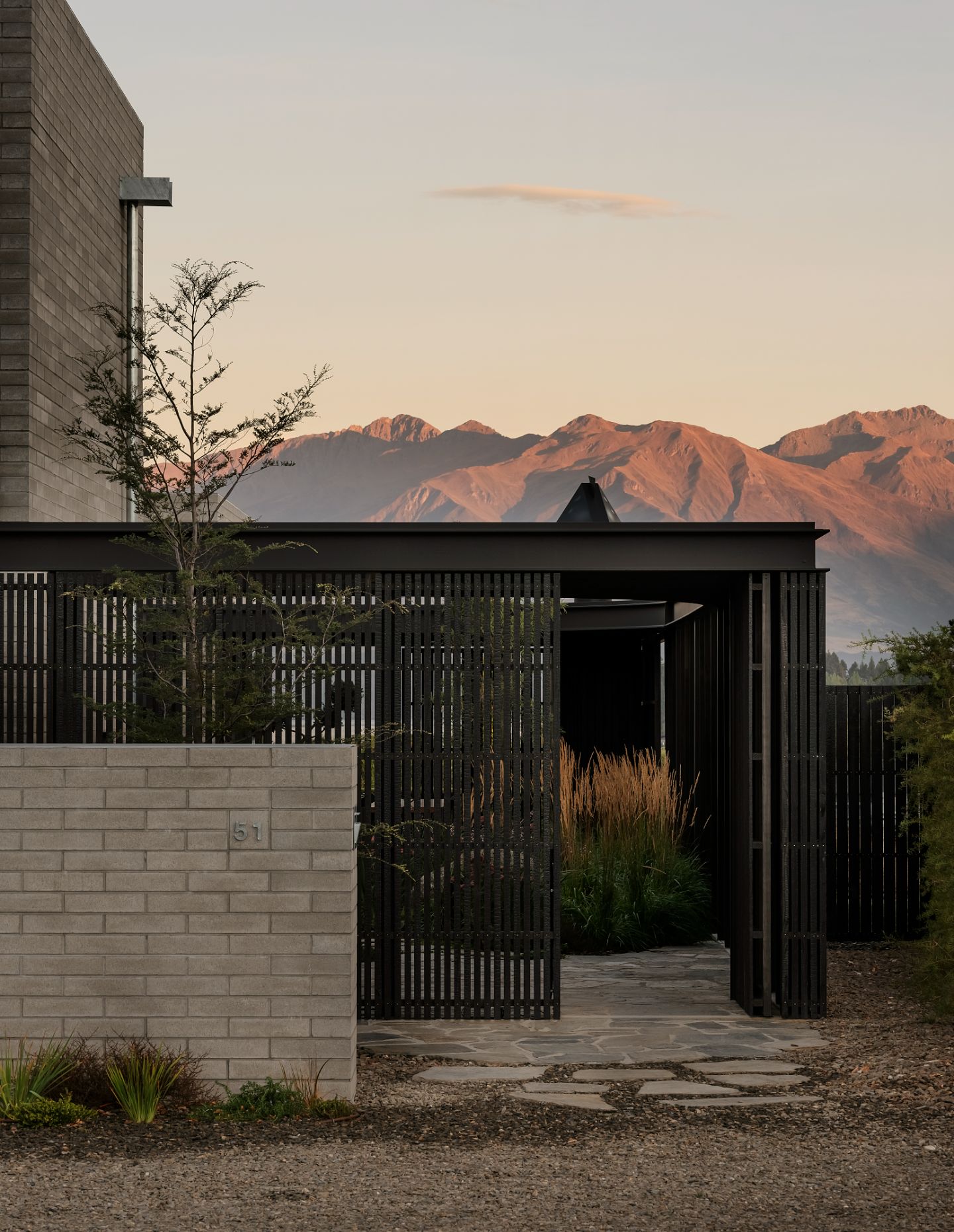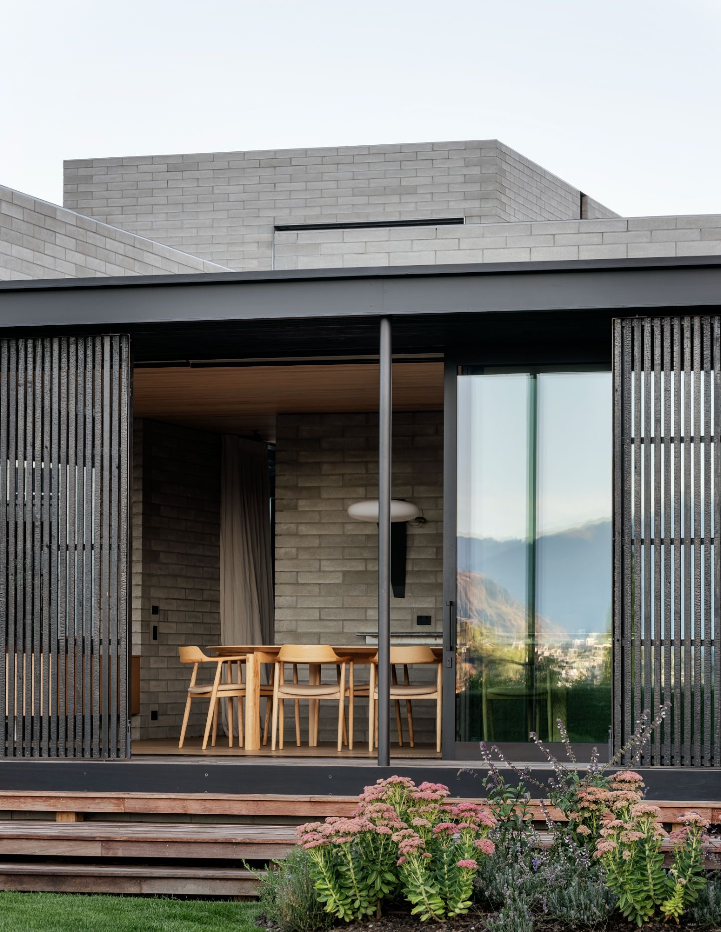 Orientated towards Lake Wānaka and Buchanan Mountain peaks, the street-facing ebonised façade – an abated interpretation of Brutalism – alludes to what lies beyond the walls. The residence presents itself as a series of solid volumes arranged according to the relationship between openness and enclosure. These forms are enveloped by a lightweight screen system, courtyards and selective openings that create an interplay of light and shadow within. To the streetscape, the form is untainted without windows punctuating the façade, empowering the view over the lake while providing utter privacy.