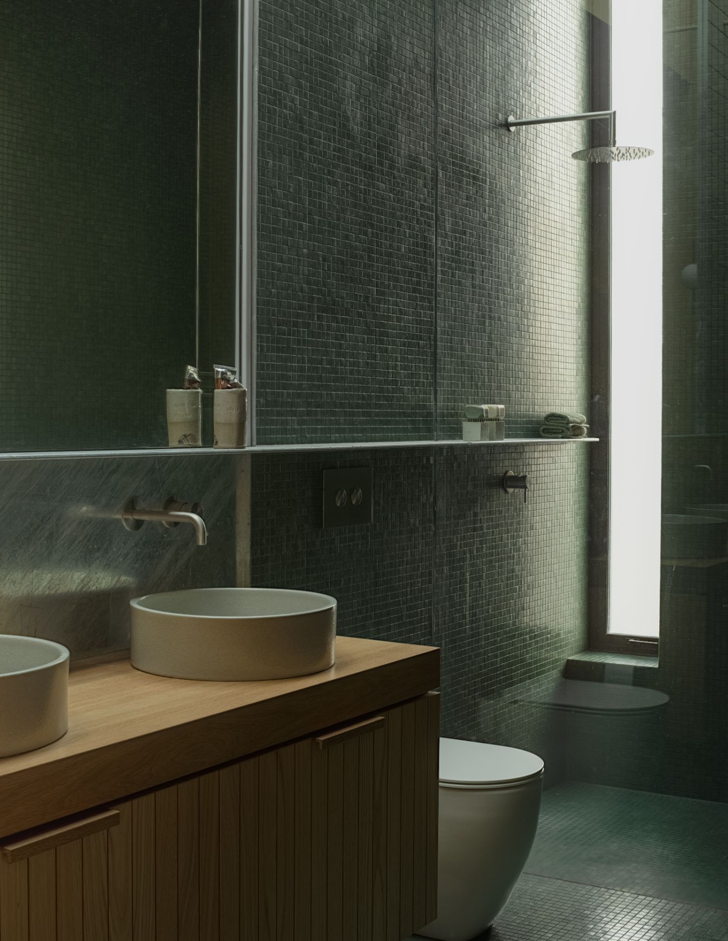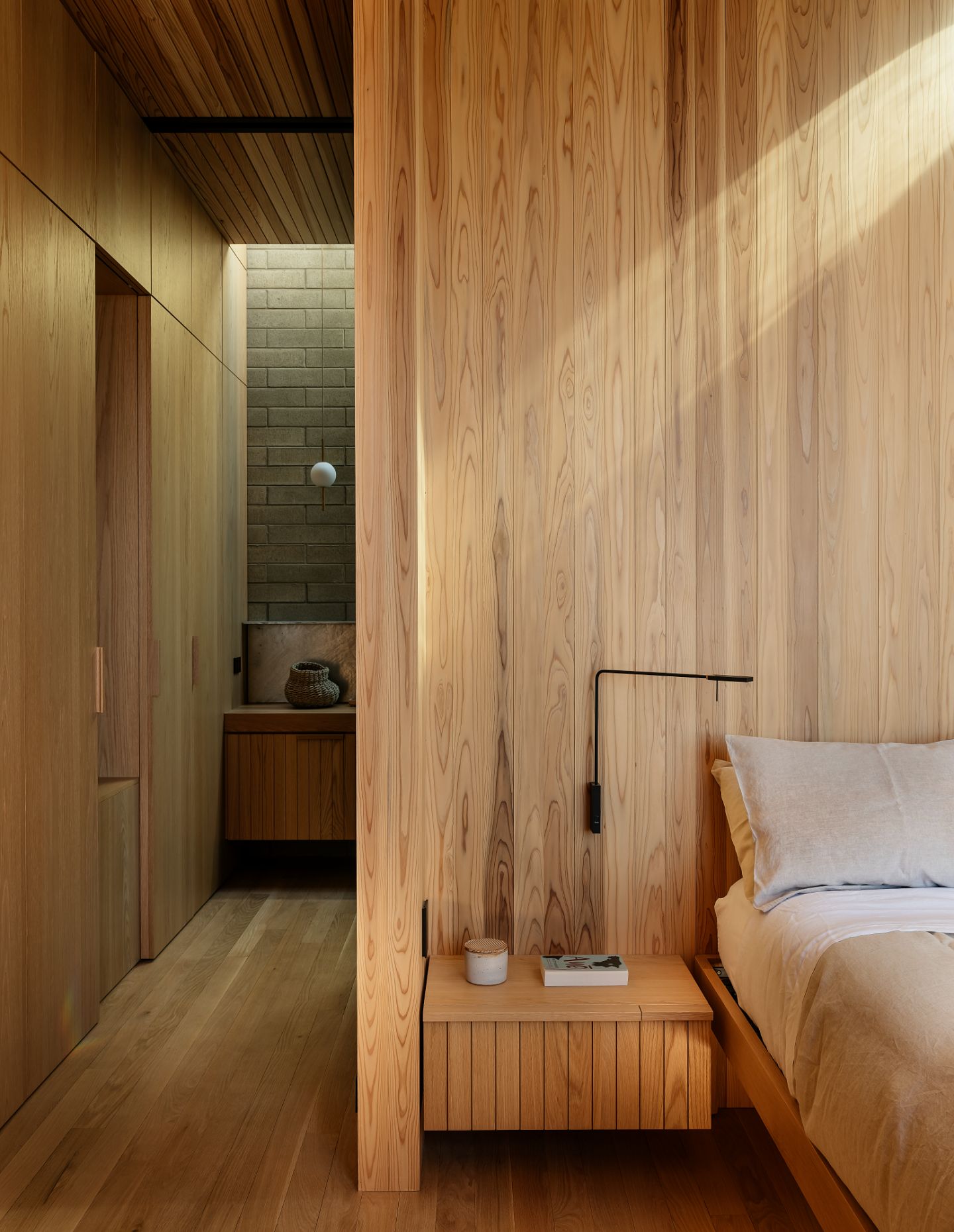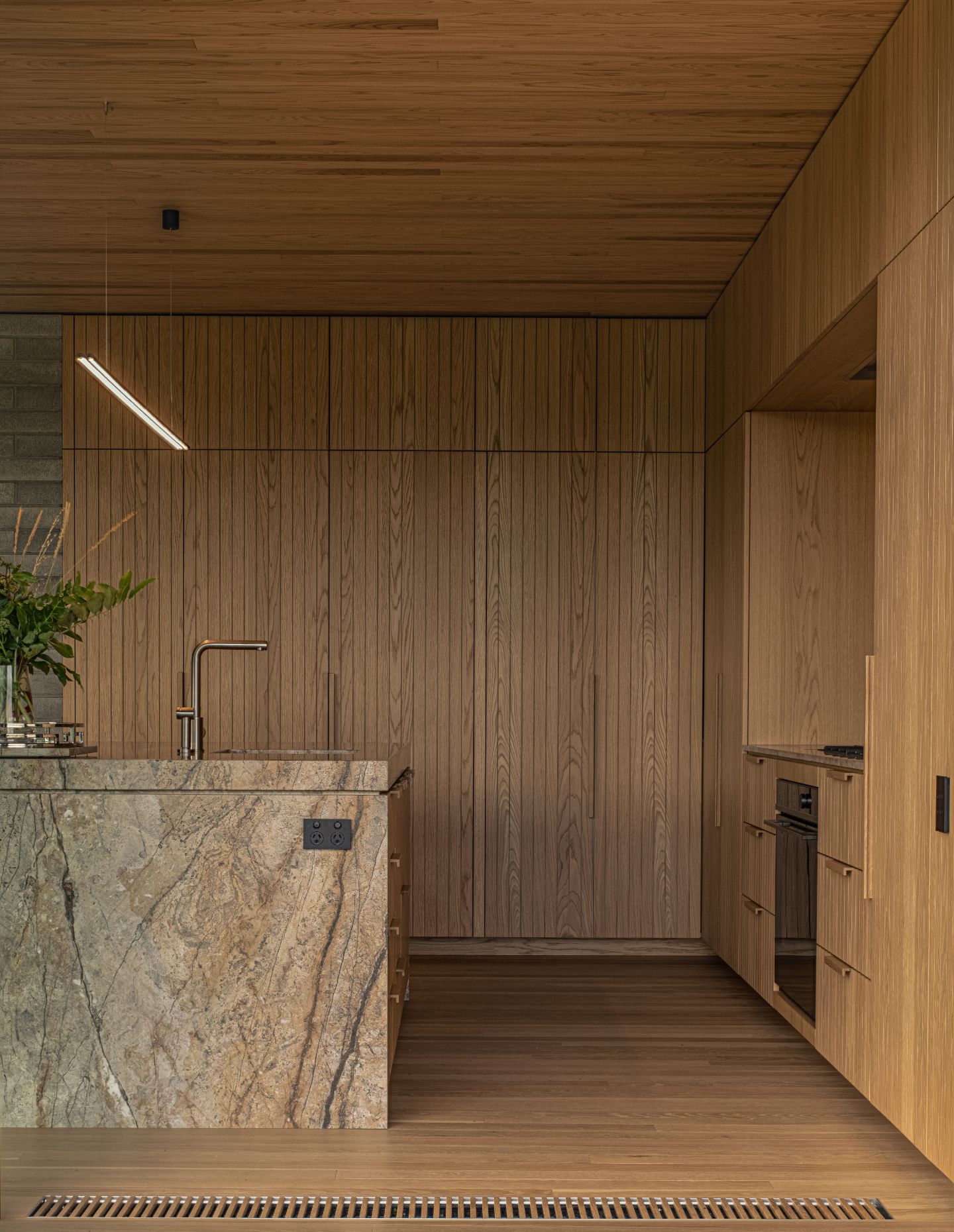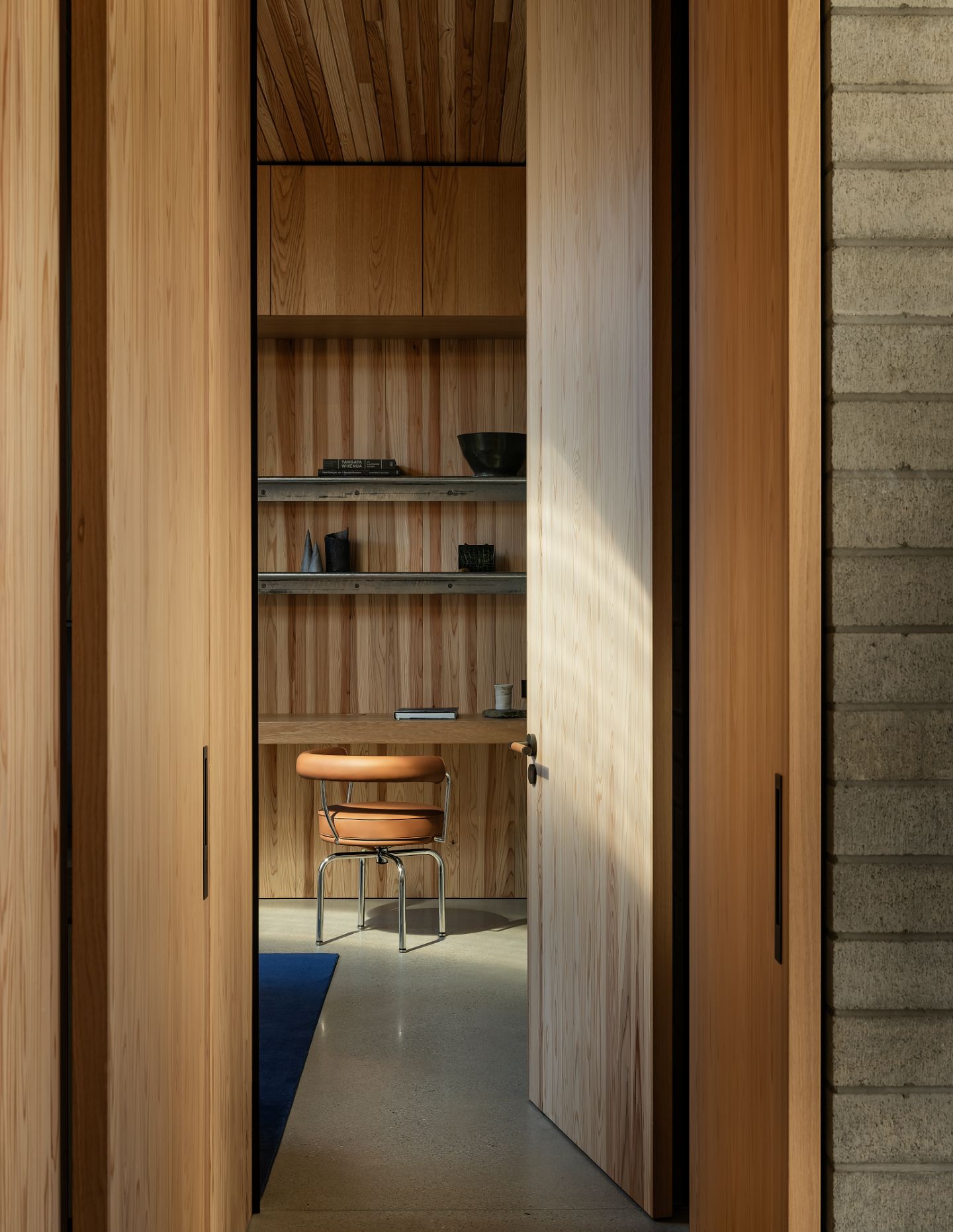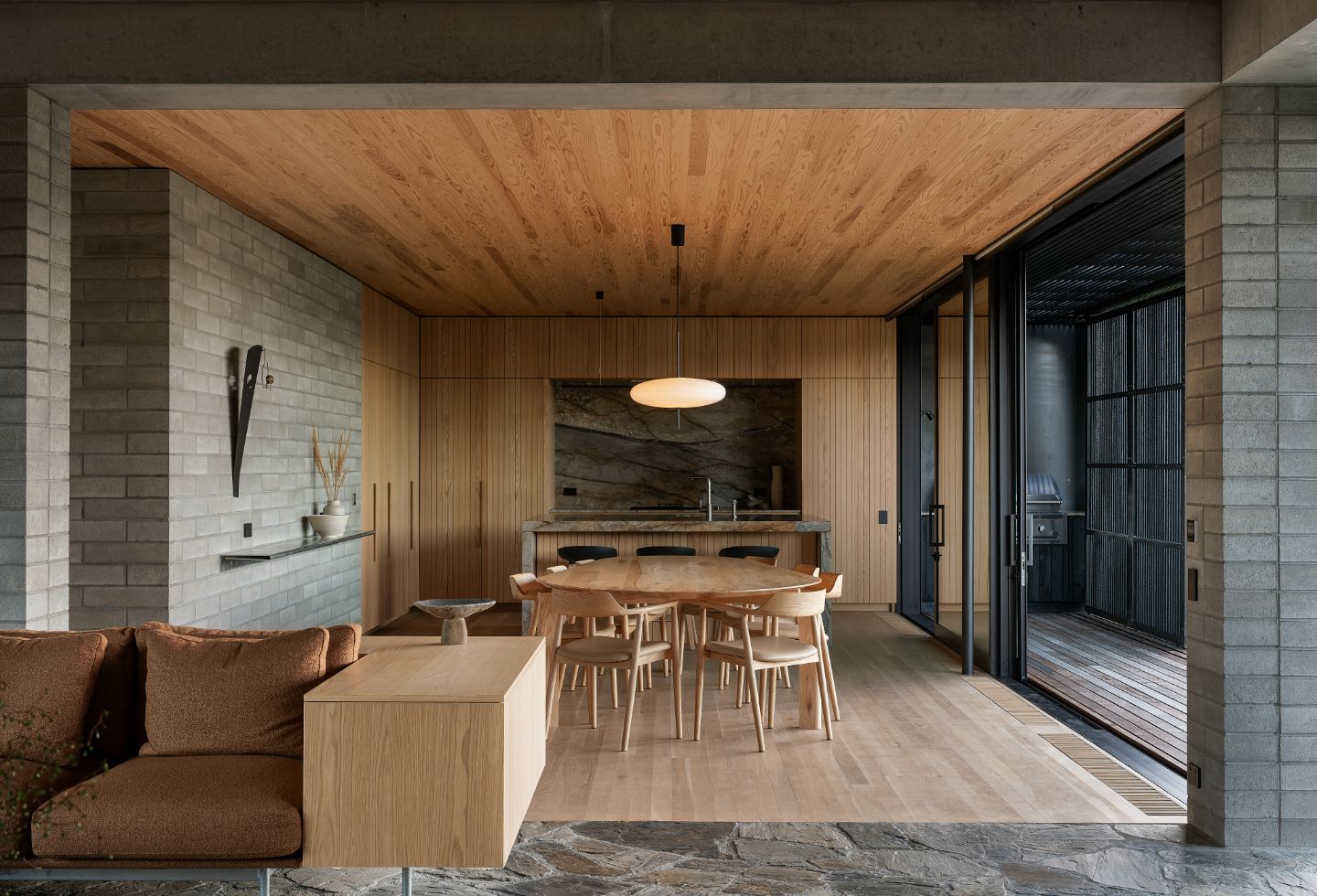 A restrained palette of organic materials further blends the continuity between external and internal spaces. “The module of these materials informs everything – from the characterful detailing to the proportion and openings of each room,” the team continues. Among the palette are locally manufactured ViBlock masonry, Japanese cedar, American oak, galvanised steel, glass mosaic tiles and marble. A contrasting array of materiality takes the project out of its immediate locale, speaking to New Zealand’s globalised place in the world. Galvanised steel is paired with blockwork as the weathering and tonality of the two are homogeneous. Blackened steel sits sharply beside charred cedar. Meanwhile, Japanese cedar and American oak, with a similarity in grain structure – the former being a hardwood and the latter a softwood – exemplify a consideration for both aesthetics and durability.