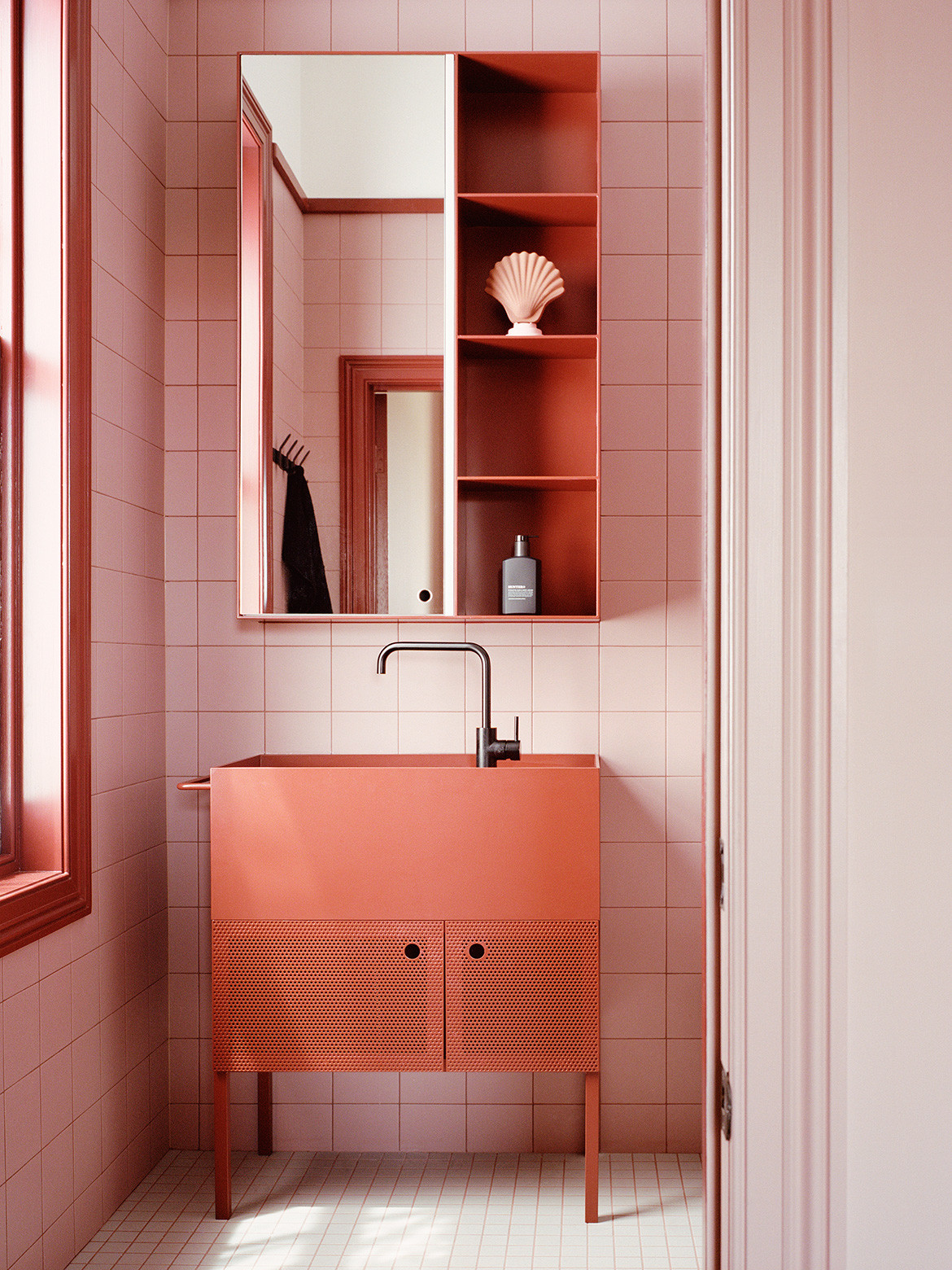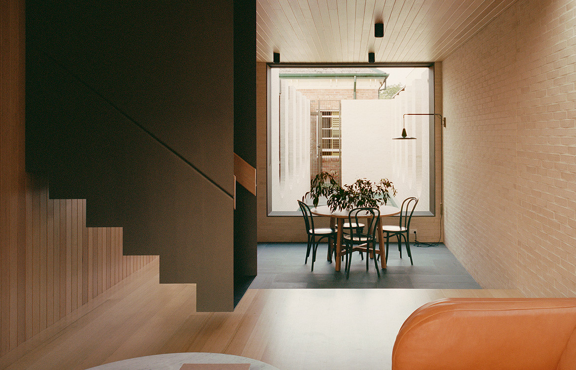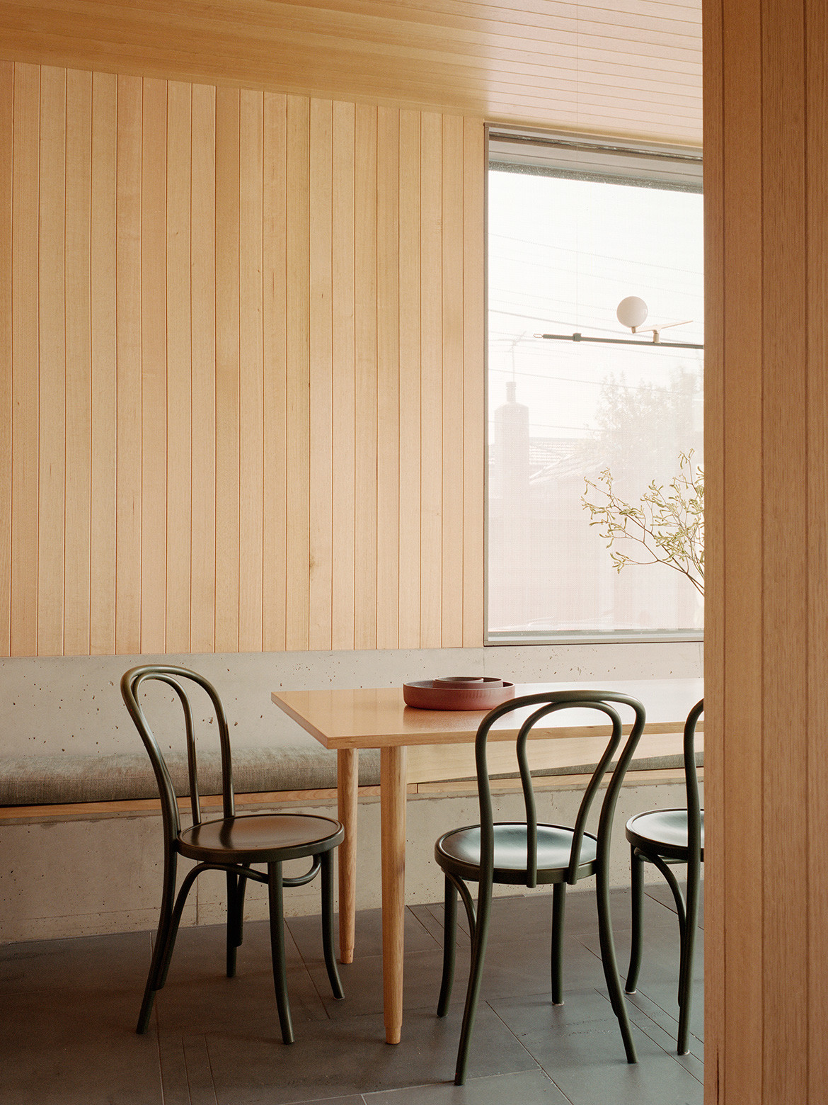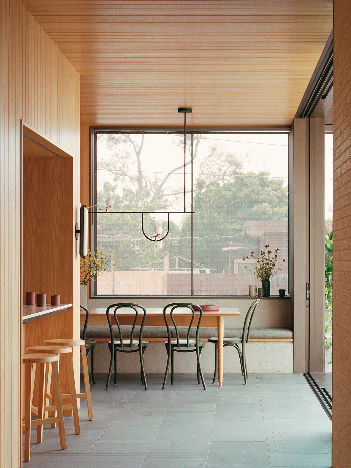One of the most innovative parts of this home is the kitchen, with its sliding doors allowing it to feel integral to the garden. Lined in timber, with a moveable mesh screen over the island bench, it exemplifies the bespoke nature of this design. “Our client didn’t want to be continually cooking in the kitchen, preparing snacks in between meals. The screen was her way of saying ‘The kitchen is now closed!’’’ says Mel, who provided a similar mesh veil to a side window in the kitchen, elevated above the pavement. “It’s lovely to be able to feel part of the streetscape, but still maintain a certain level of privacy.”