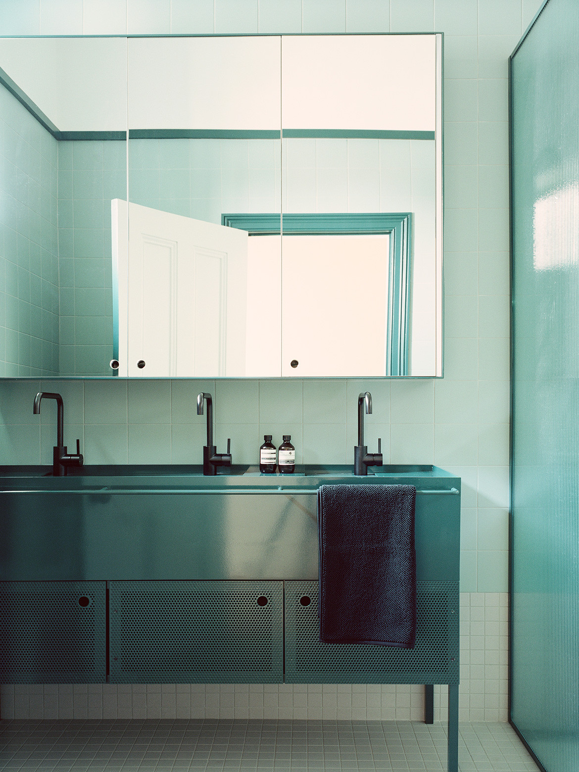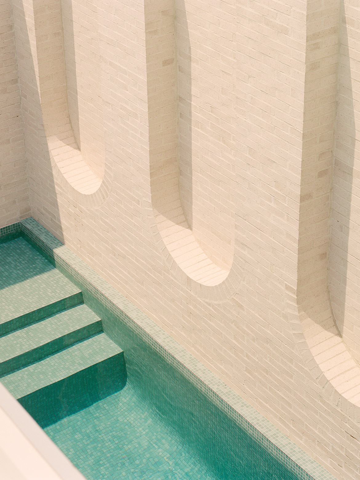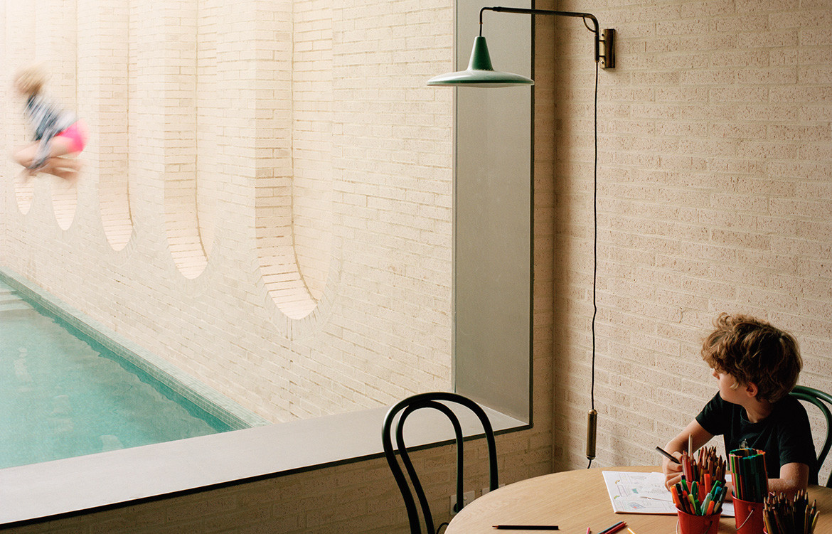 Studio Bright restored the original Edwardian red brick home, removing the 1980s “faux-Edwardian addition”, together with the garage and sheds along the property’s southern boundary. The house’s flimsy aluminium windows were also removed, along with the unusual decorative choices from the 1950s. “We wanted to free up the back garden (orientated to the north) as well as allow the original home to breathe,” says Mel, who aligned the new covered link with a swimming pool to the east of the original corridor. This link, with its inverted brick arches, not only provides seating for the children and their friends but also a place to dive into the pool (in the form of built-in alcoves) from the other side.