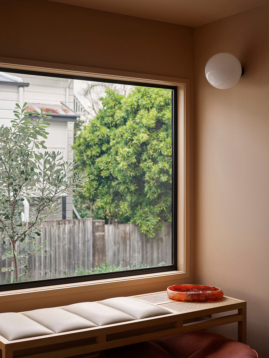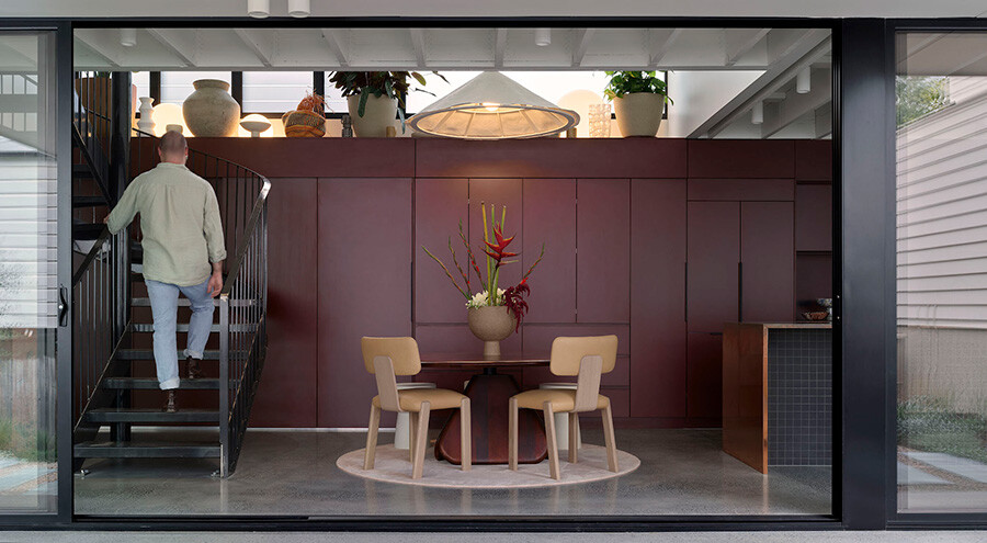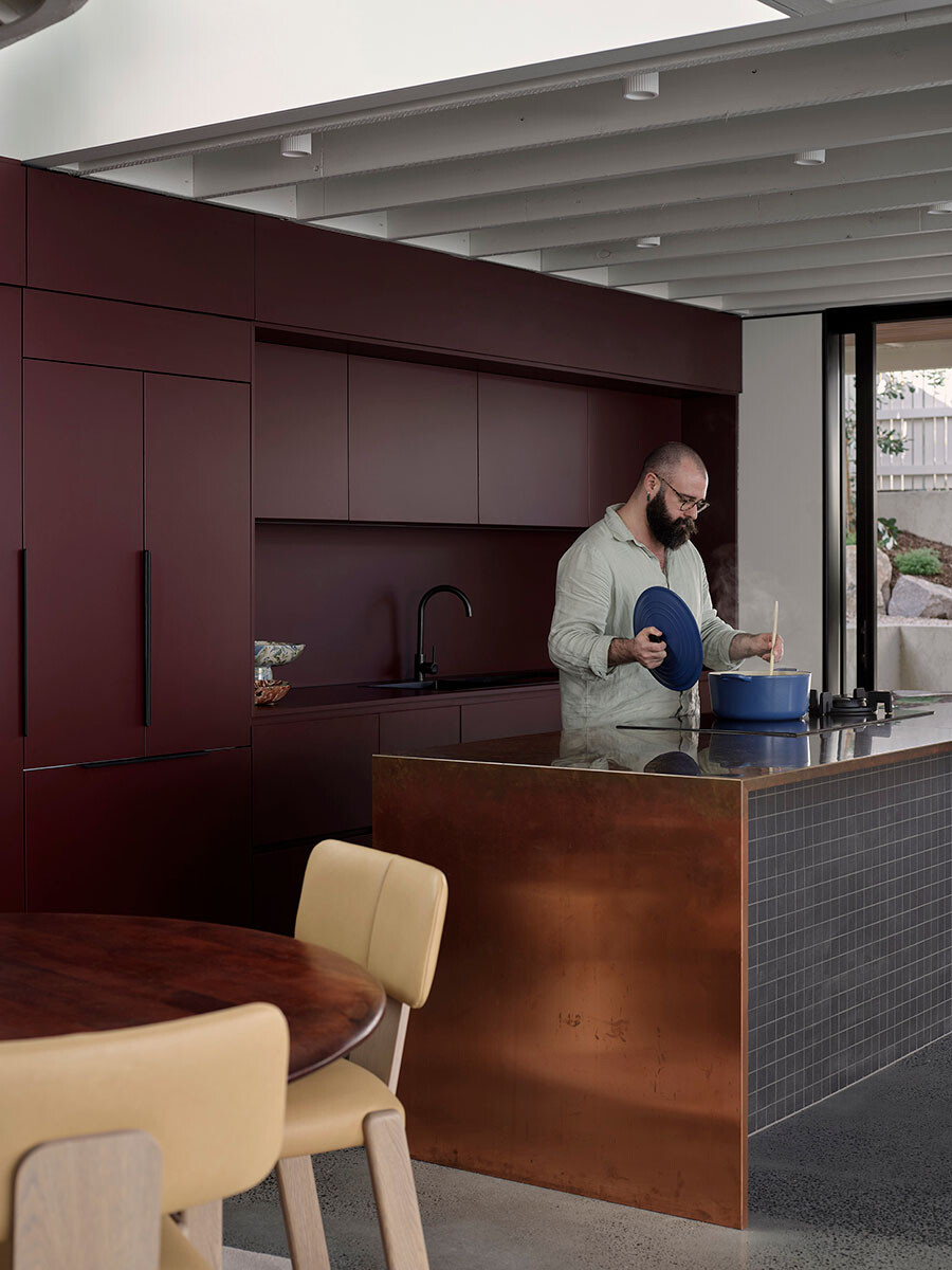 Moving inside, the inspirations came from French bistros and moody spaces, expressed through dark joinery that contrasts against the lightness of the openings. A daring, deep maroon colour of Laminex creates a wall of joinery and sits alongside a copper bench – as chosen by the client, adding an unexpected twist.