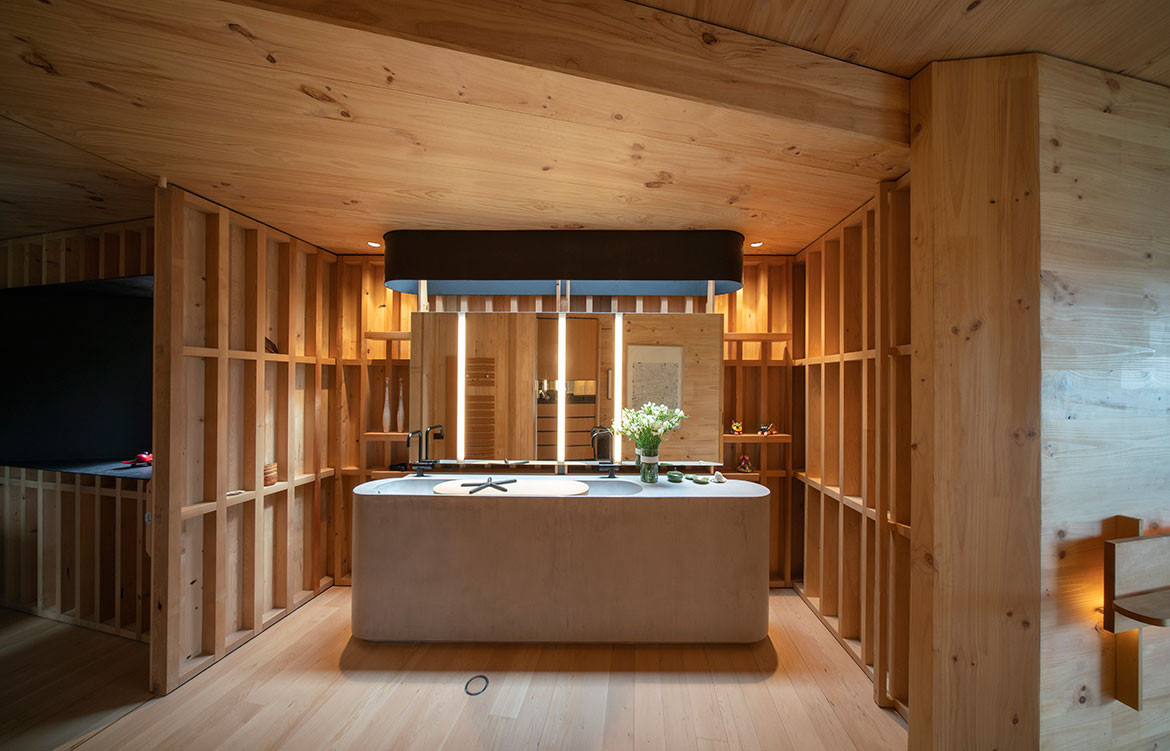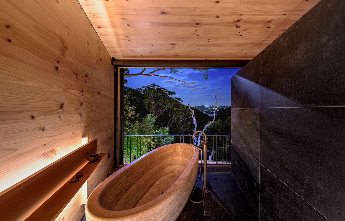 James has been fastidious in his attention not just to detail, but to the right detail. “Every bracket and screw,” he says, “is used to inform the overall aesthetic of the home with materials selected to develop a patina of use and character with time.” Hence, the tapware is from New York, the hydronic heating from the Czech Republic, the limestone flooring from Germany (cut and processed in Hong Kong), the travertine bath is from New Zealand, the superbly honed concrete vanities from the Gold Coast, and steel window frames and cladding from Austria – plus a host of sustainable features.
