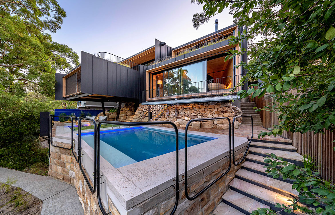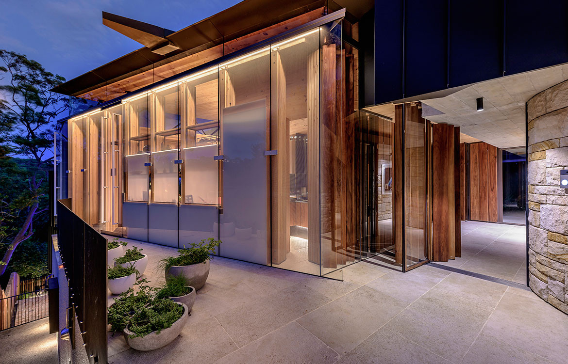 The entry to this house on Sydney’s lower north shore is discreetly tucked away down a flight of steps and behind a gently curved sandstone wall. Look carefully and you will see the operable vertical slot window which allows anyone in the kitchen to see who is at the door.