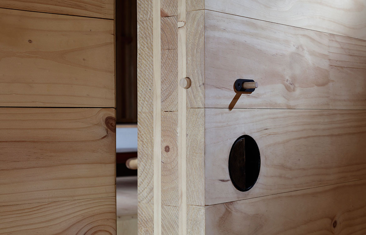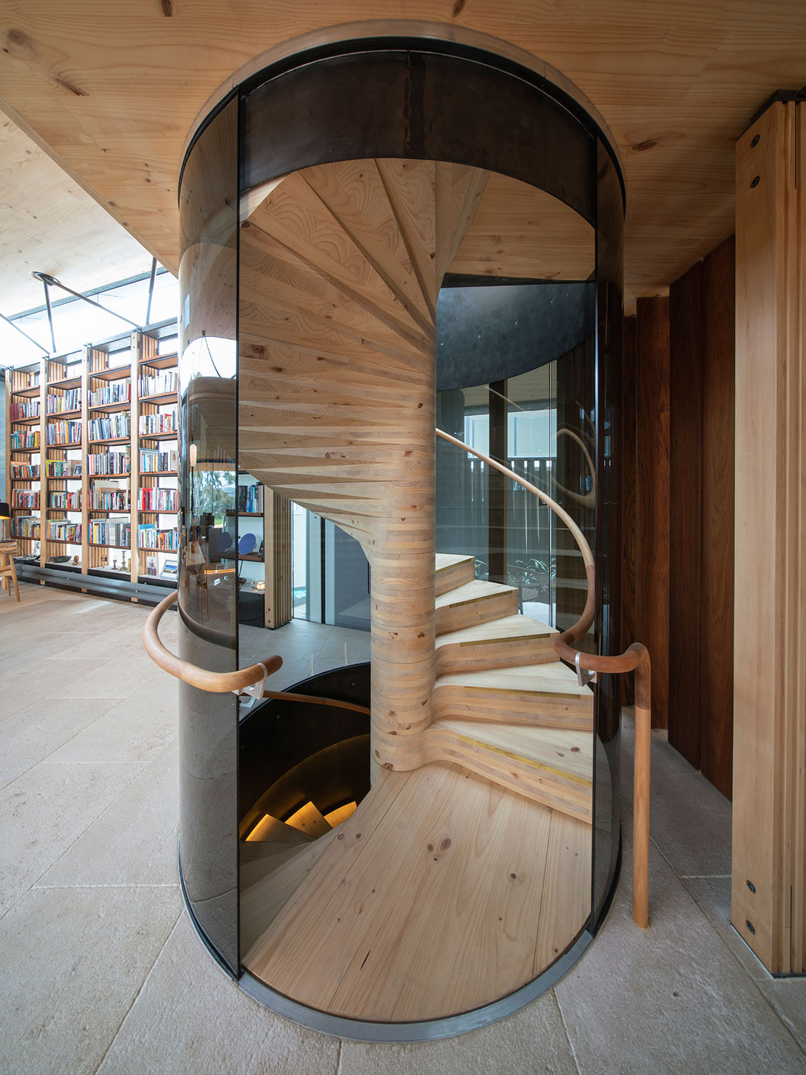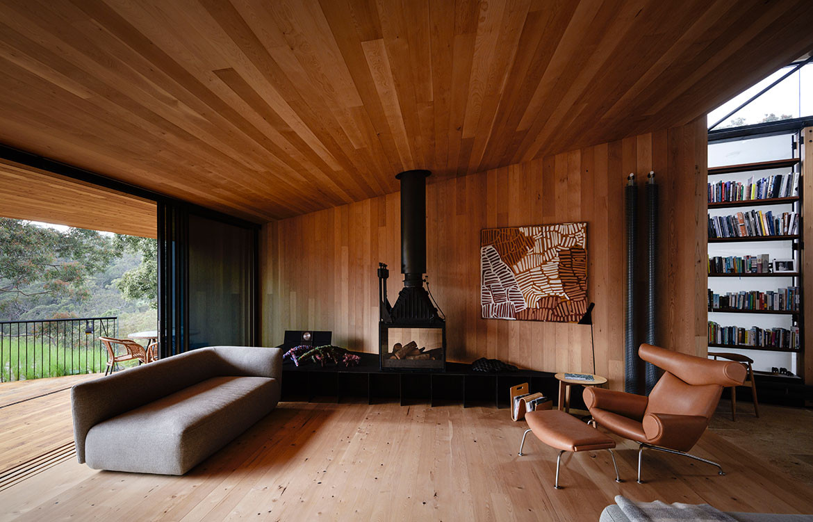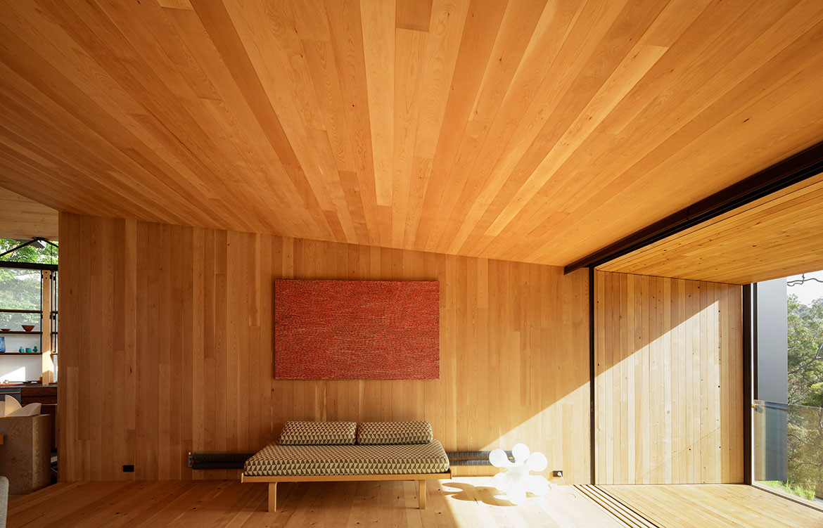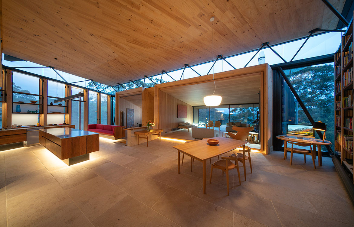 This is a house made primarily from cross-laminated timber (CLT), manufactured and processed in New Zealand. This includes structural frames and a boldly cantilevered volume forming one of the two main living spaces. James grew up and trained in Tasmania where he formed a love of local timbers. Hence, the timber linings in the house are Huon Pine, Blackwood and Celery Top Pine – the latter two being sourced from Hydrowood which recovers timber from Tasmania’s drowned forests. Collecting the Tasmanian timber took ten years, while the Hydrowood required ordering whole trees up to two years ahead in order to allow for drying and processing.
