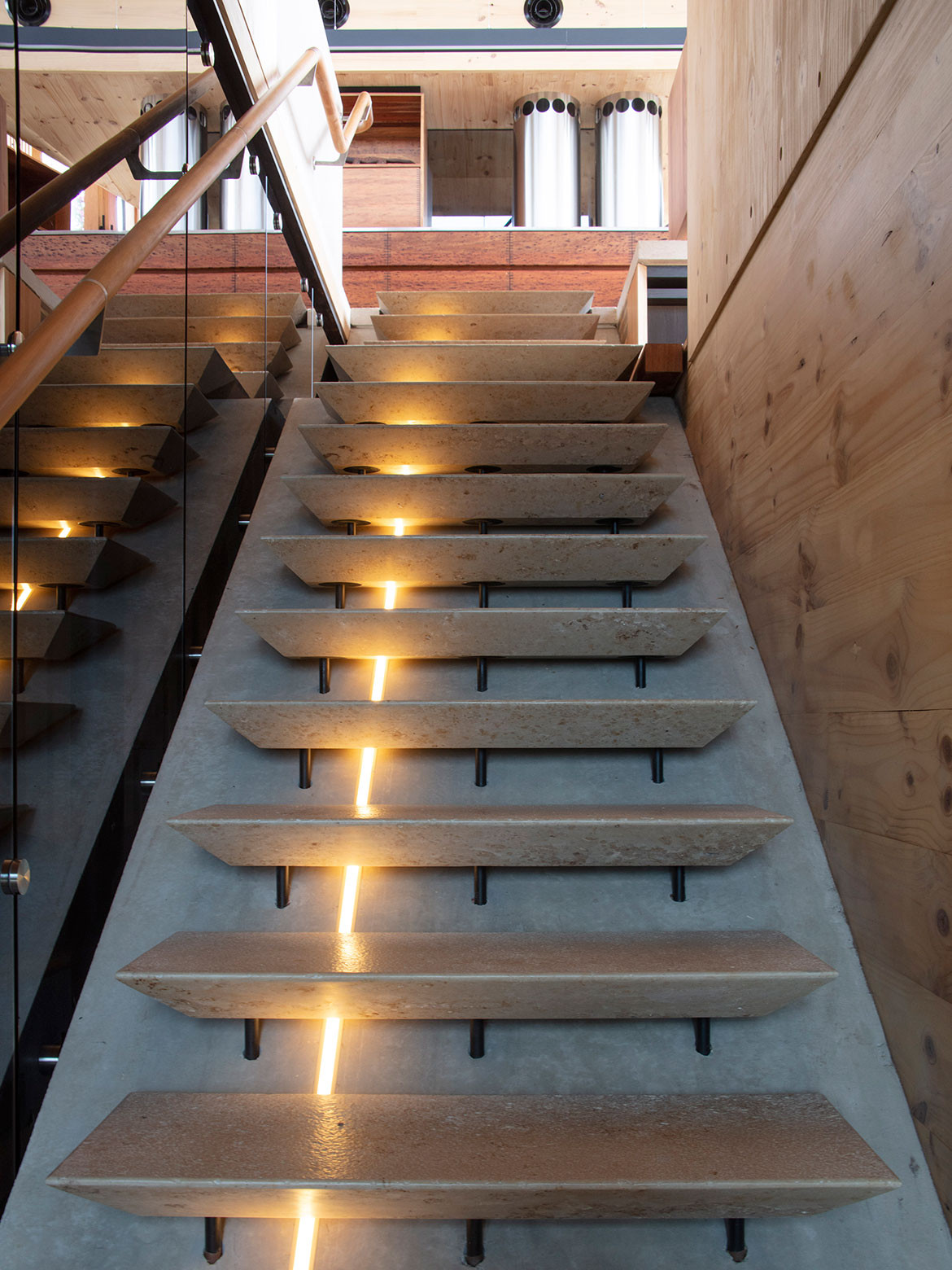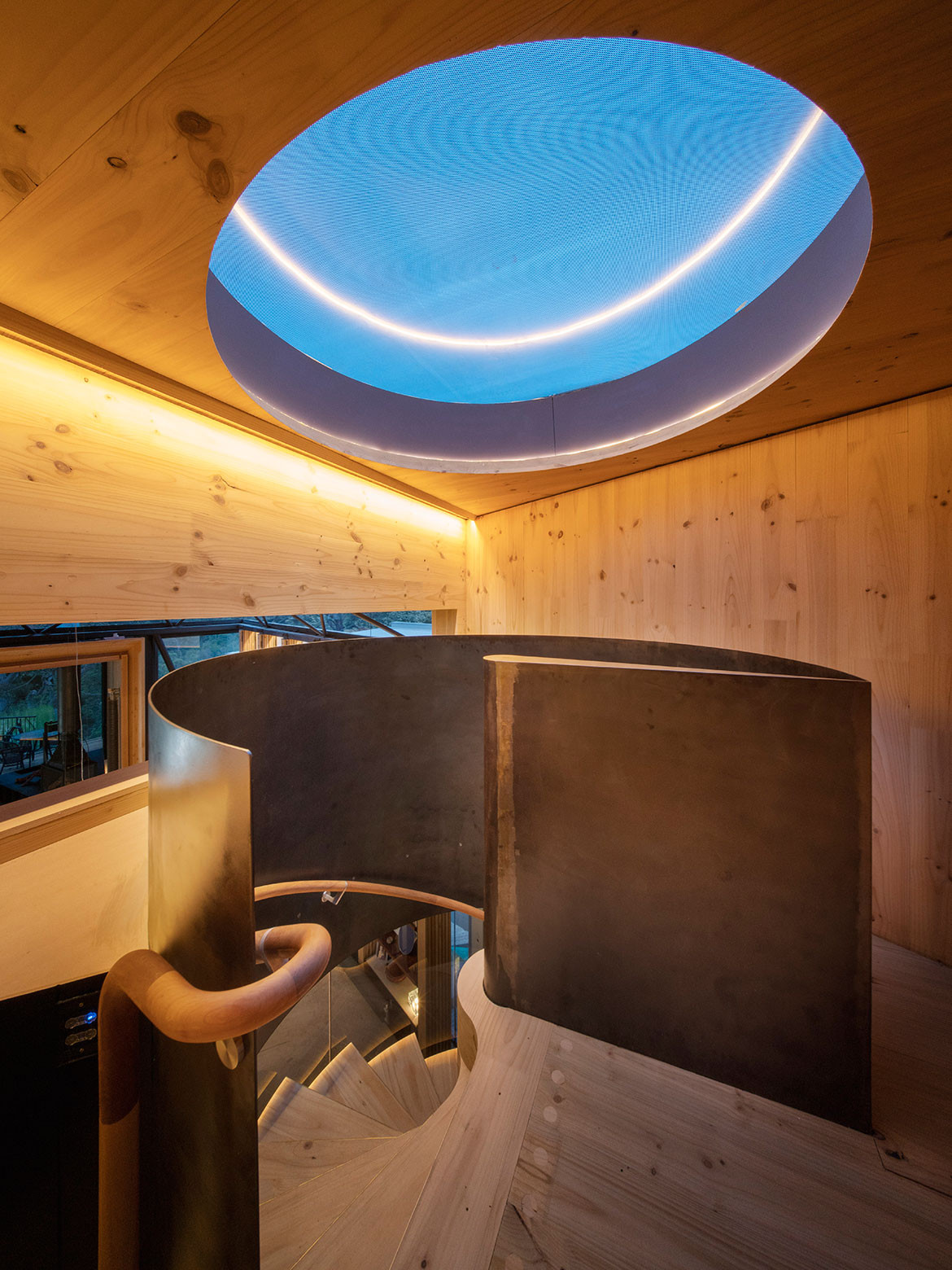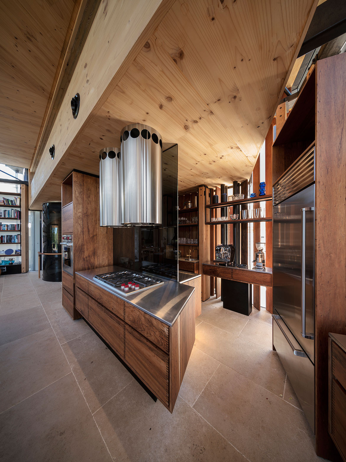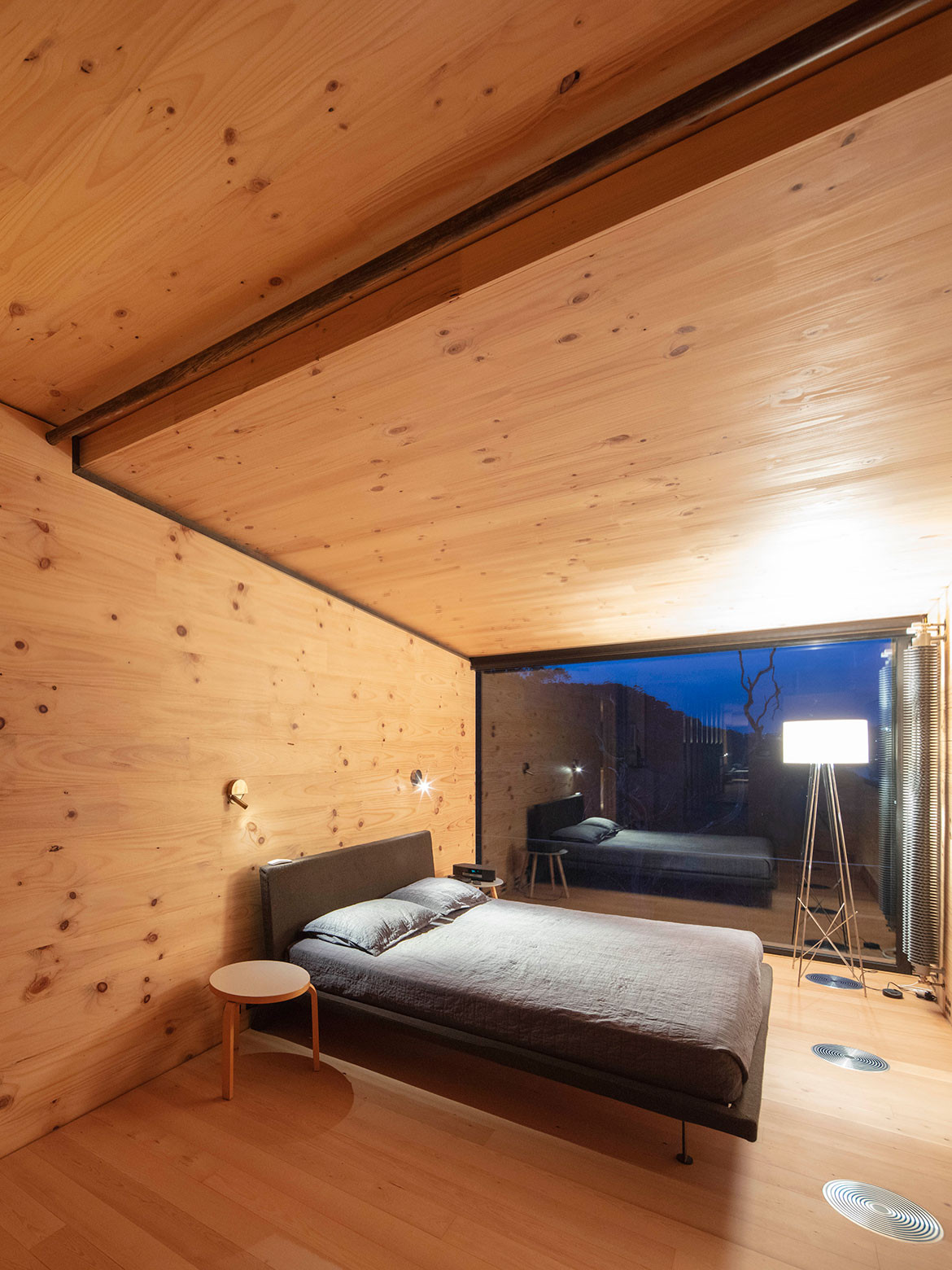 This is a house made primarily from cross-laminated timber (CLT), manufactured and processed in New Zealand. This includes structural frames and a boldly cantilevered volume forming one of the two main living spaces. James grew up and trained in Tasmania where he formed a love of local timbers. Hence, the timber linings in the house are Huon Pine, Blackwood and Celery Top Pine – the latter two being sourced from Hydrowood which recovers timber from Tasmania’s drowned forests. Collecting the Tasmanian timber took ten years, while the Hydrowood required ordering whole trees up to two years ahead in order to allow for drying and processing.