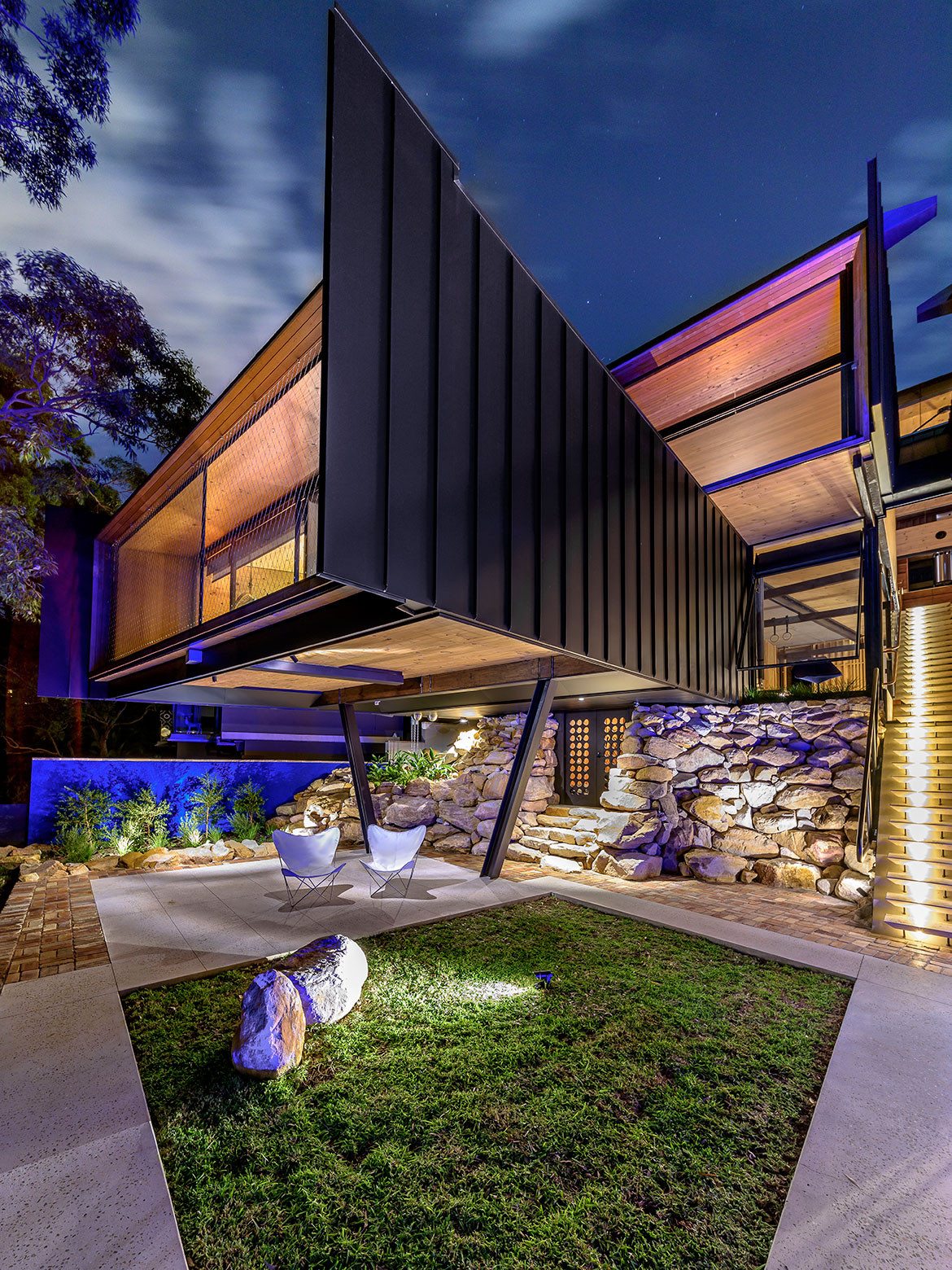 The trees are part of the context to which the house responds so strongly. In the suburb of Castlecrag, the site tracks down from the ridge towards the drowned river valley of Middle Harbour. It is inseparable from its landscape, not enjoying the fabulous views voyeuristically, but becoming one with the site. This is also a response to its architectural context because Castlecrag is home to the Mahoney/Burley Griffin legacy and its local application of Frank Lloyd Wright’s vision: the house as a shelter, borrowed landscape, use of local sandstone, prospect out to the landscape as well as internal prospect across a free collection of loosely defined functional spaces.