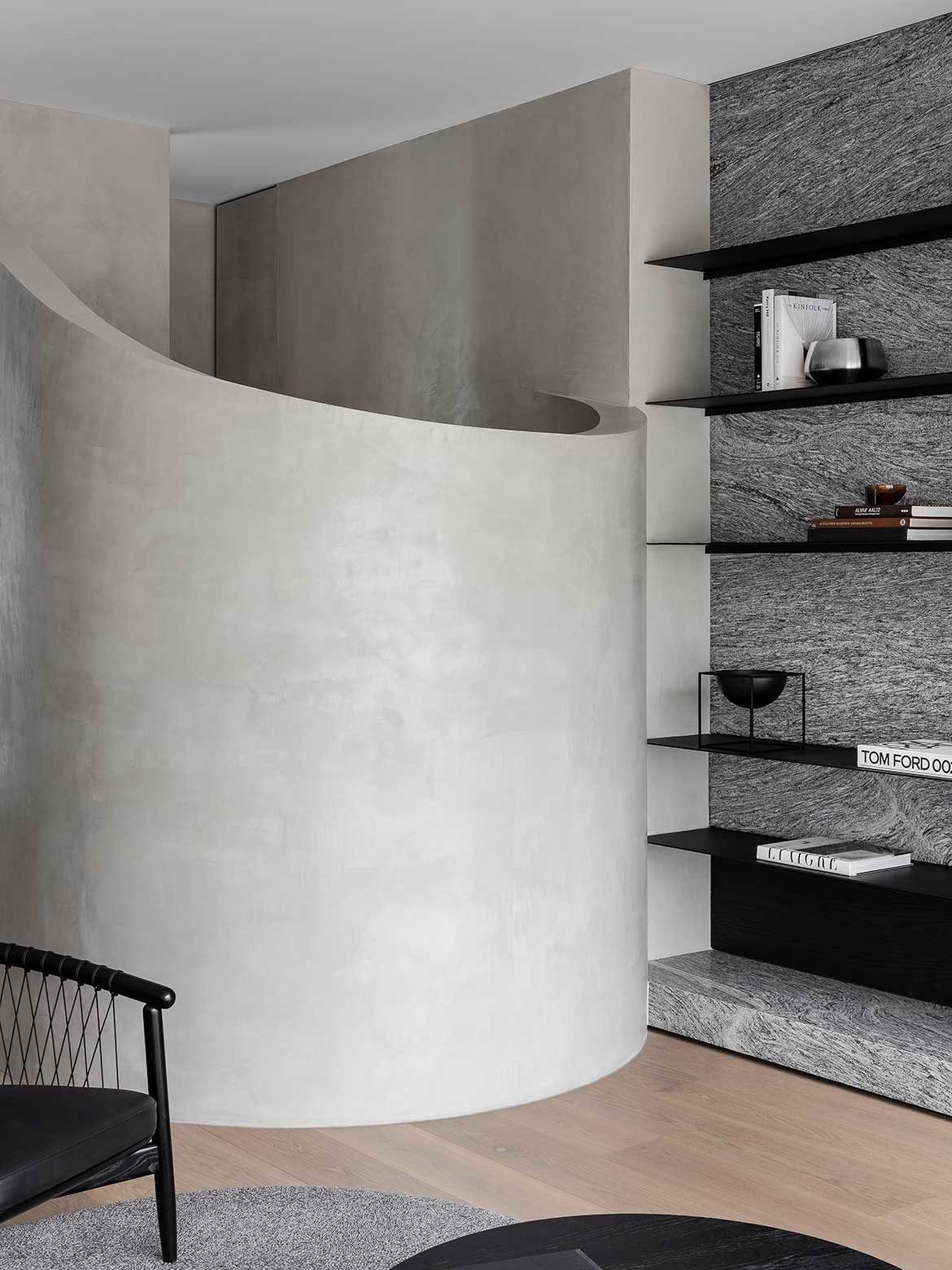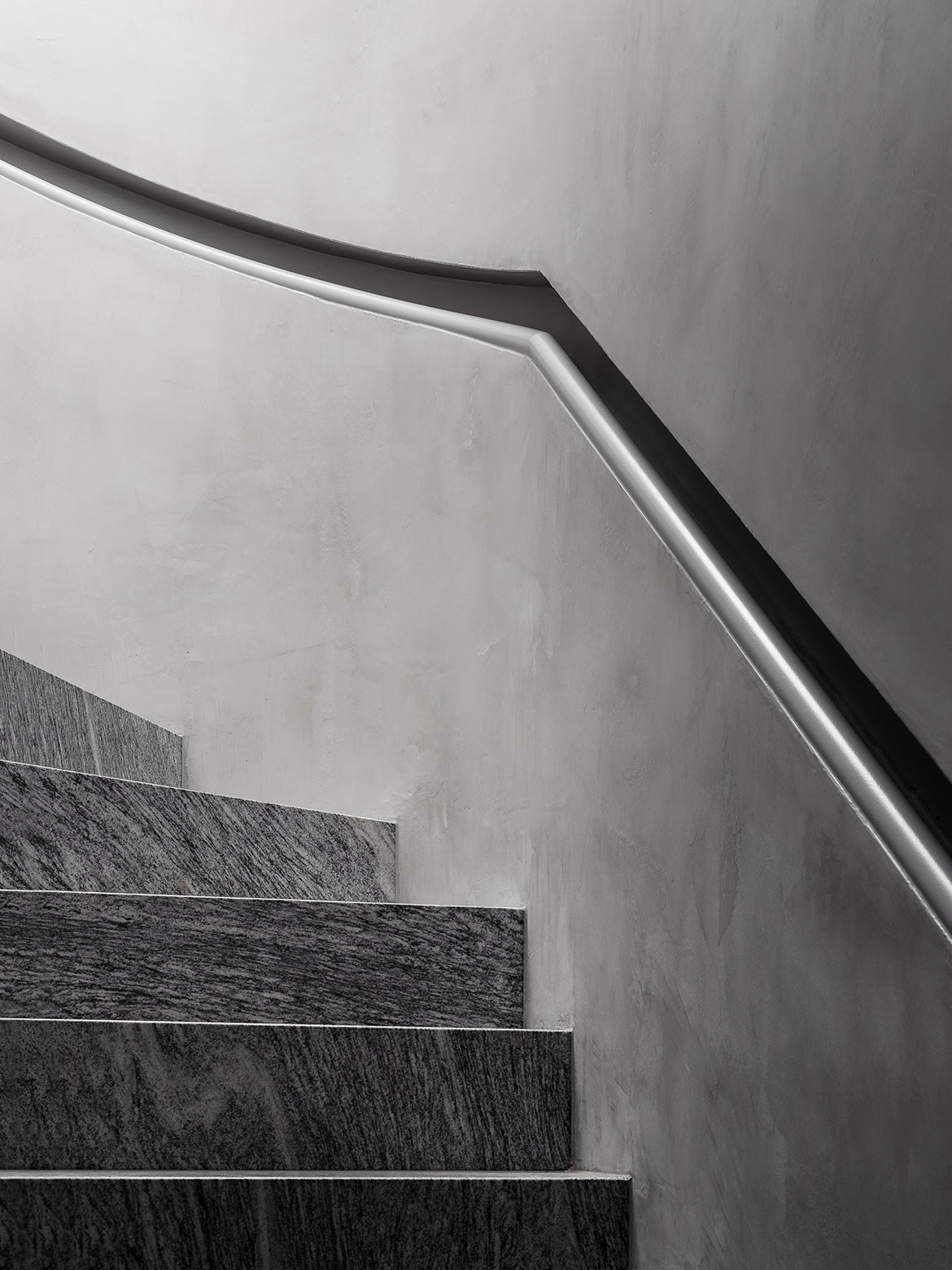 Lane also used the same stone for the stairs well: “We intentionally worked closely with artedomus, to bring that same stone down the staircase to the basement, all the grain pattern matched to appear like it was cut out of one block” It, moreover, makes for a fabulous visual dialogue with the adjacent stair surround, which was cut to suit the room as the house was built: “We literally sliced and created the staircase form and cutout on site and then finished and softened it with a beautiful concrete render” says Lane.