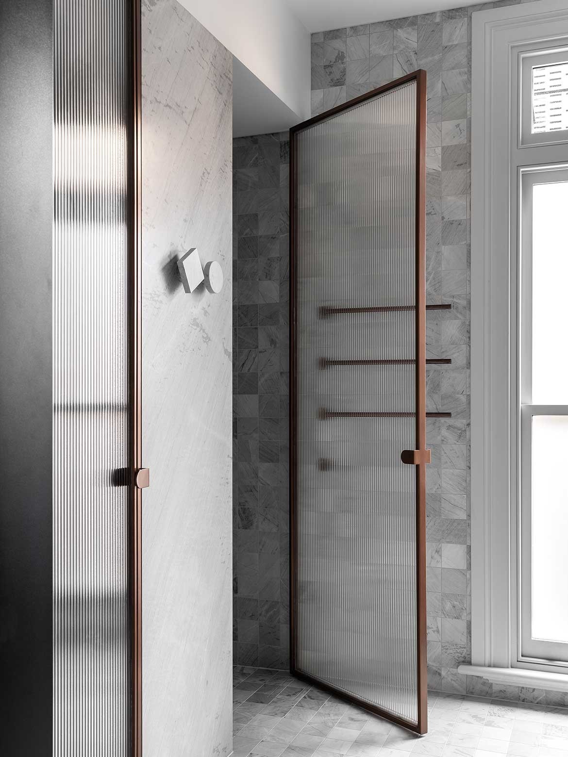 “I think the clients always just thought the basement was the entry from the car lift and where the laundry hides. We convinced them that the powder room although small could be a real statement, a ‘wow factor’. I love an interior that is unexpected to the design language,” says Lane, who used moody darkened glass and explored three finishes to deliver an exceptional room of stone, mirror and bronze.