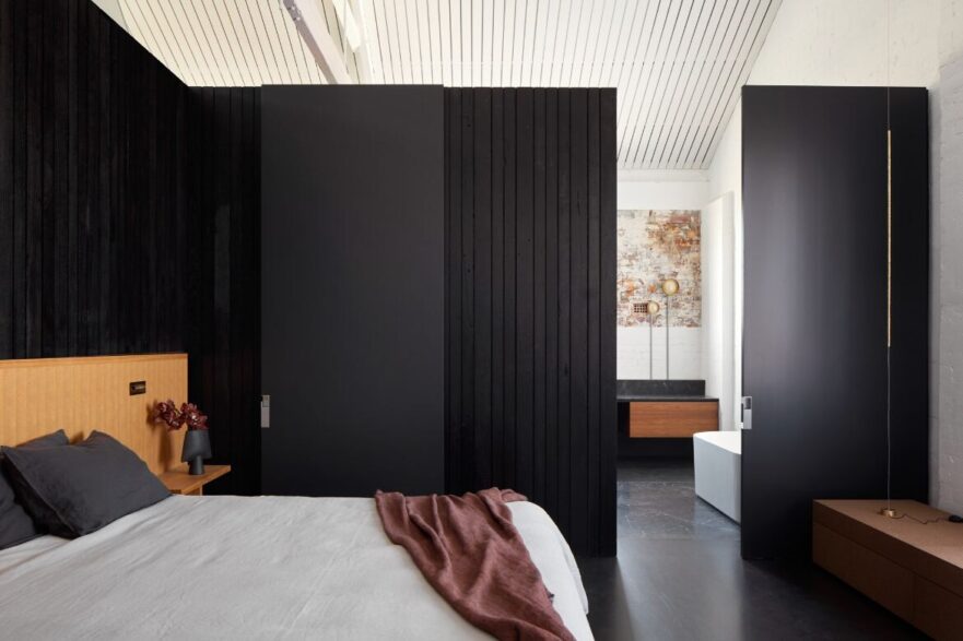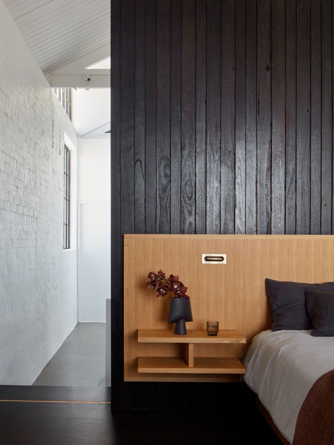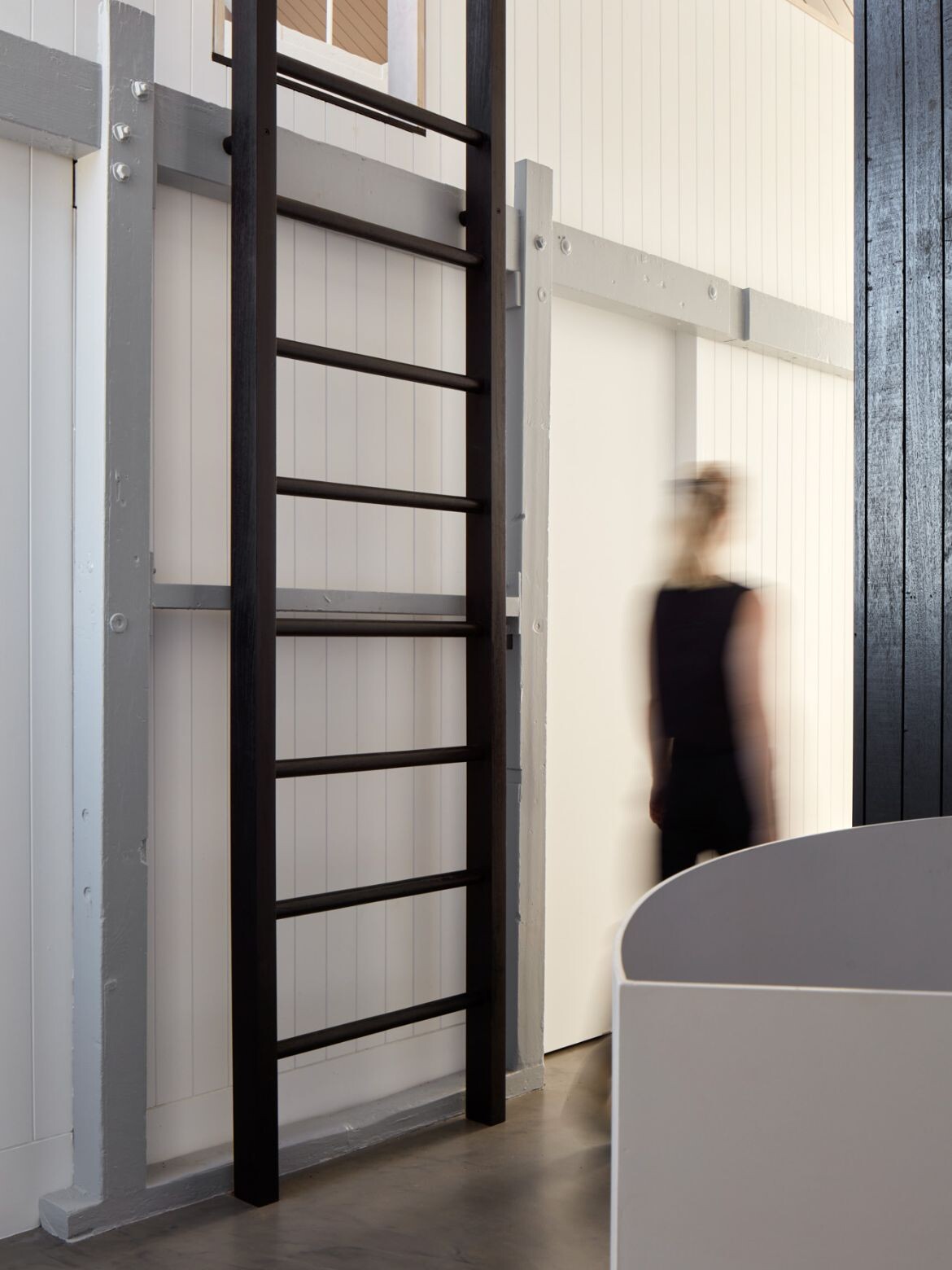 Utilising both the horizontal and vertical planes that an industrial building can afford, the lower level is where life is acted out. “The ground floor is organised around a linear core that consolidates all of the services. There’s a kitchen, pantry, laundry, powder room, and all of the vertical plumbing and electrical are centralised into this core,” explains Walker.