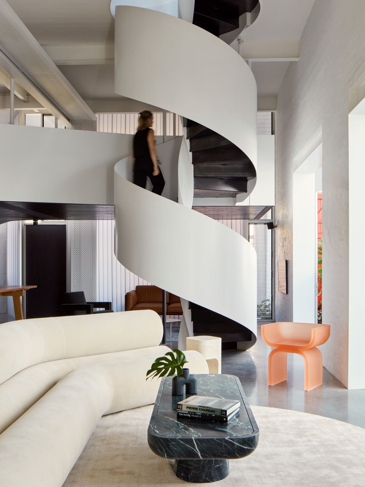 Fine tuning the exact positioning of the core and mezzanine was dictated by the vertical element of the stair. This is where the spatial organisation was critical. With limited options for where to locate the stair due to structural elements holding up the floor, the team had to map the best spot. “The first floor planning was key in how we could get all the vertical services down in the most seamless way possible. Then the stair is a big, dramatic, sculptural focal point,” says Walker.